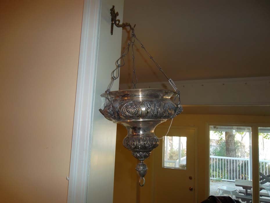 Canadian silver (oil burning) Sanctuary Lamp. Cone shaped with angel head fittings. 11" in outside diameter.