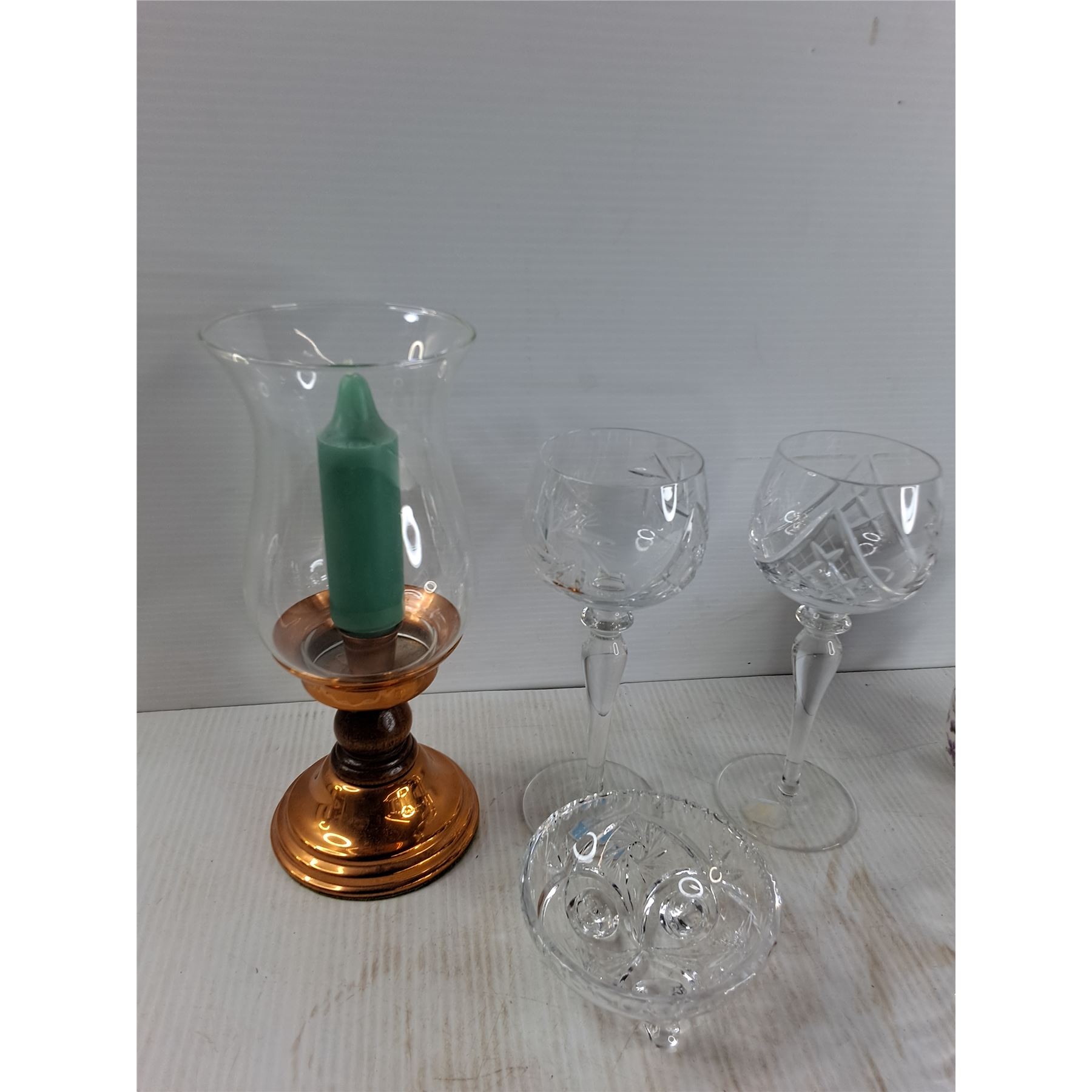 Candle Holder, (2) Crystal Glasses, Candy Dish, Misc