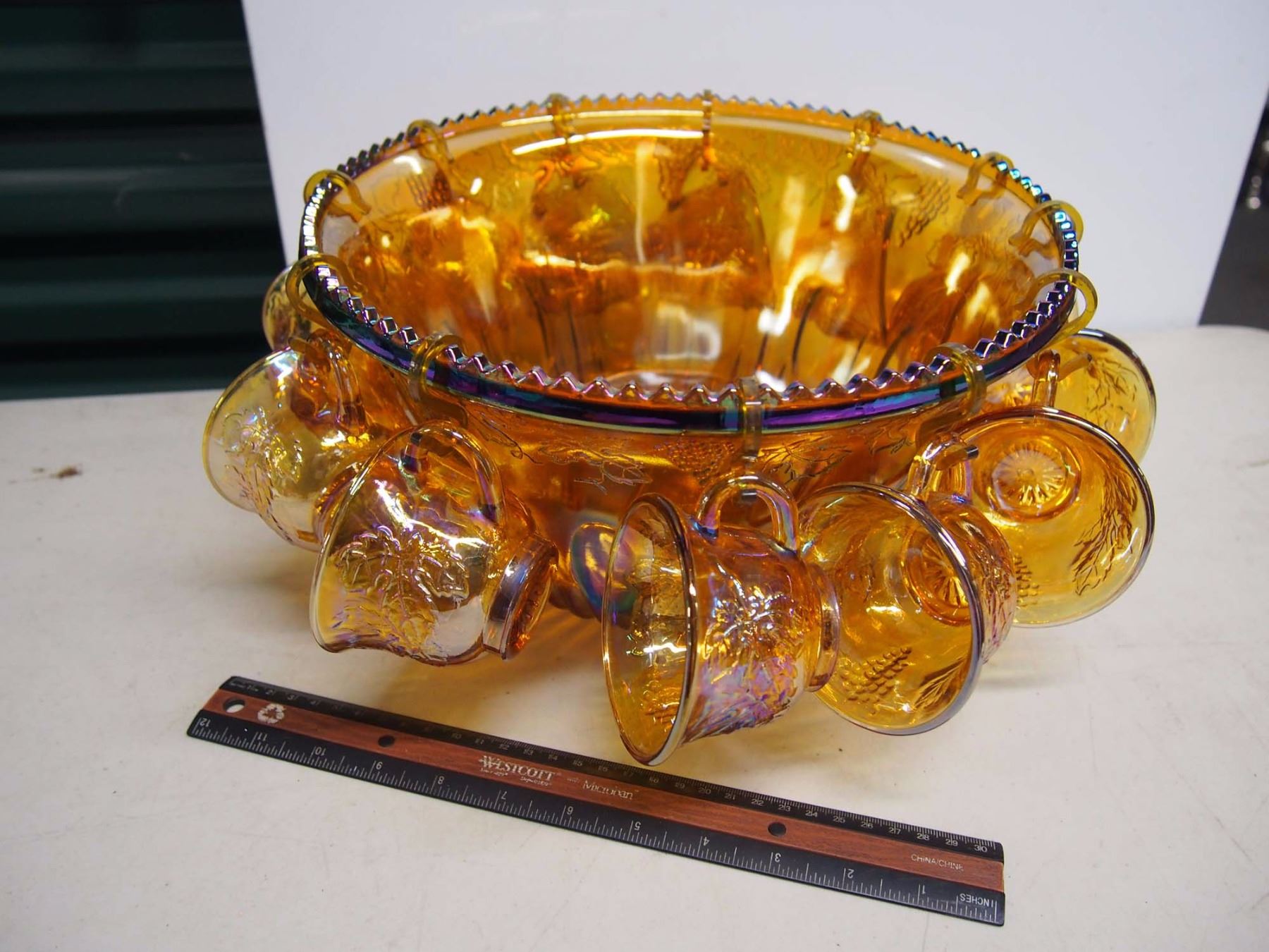 Carnival Glass Marigold Punch Bowl Set, No Chips Or Cracks (12 Cups)
