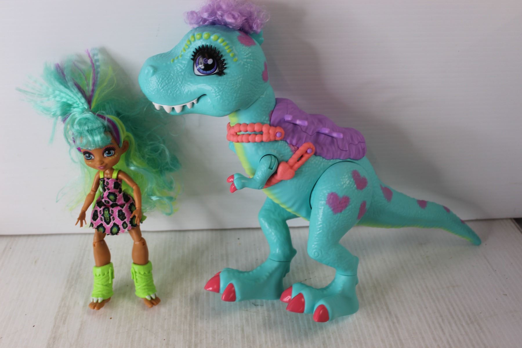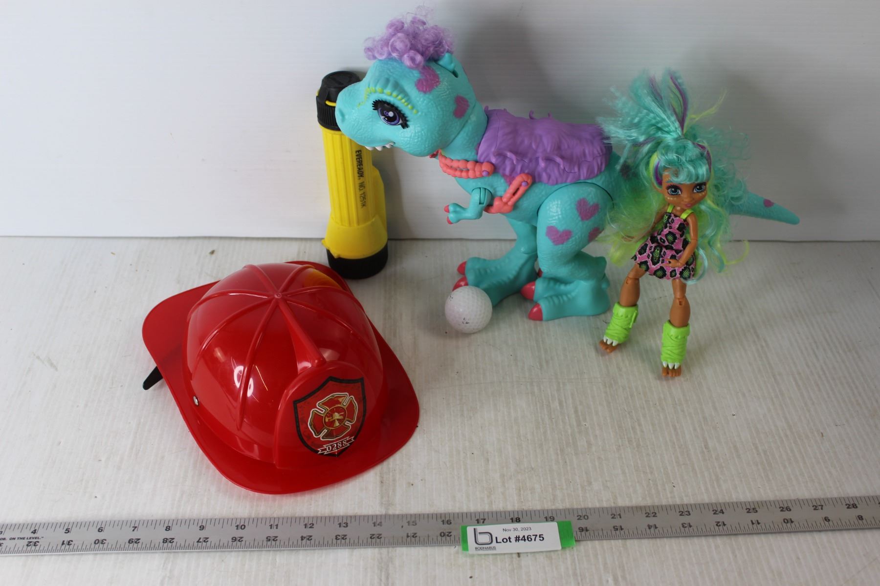 Cave Club Rockelle Doll & Tyrannosaurus Figures, Toy Fire Helmet, Flashlight, Golf Ball