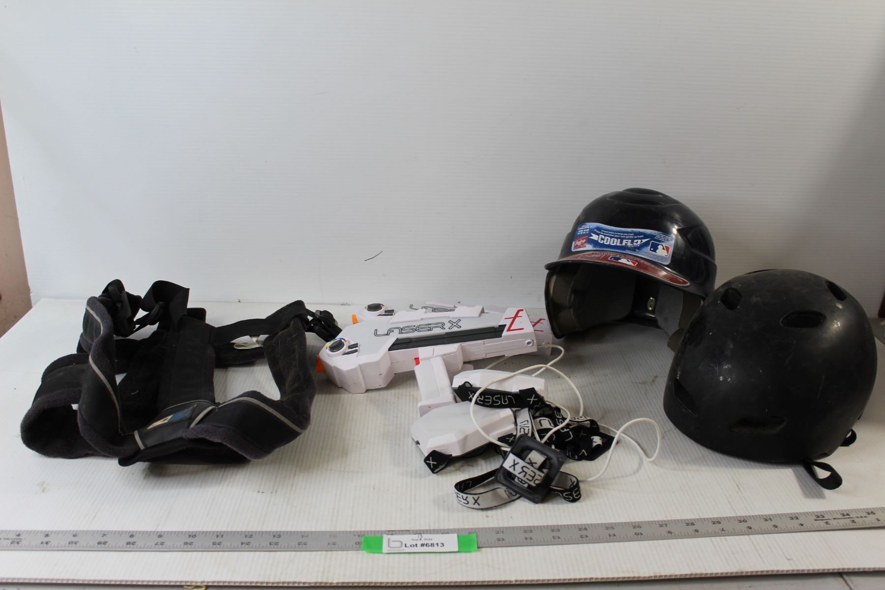Ce Dog Harness, (2) LaserX Laser Tag Guns and Harnesses, Baseball Helmet, Bike Helmet