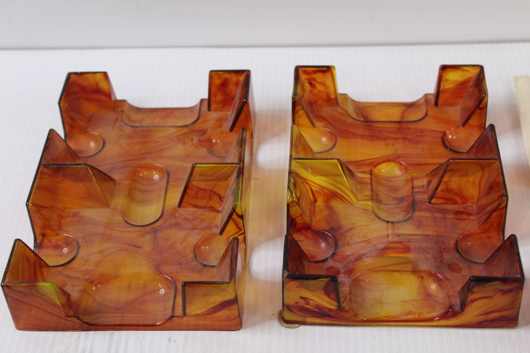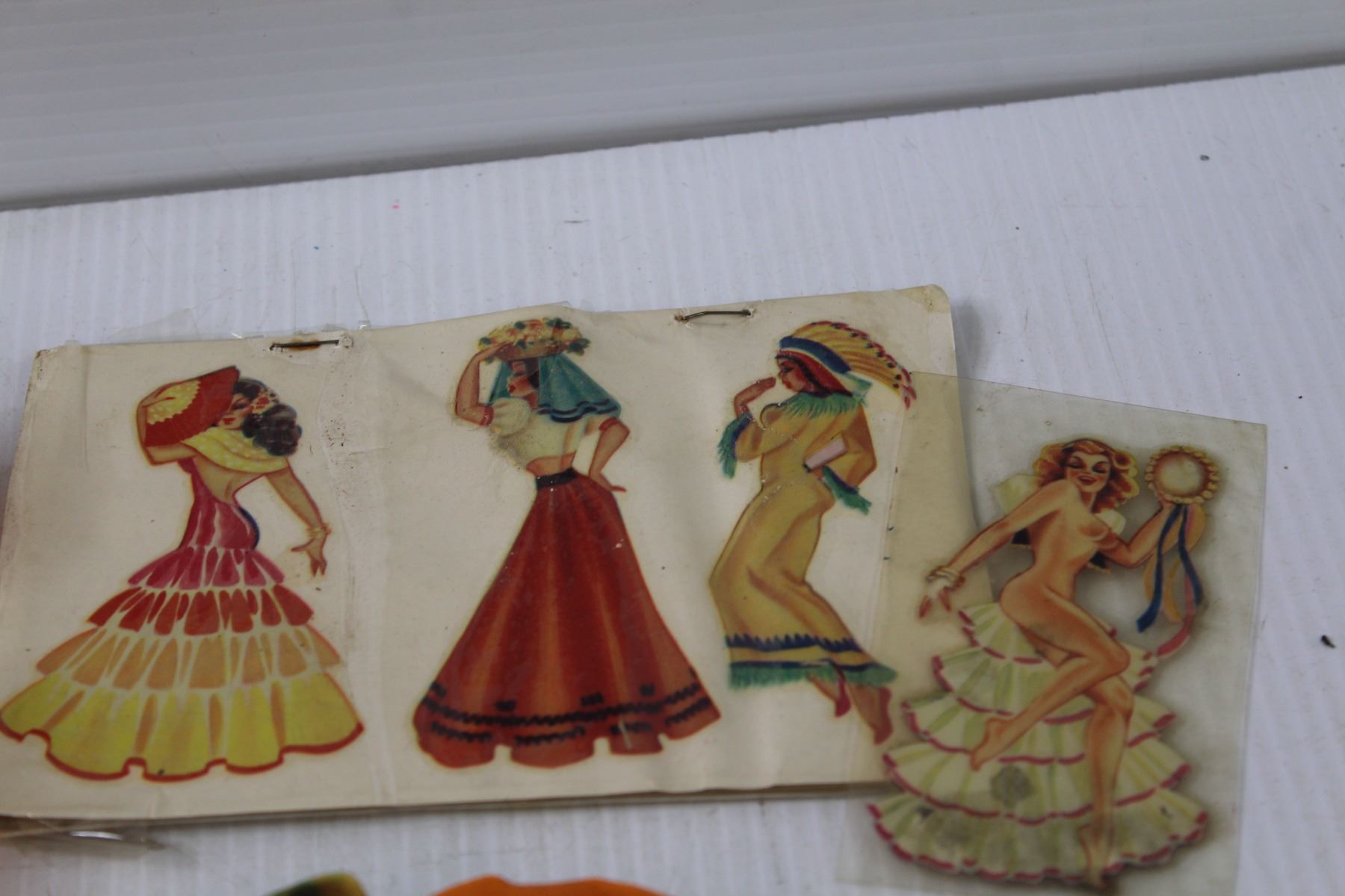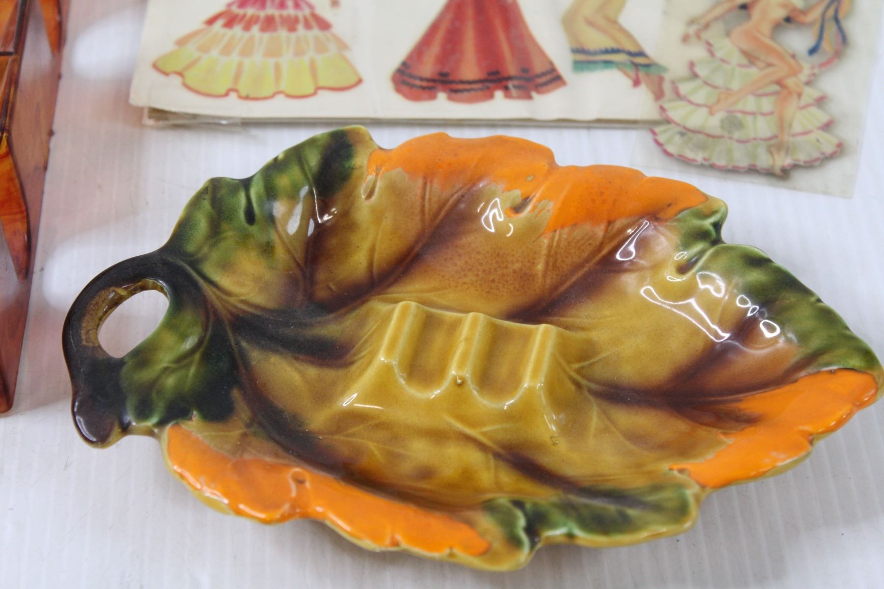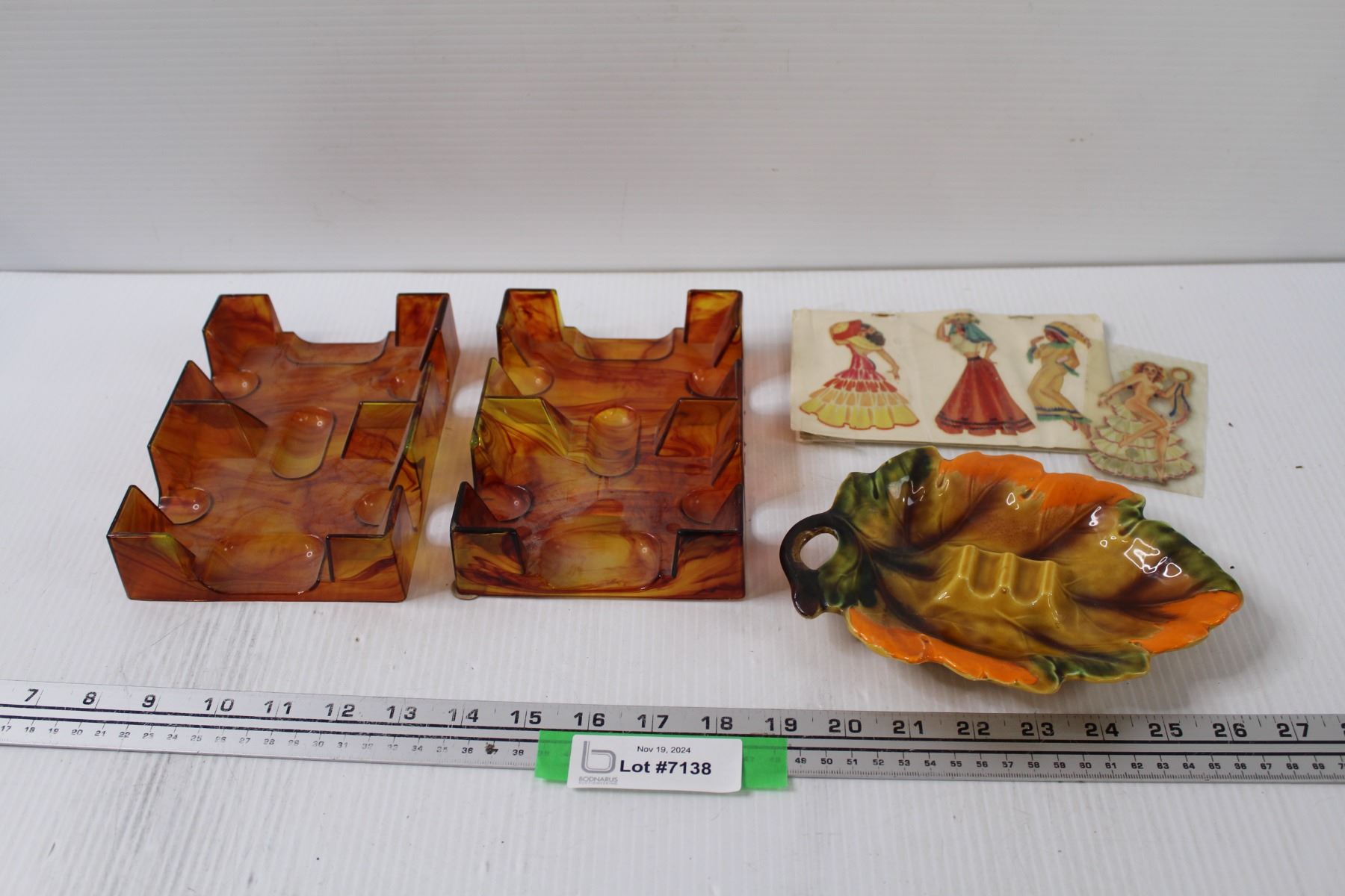 Ceramic Leaf Ashtray, (2) Pin-Up Paper Ladies, (2) Bakelite Card Holders