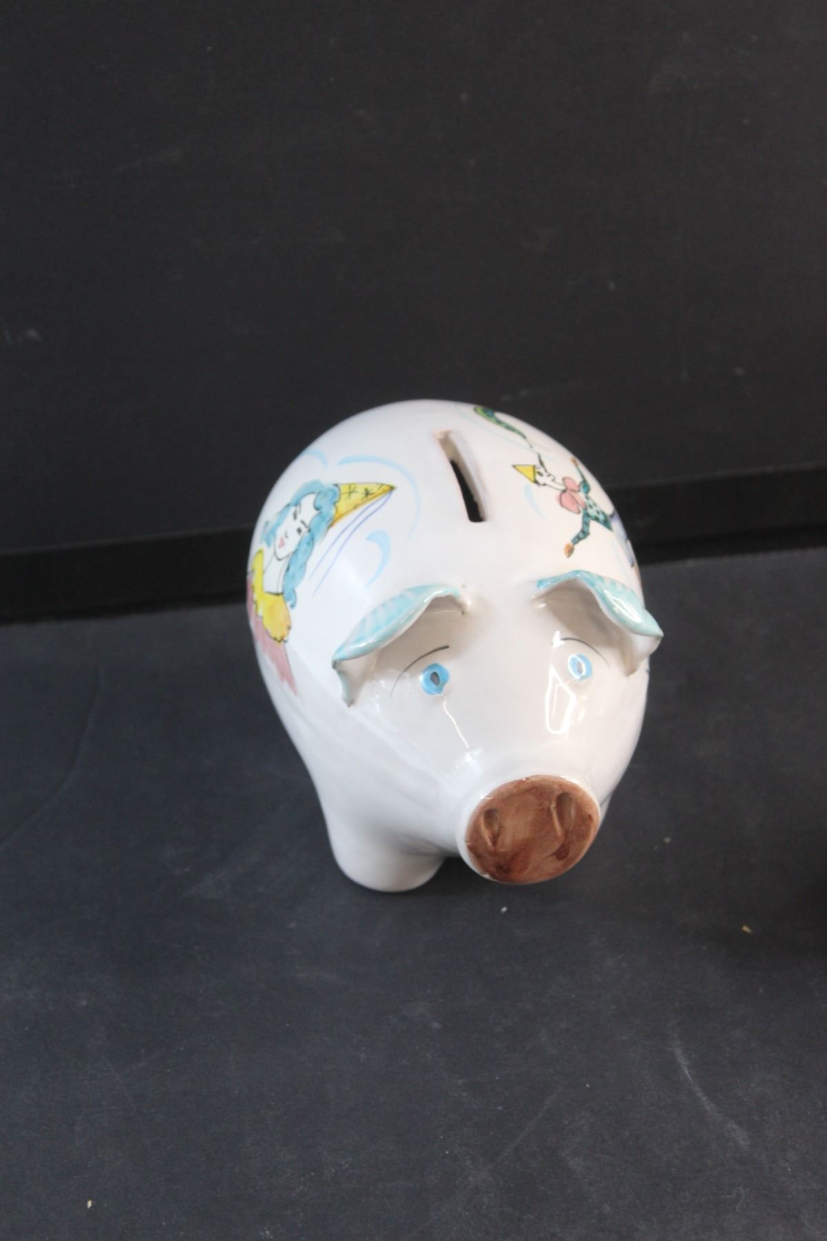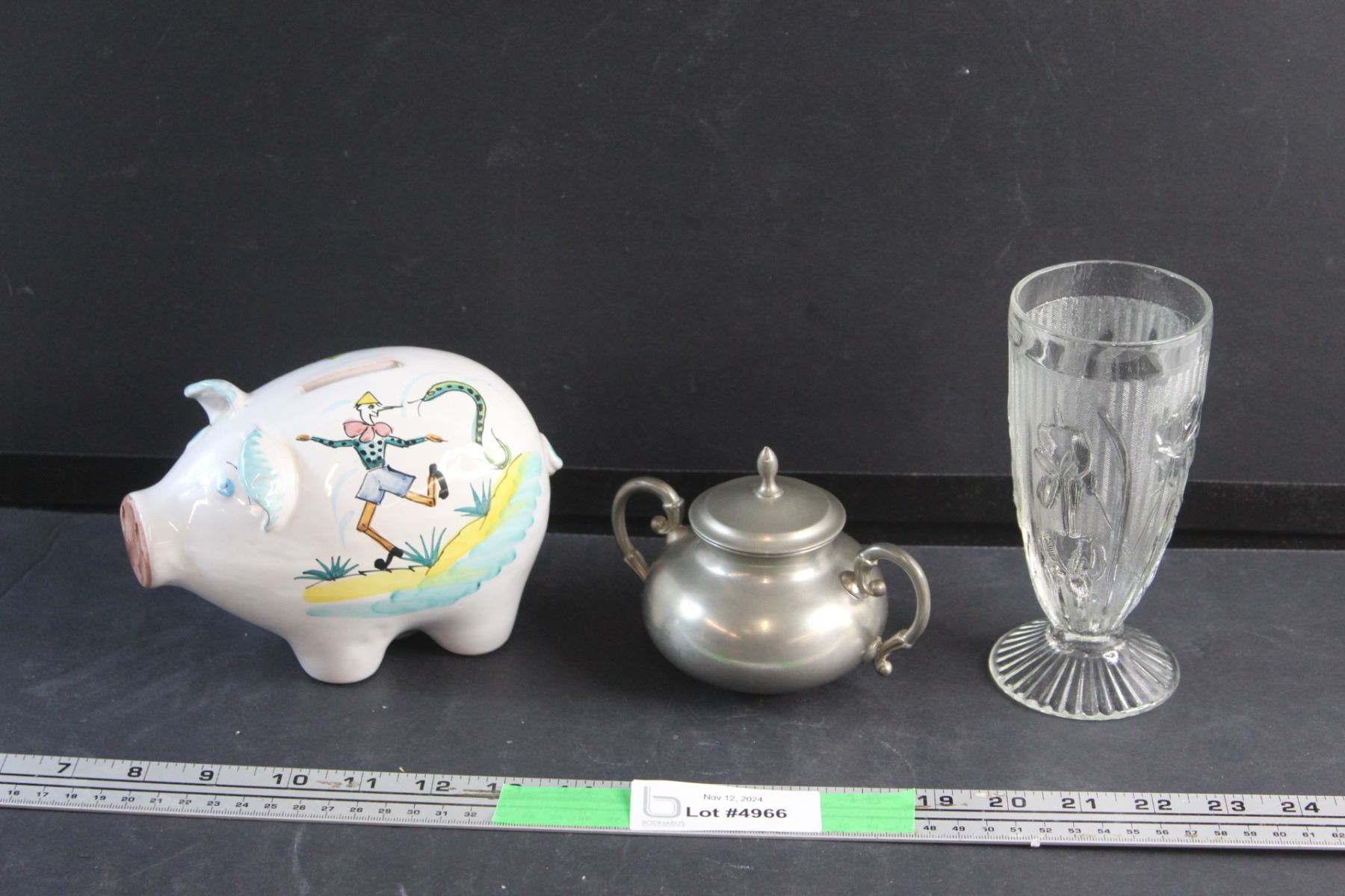 Ceramic Piggy Bank, Iris and Herringbone Vase and a Metal Sugar Bowl with Lid