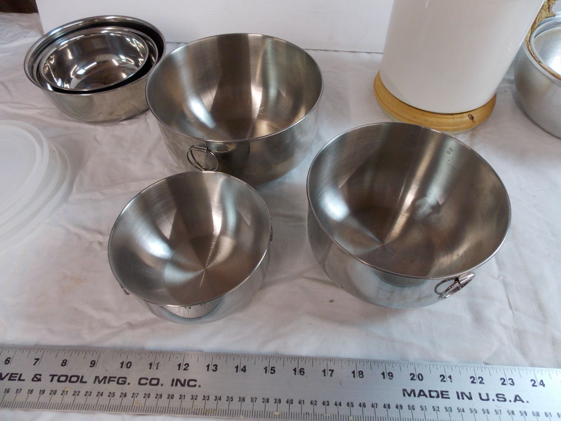 Ceramic Spoon holder + (10) Metal Mixing Bowls - 4 aluminum (appear new) + lazy susan with crock