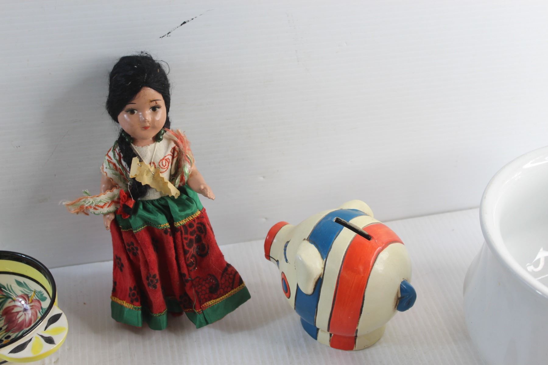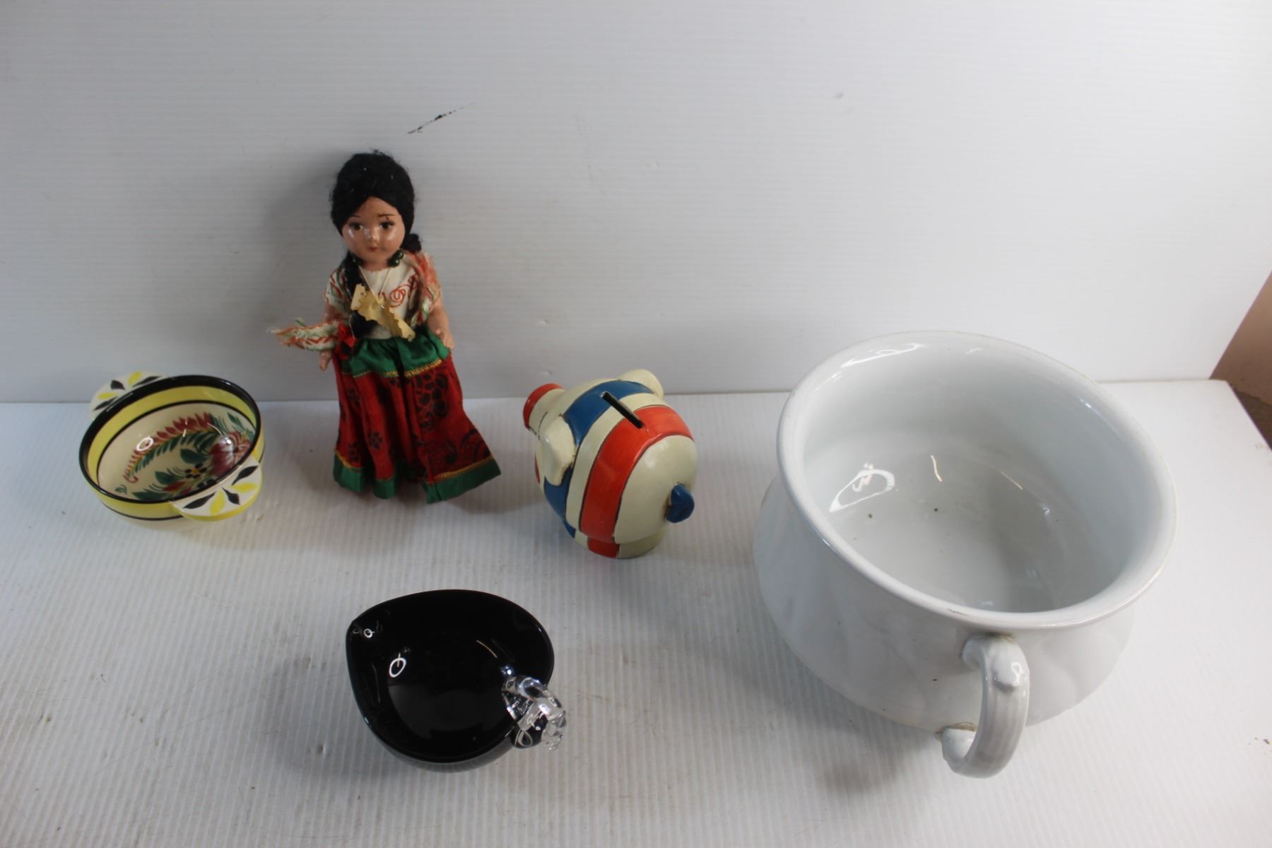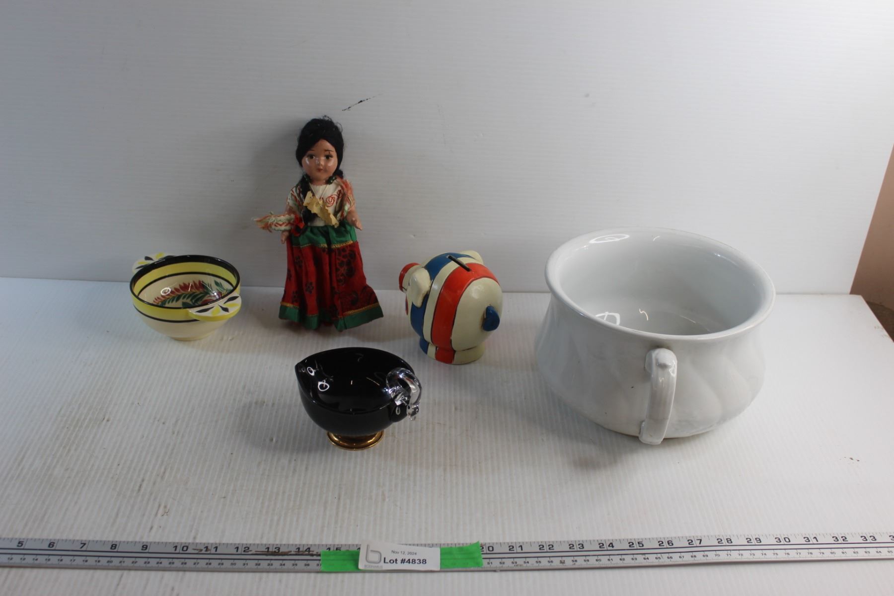 Chamber Pot, Mexican Doll, Bowl, Gravy Boat and a Piggy Bank