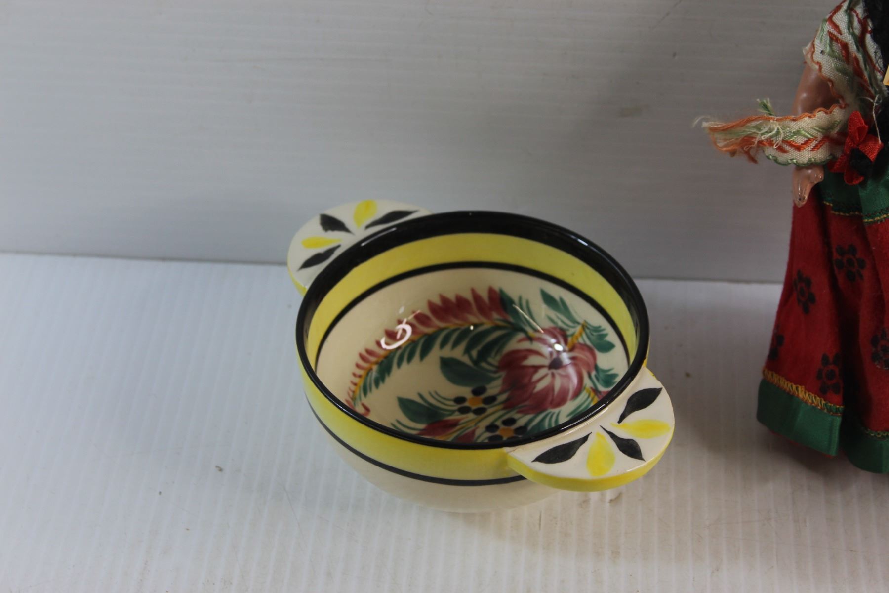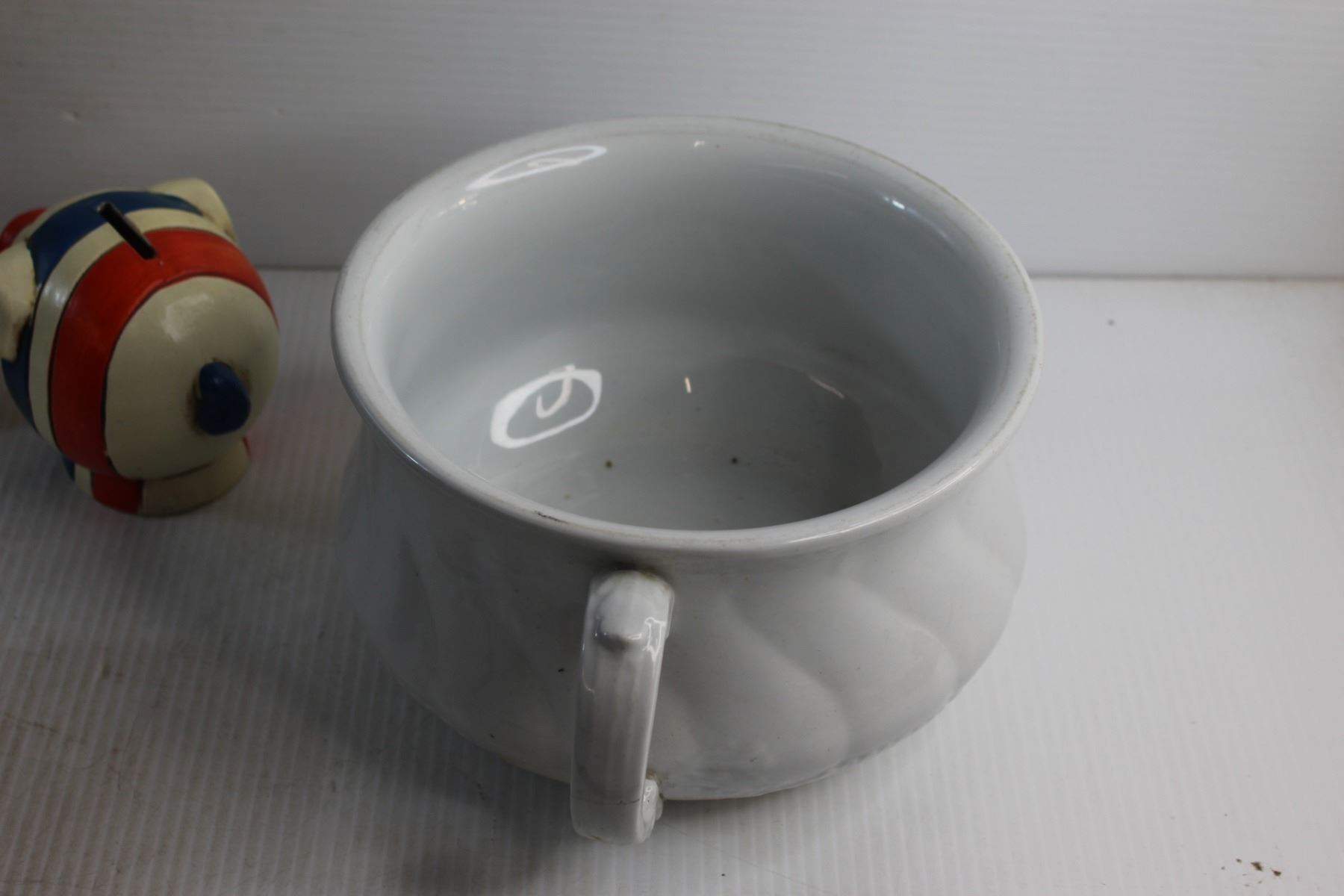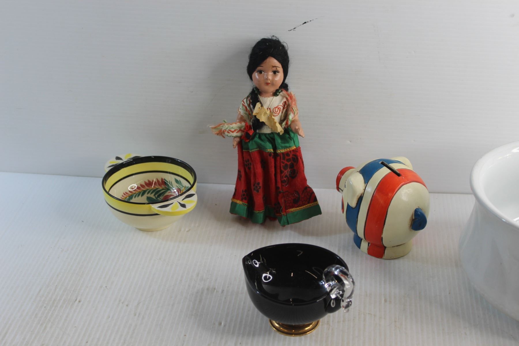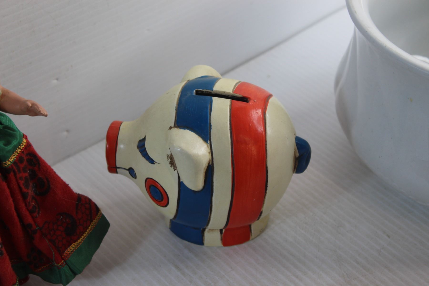 Chamber Pot, Mexican Doll, Bowl, Gravy Boat and a Piggy Bank