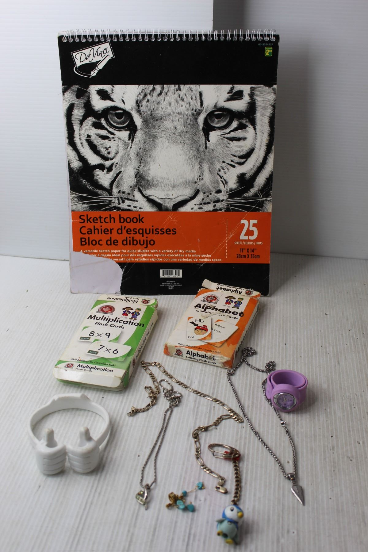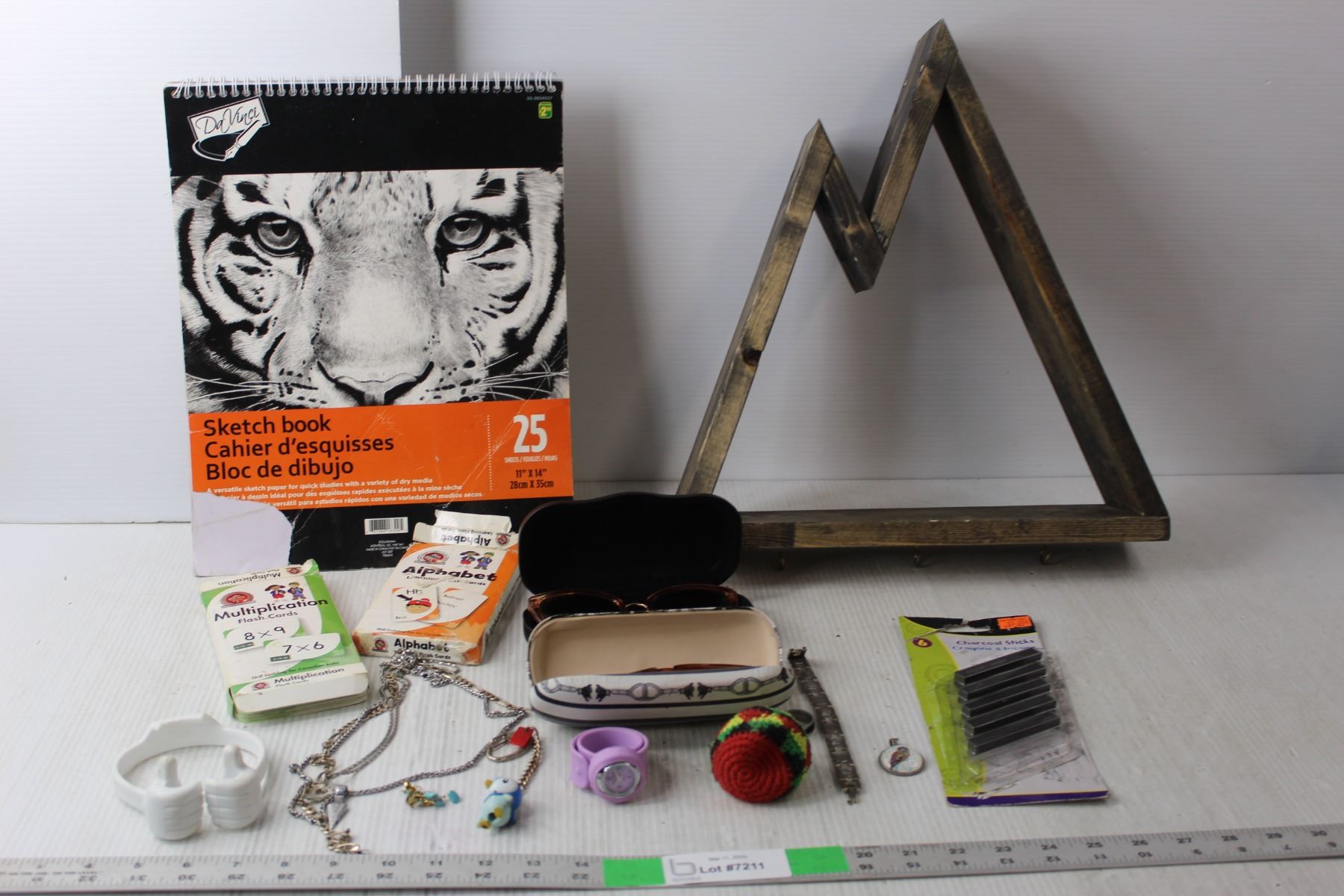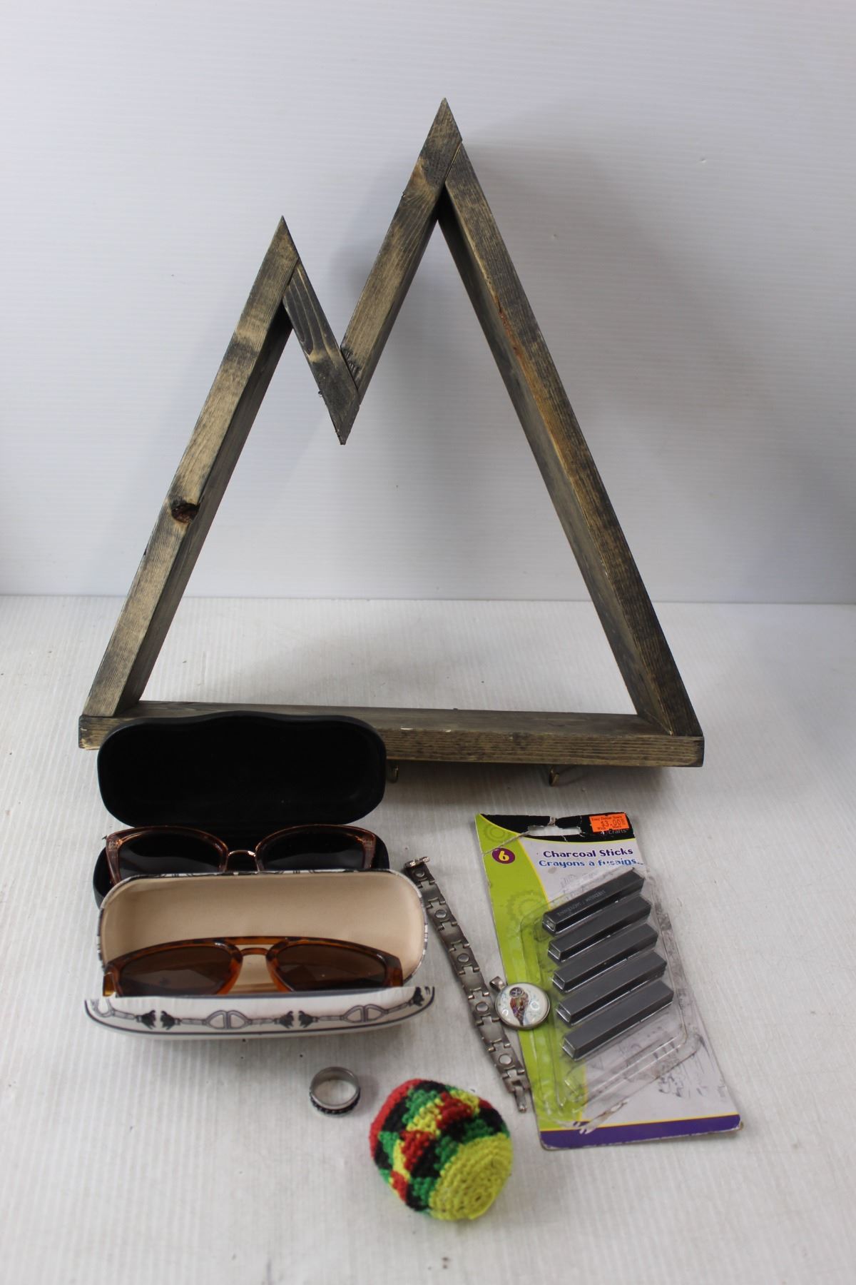 Charcoal Sticks, (2) Sunglasses with Cases, Wood Key Holder 17" Tall, Misc.