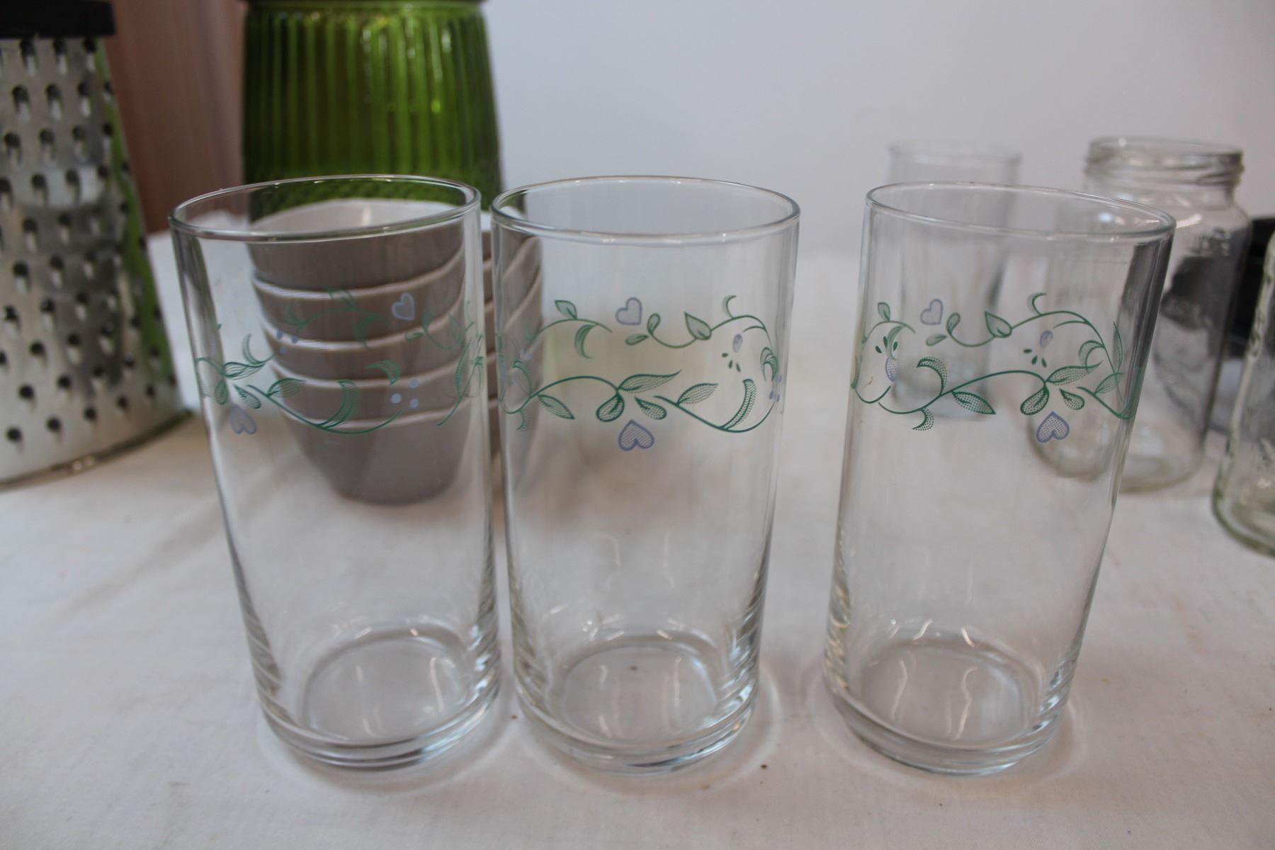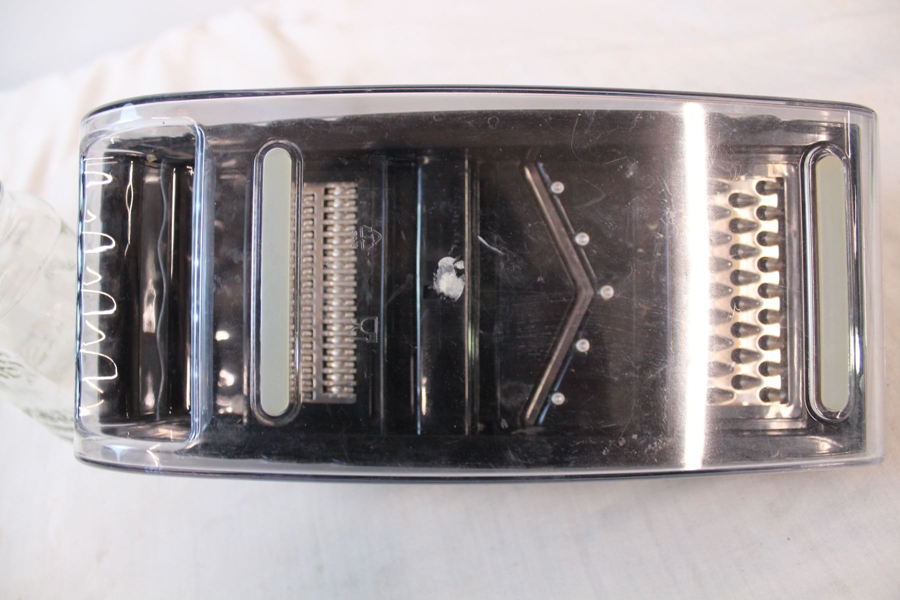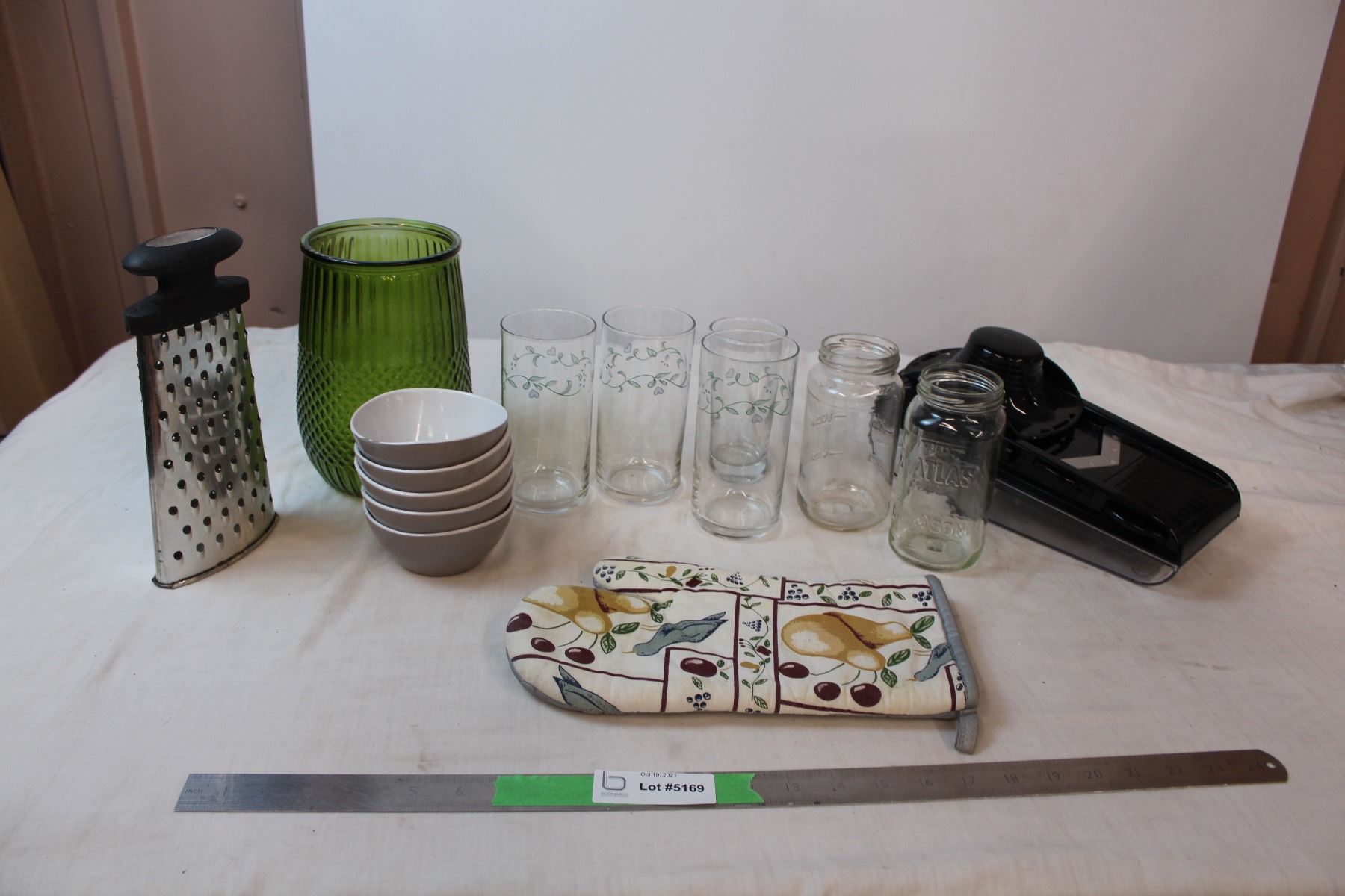 Cheese grated, plastic mandoline, one oven mitt, and misc glassware