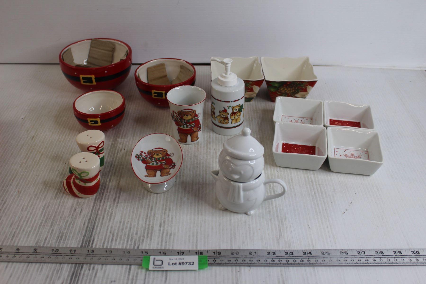 Christmas 3-Piece Santa Bowls, Stocking Salt and Pepper Shakers, Penguin Cream and Sugar Set, Misc.