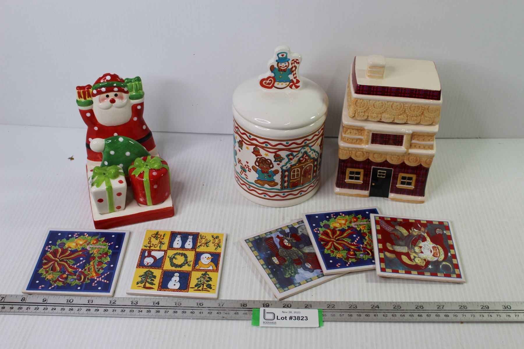 Christmas Decor Items - Tile Coasters - (2) Ceramic Cookie Jars - Ceramic Salt & Pepper Shakers & Napkin Holder