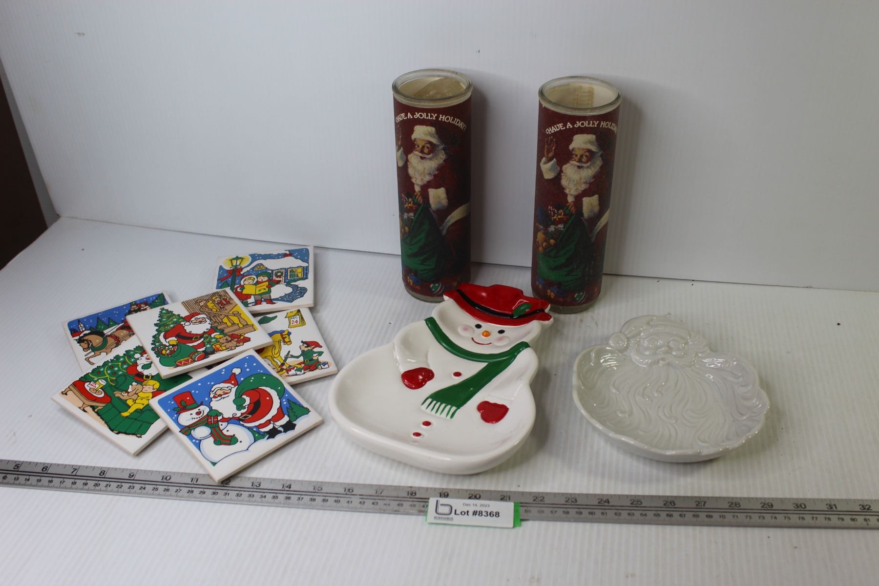 Christmas Items - Tall Glass Candles - Snowman Dish - Santa Face Dish - Tile Coasters