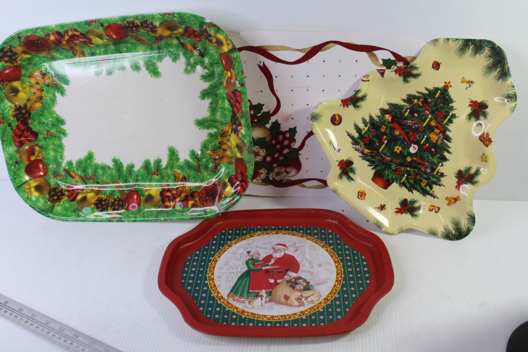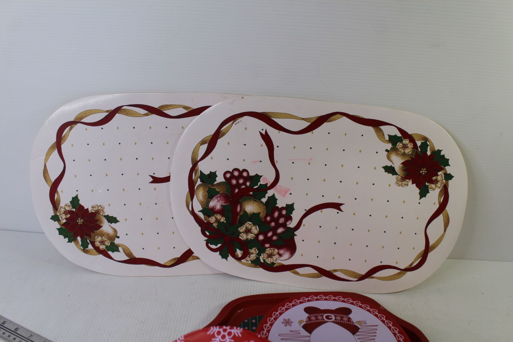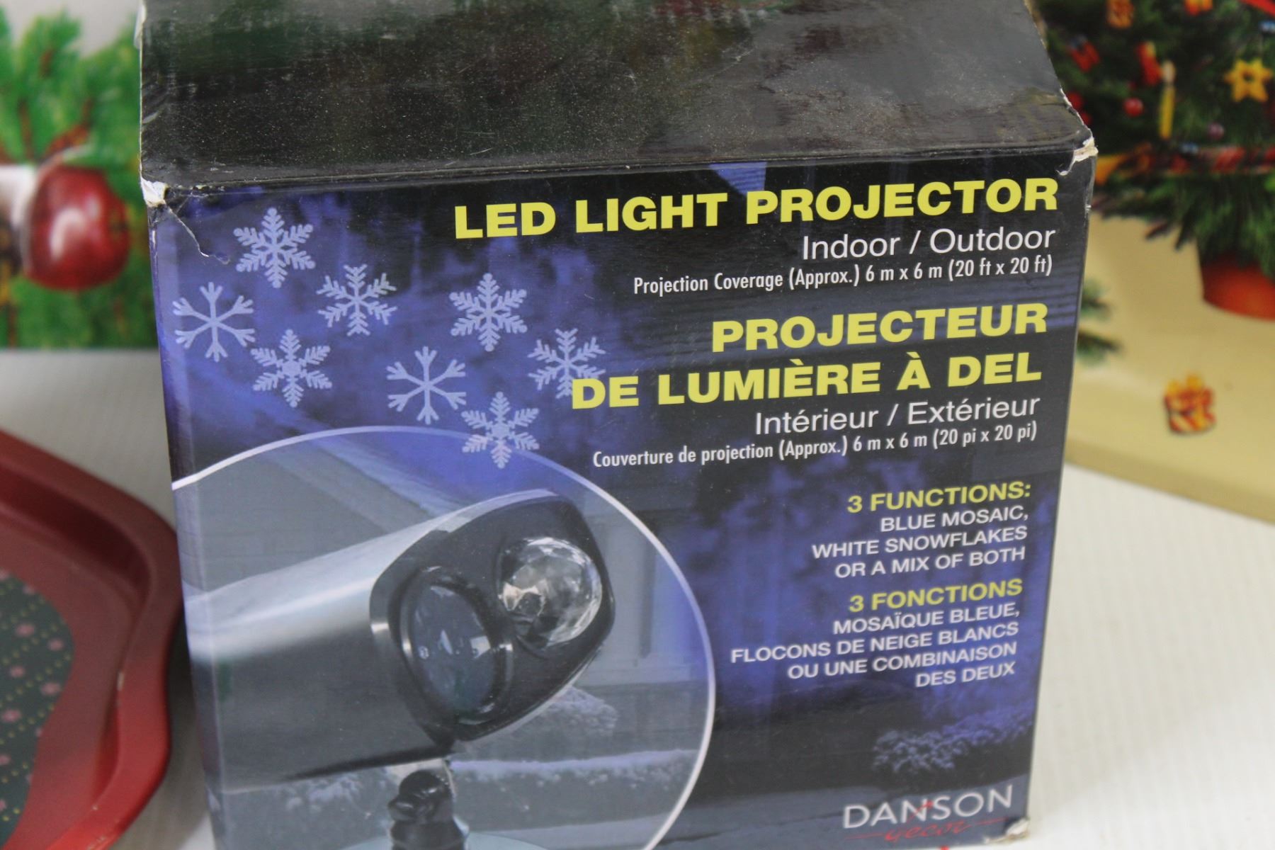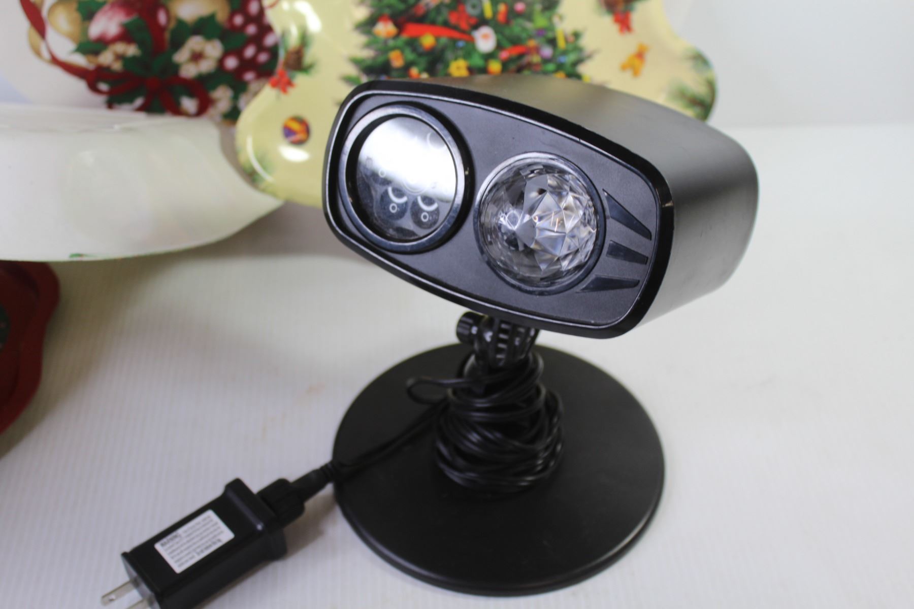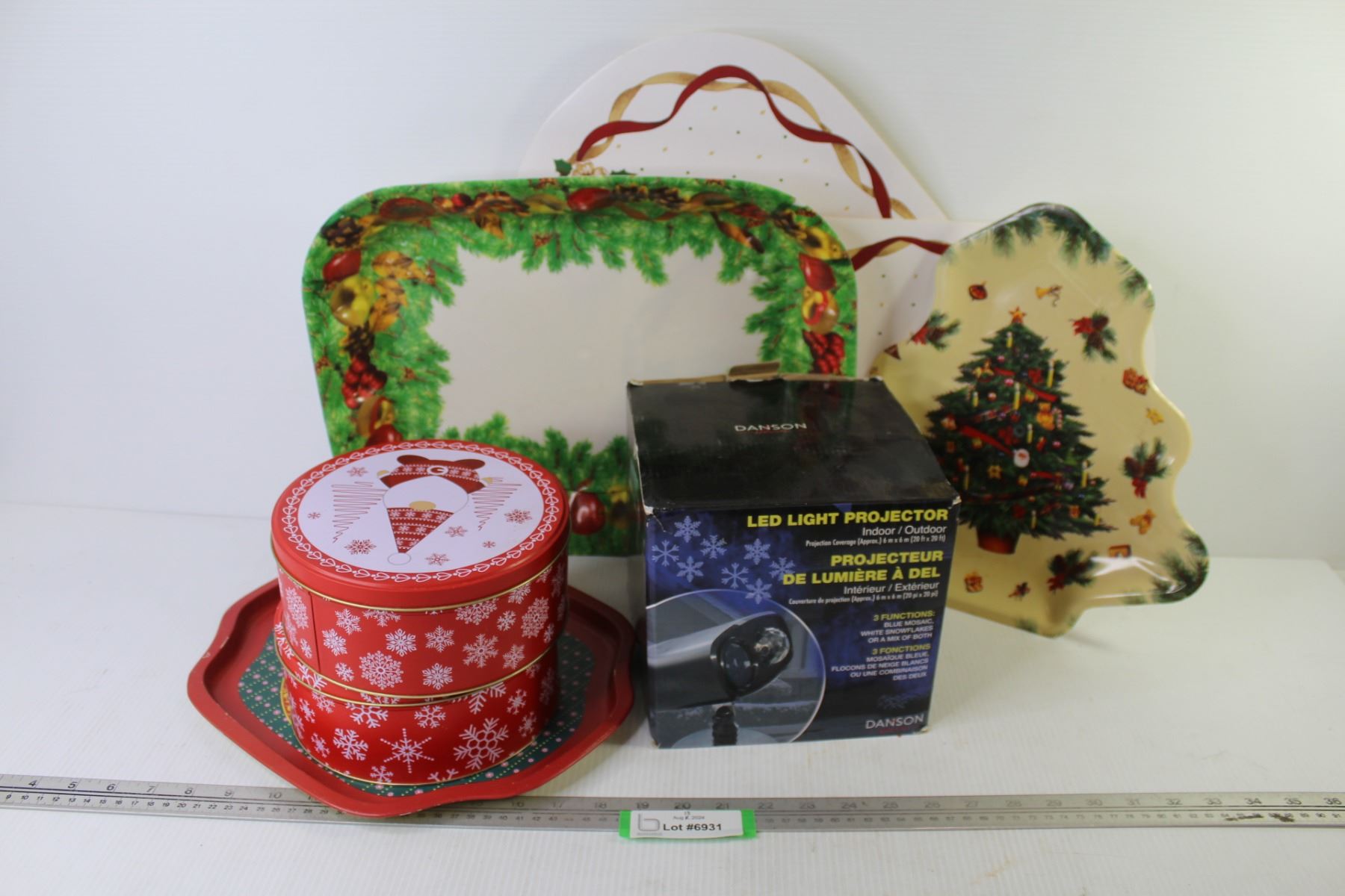 Christmas Items - Trays (one is cracked) - Tins - Placemats - LED Light Projector (wire is frayed - untested)