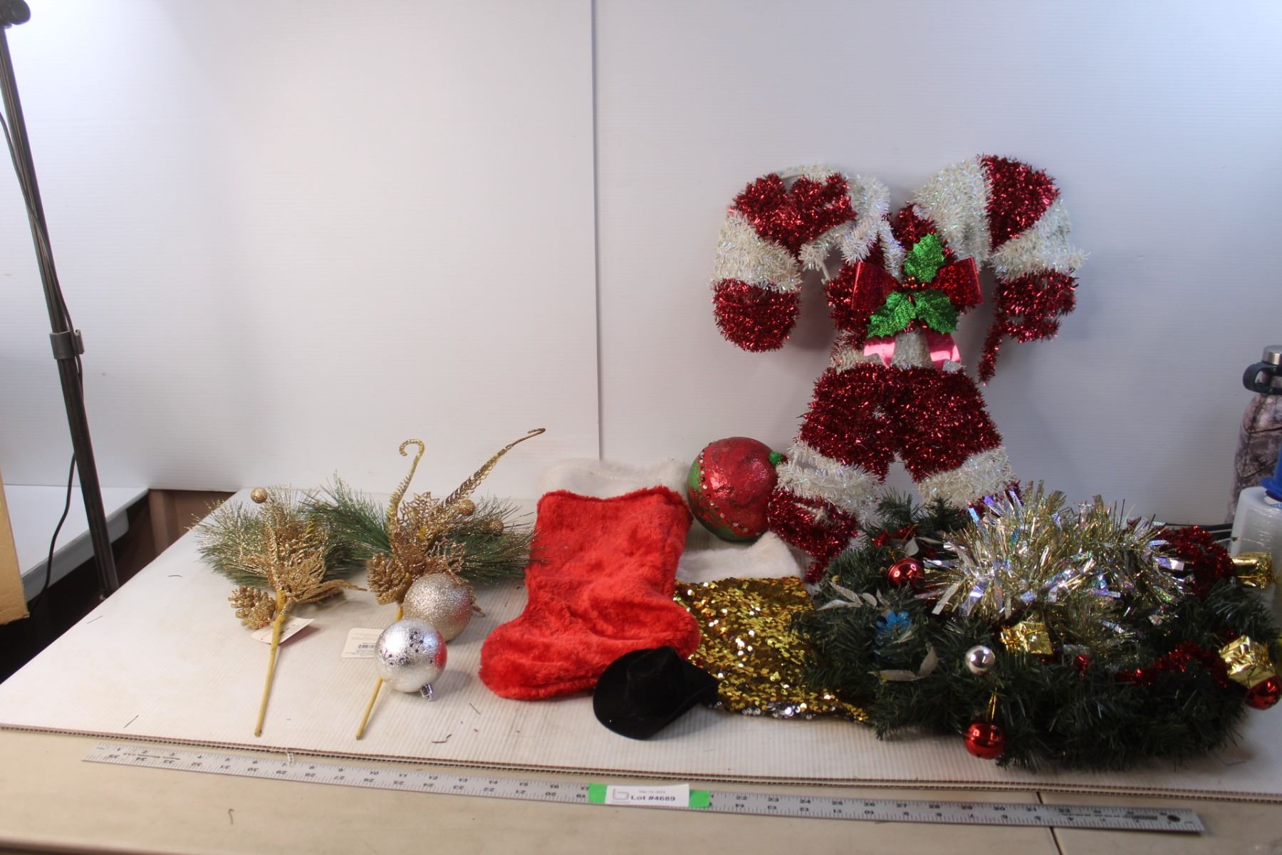 Christmas Lot- Wreath, (2) Stockings, Misc.