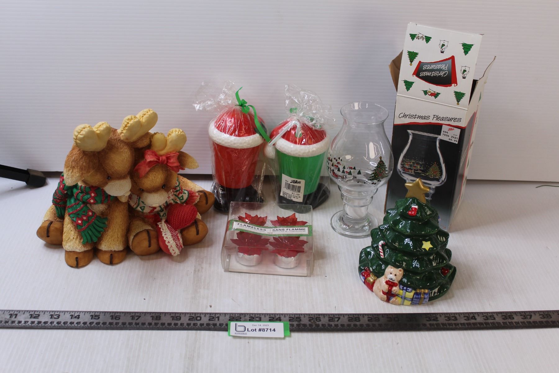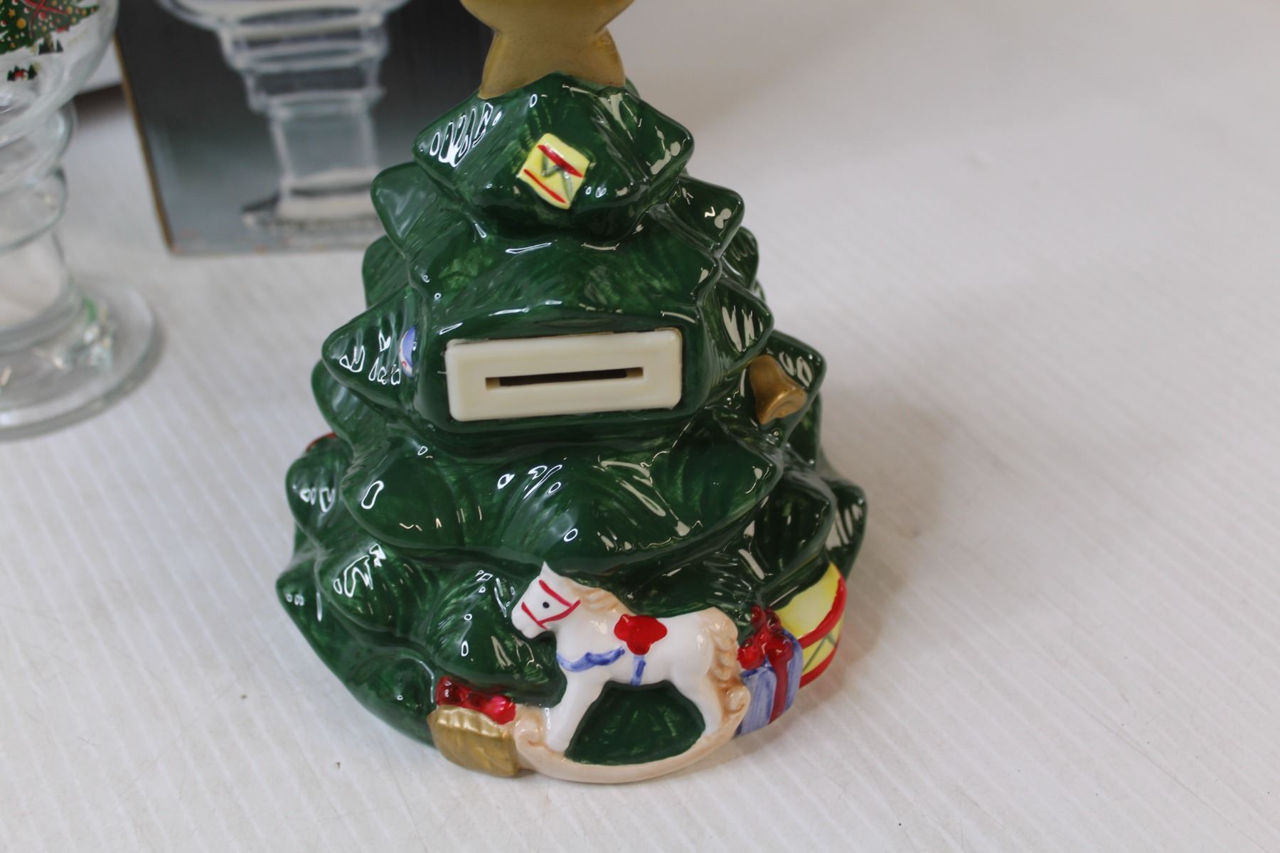 Christmas Tree Money Bank, Flameless Poinsettia Tea Lights, Reindeer Statue, Glass Tealight Lamp