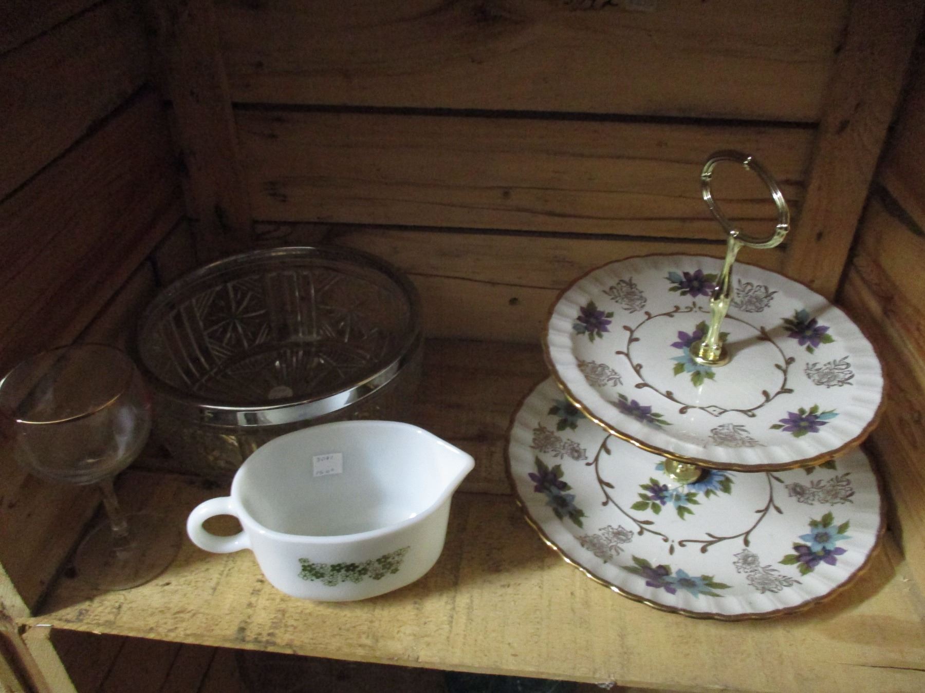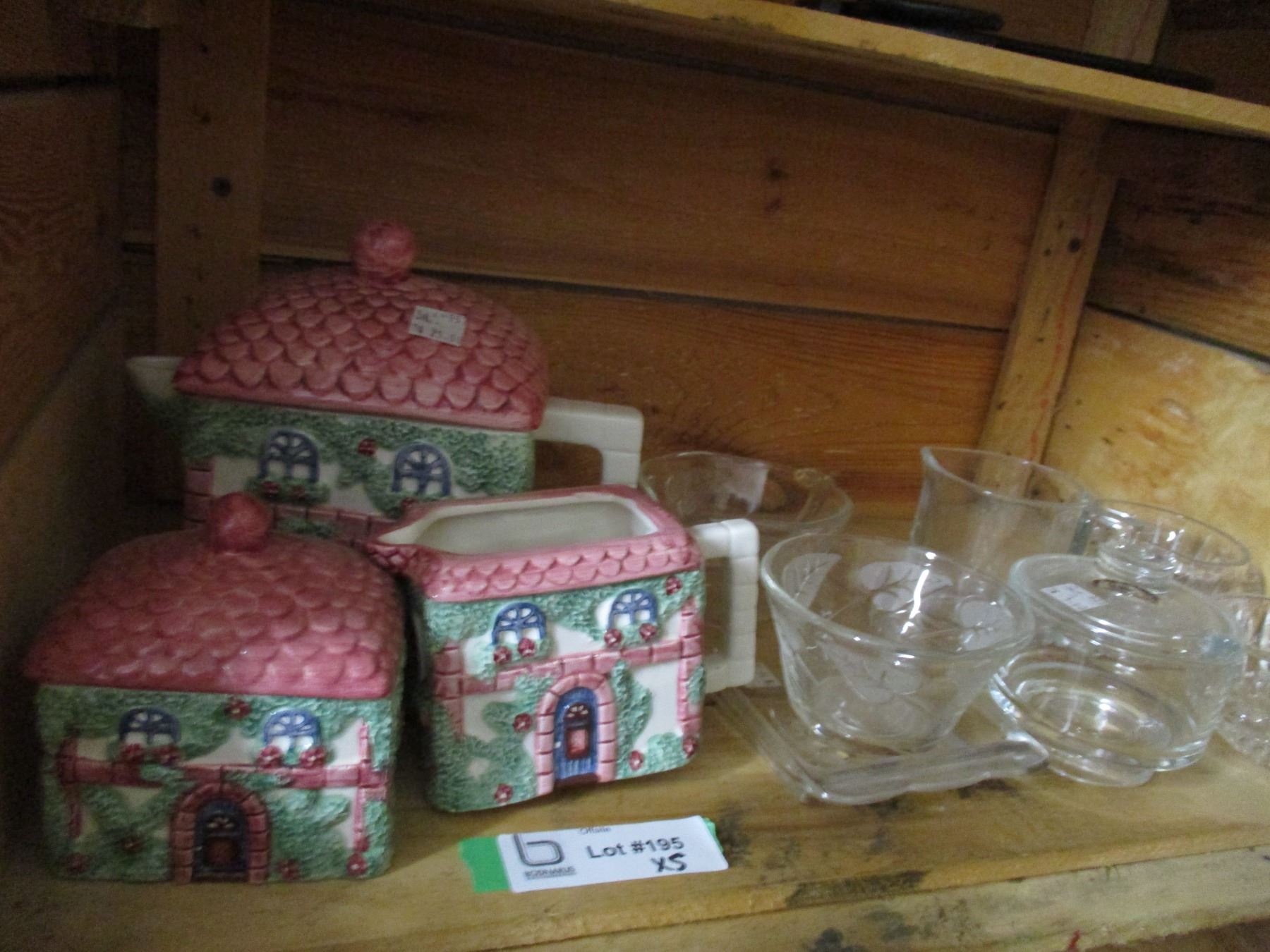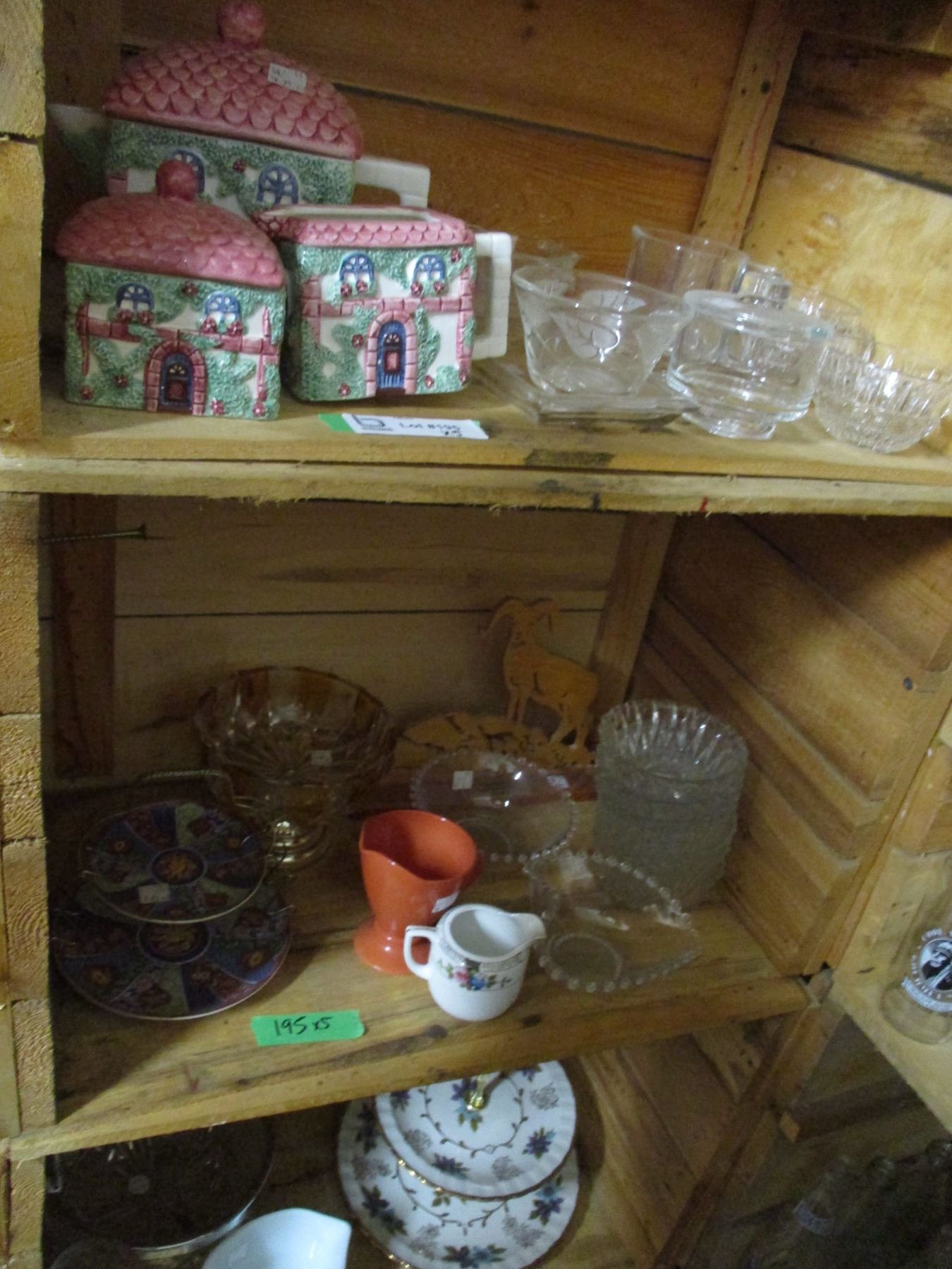 Clear glass bowls, ceramic teapot set + 2-tiered serving trays