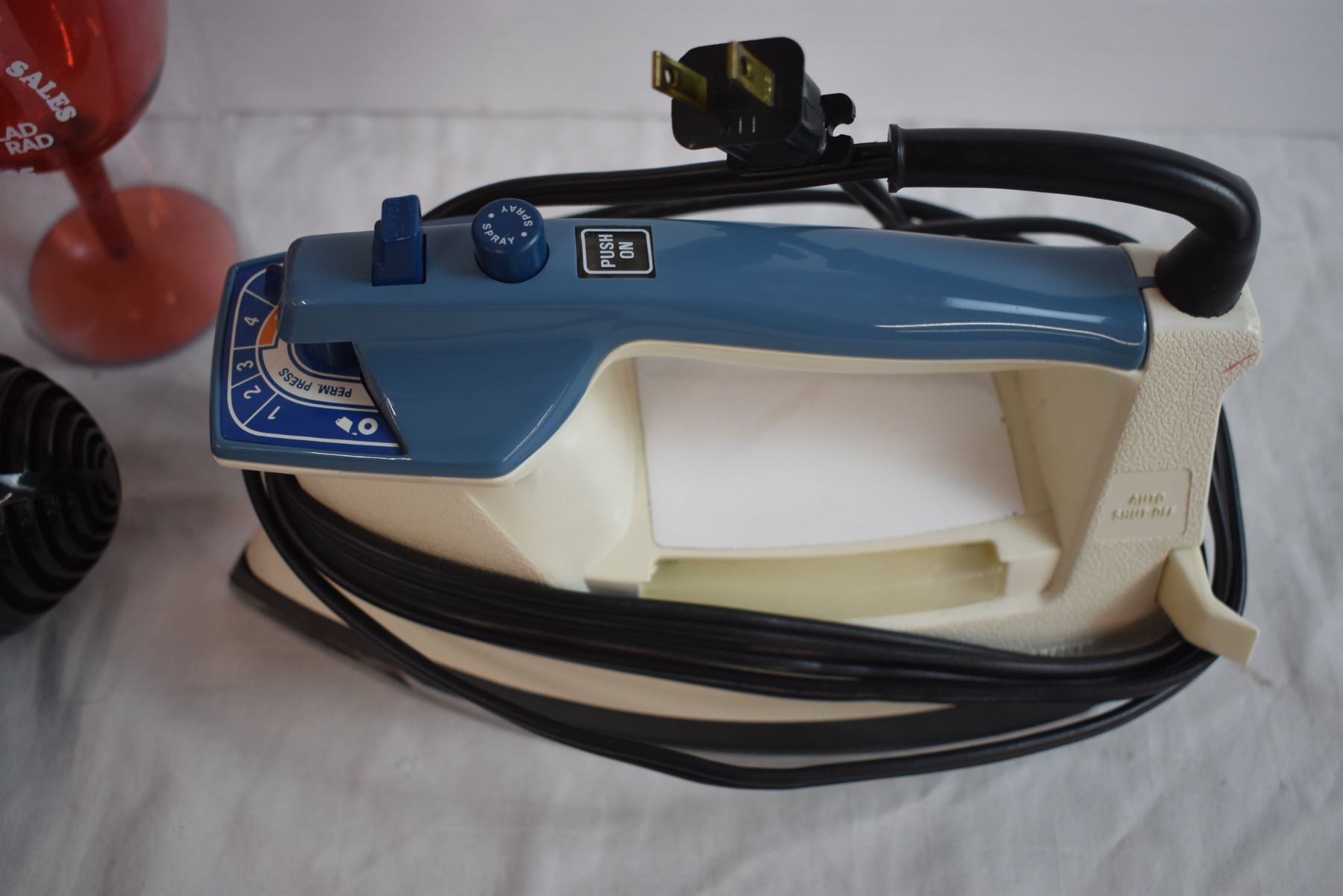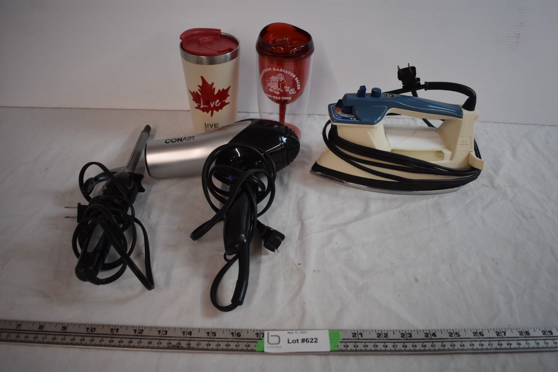 Clothes Iron, Curling Iron, Blow Dryer, and Ellen Travel Mug, travel wine glass