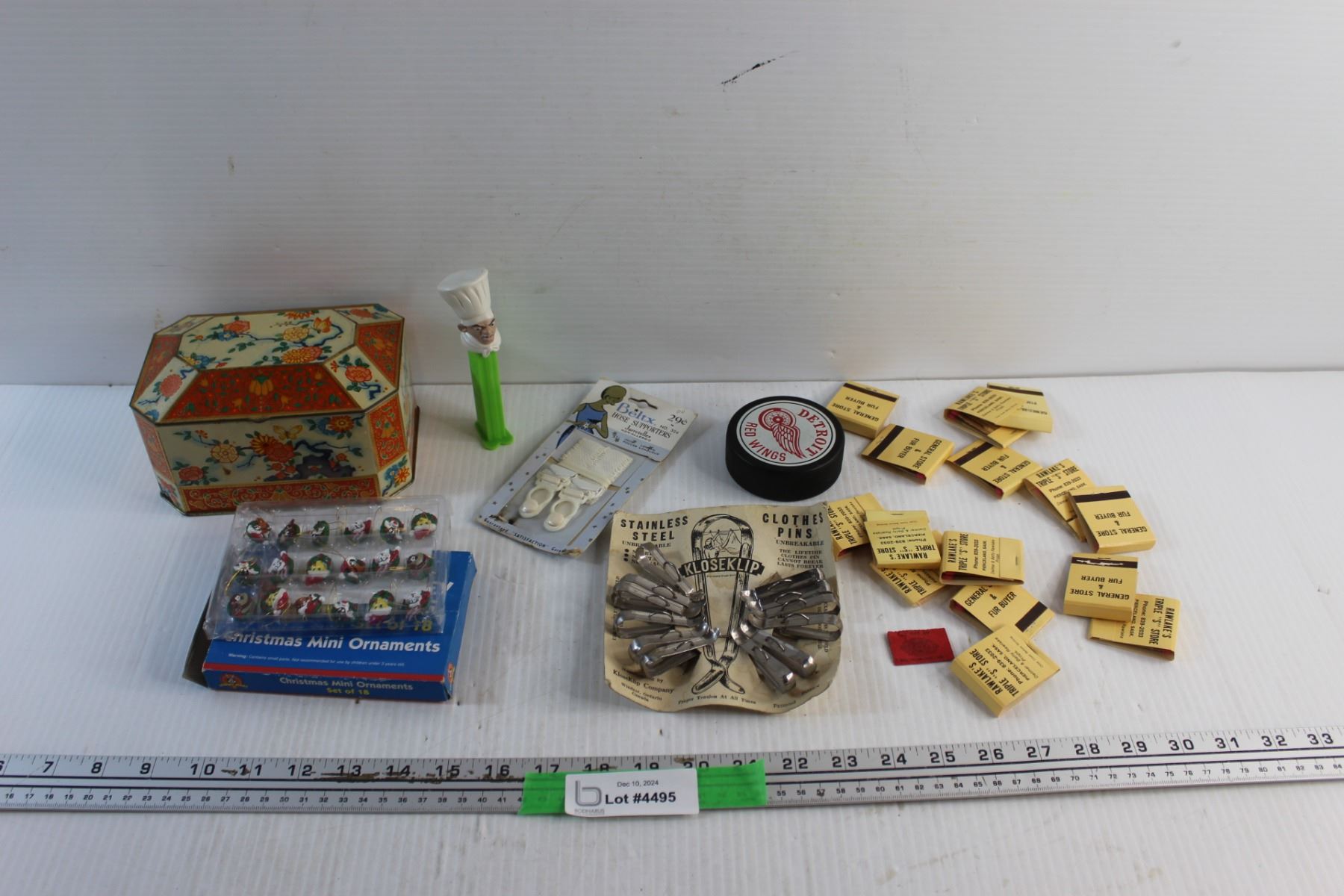 Clothes Pins, Vintage Tin Storage Box, Looney Tunes Christmas Ornaments, Hockey Puck and Vintage Matches