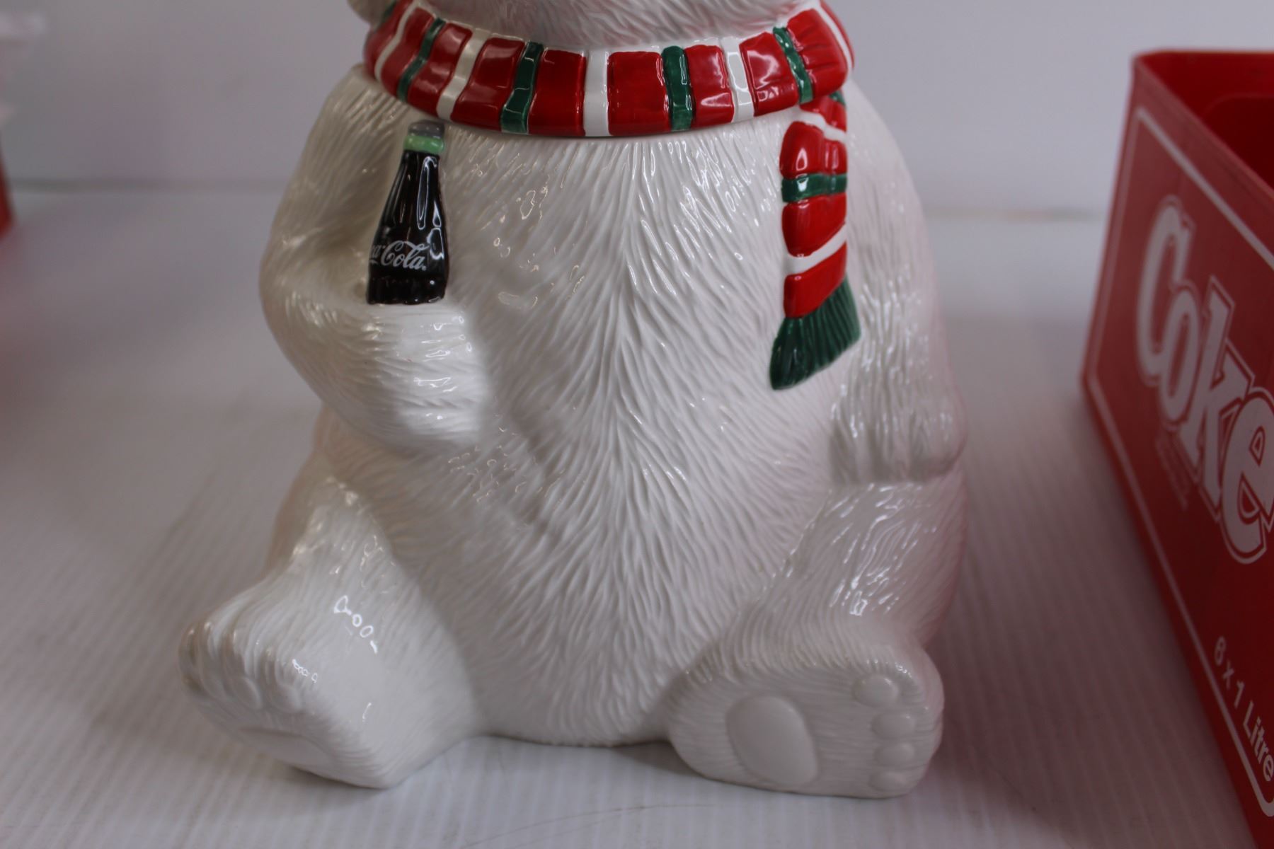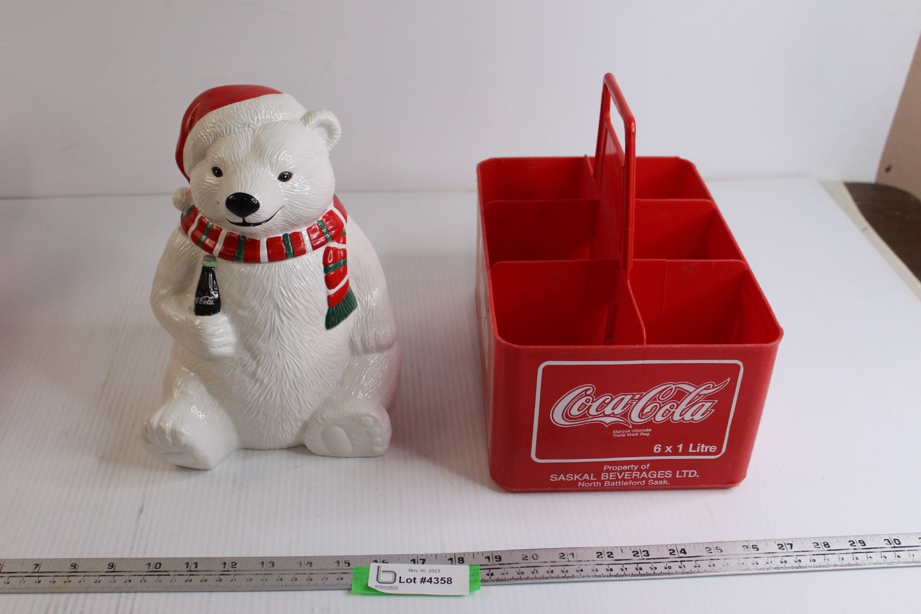 Coca-Cola 6-Bottle Case, Coca-Cola Christmas Polar Bear Cookie Jar - Has Hairline Crack and Chip on Head