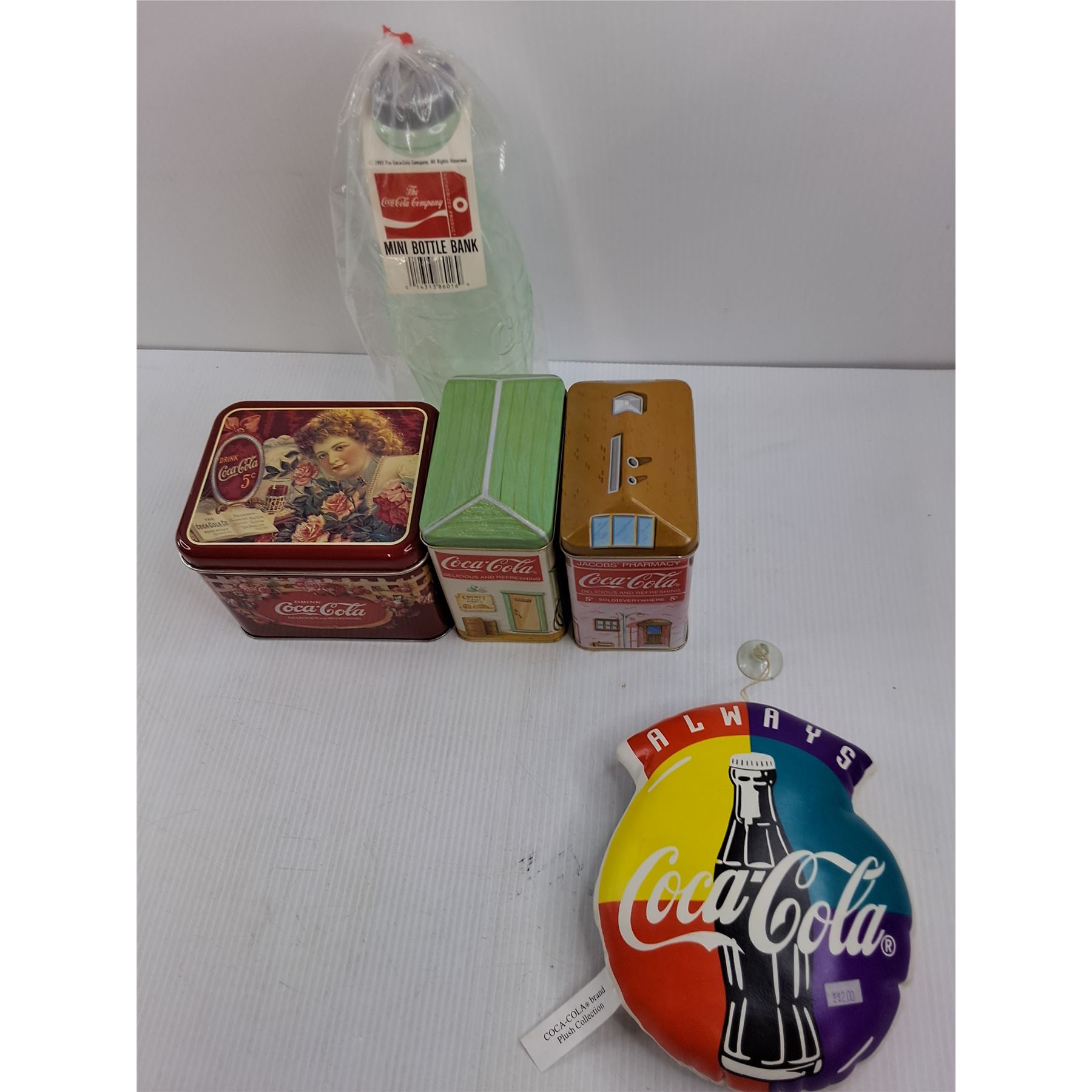 Coca-Cola Memorabilia (Tins, Coin Bank, Plushie)