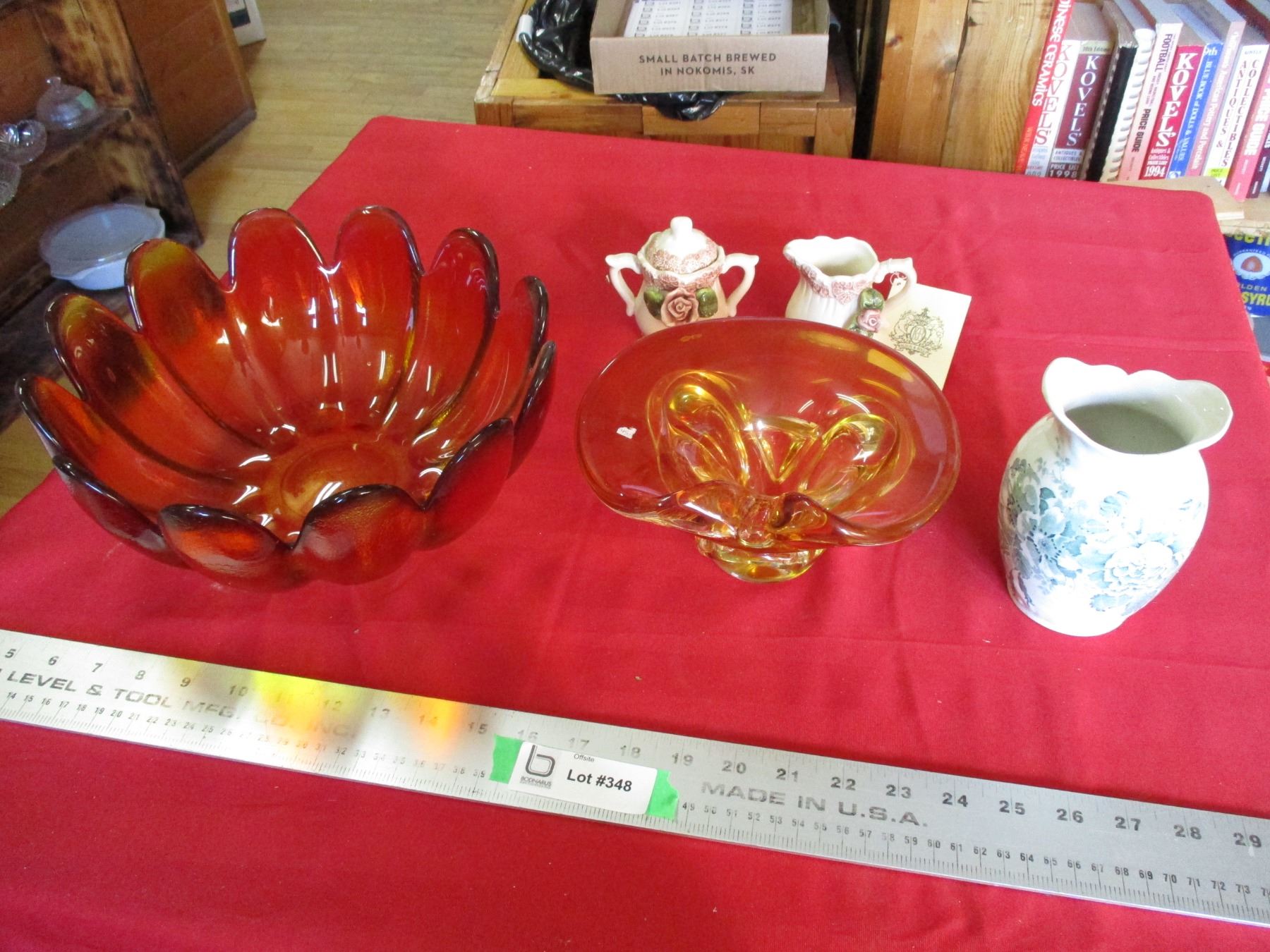 Colored bowl + cream sugar set + blown glass, ceramic vase