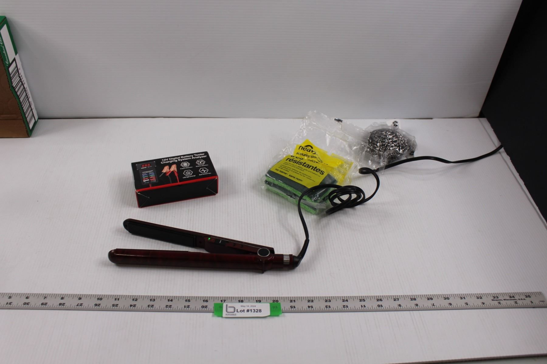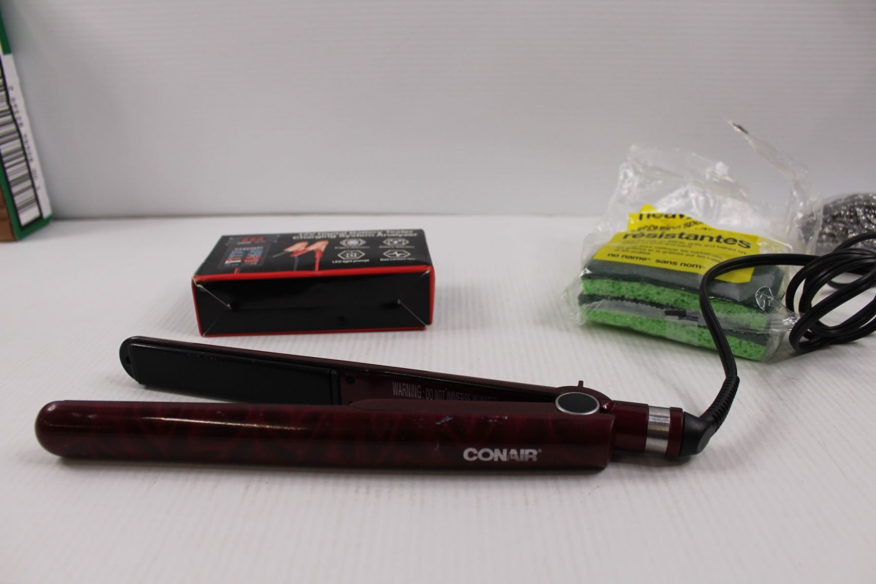 Conair Hair Straightener (Used, Working), 12v Digital Battery Tester (NIB) & Scouring Pads