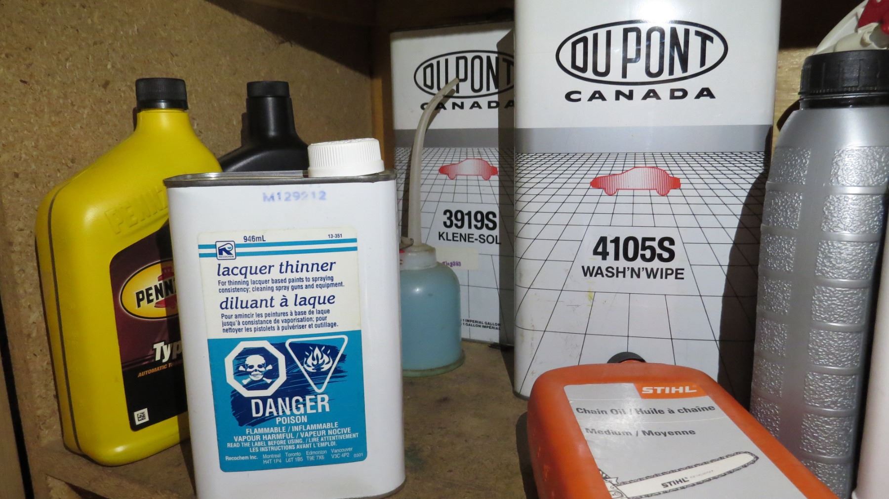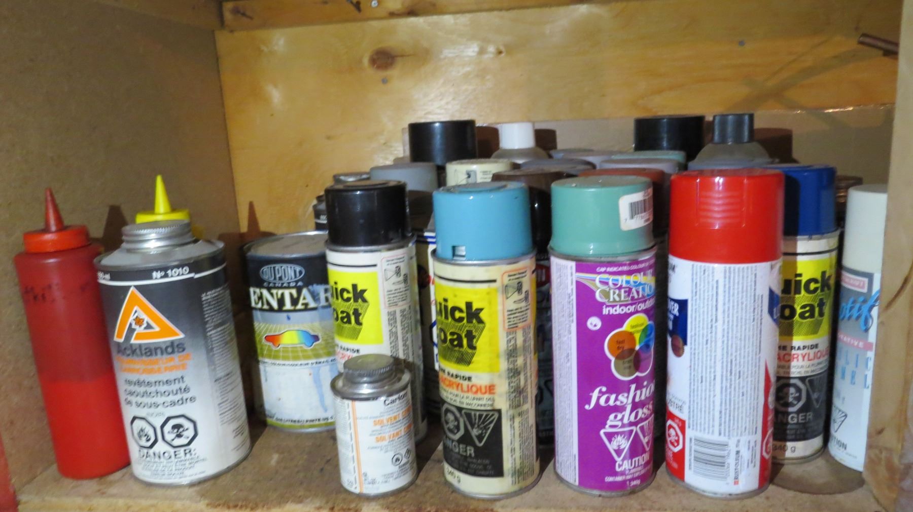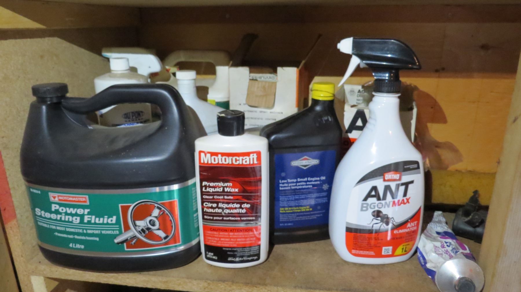 Contents of (5) shelves - solvents, oils, paints, ant out
