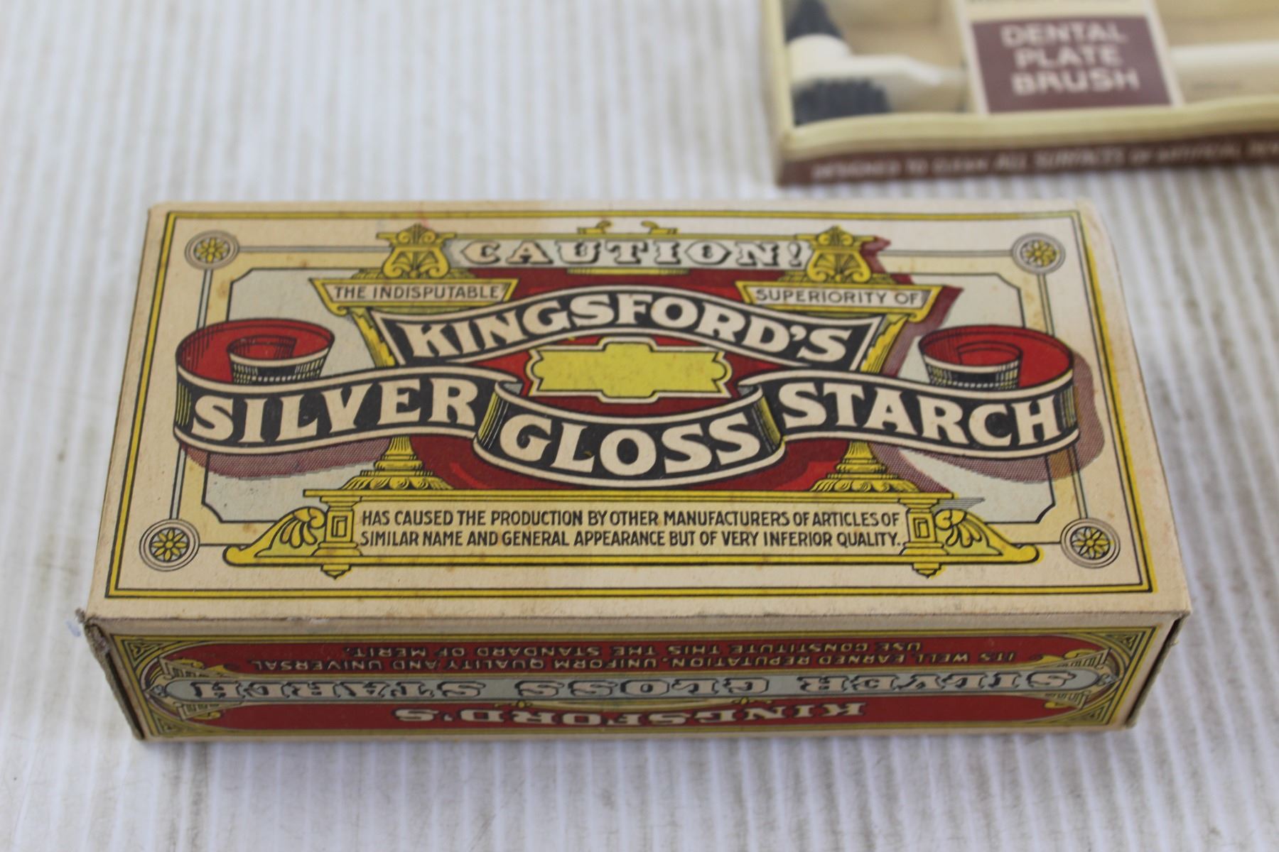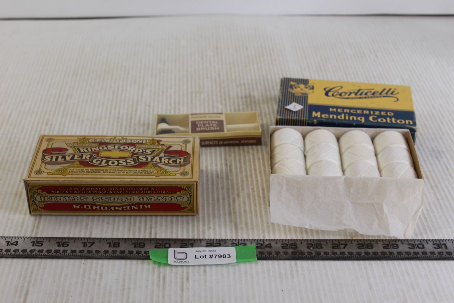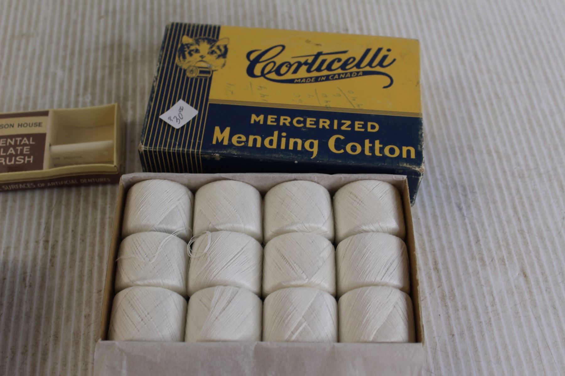 Corticelli Mercerized Mending Cotton, Kingsford's Silver Gloss Starch, Hudson House Dental Plate Brush