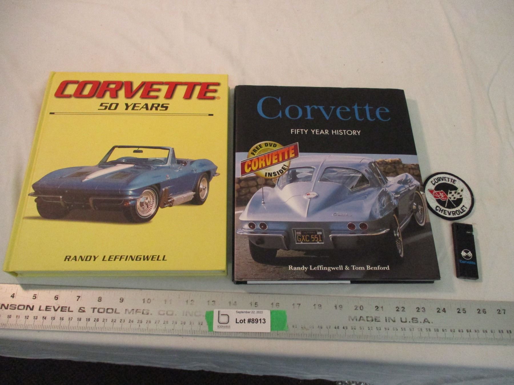 Corvette hardcover books - 50 year history + 50 years, plus patch + lighter - mint