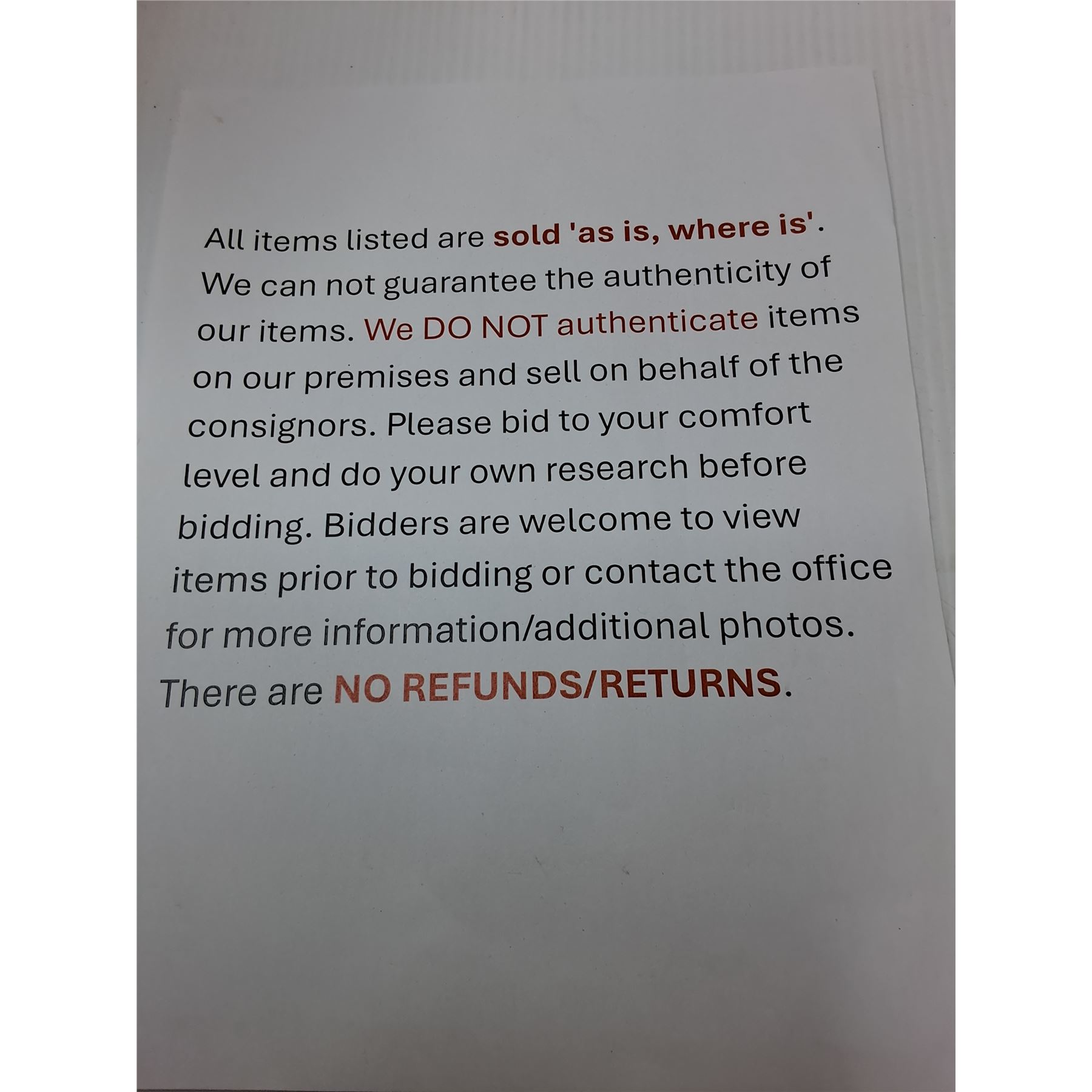 If you are wanting to hold on items for another auction coming up, let us know within 24 hours (maximum hold: 2 auctions). Please give 15 to 30 days for items to be collected, packed, payment processed and shipped out.