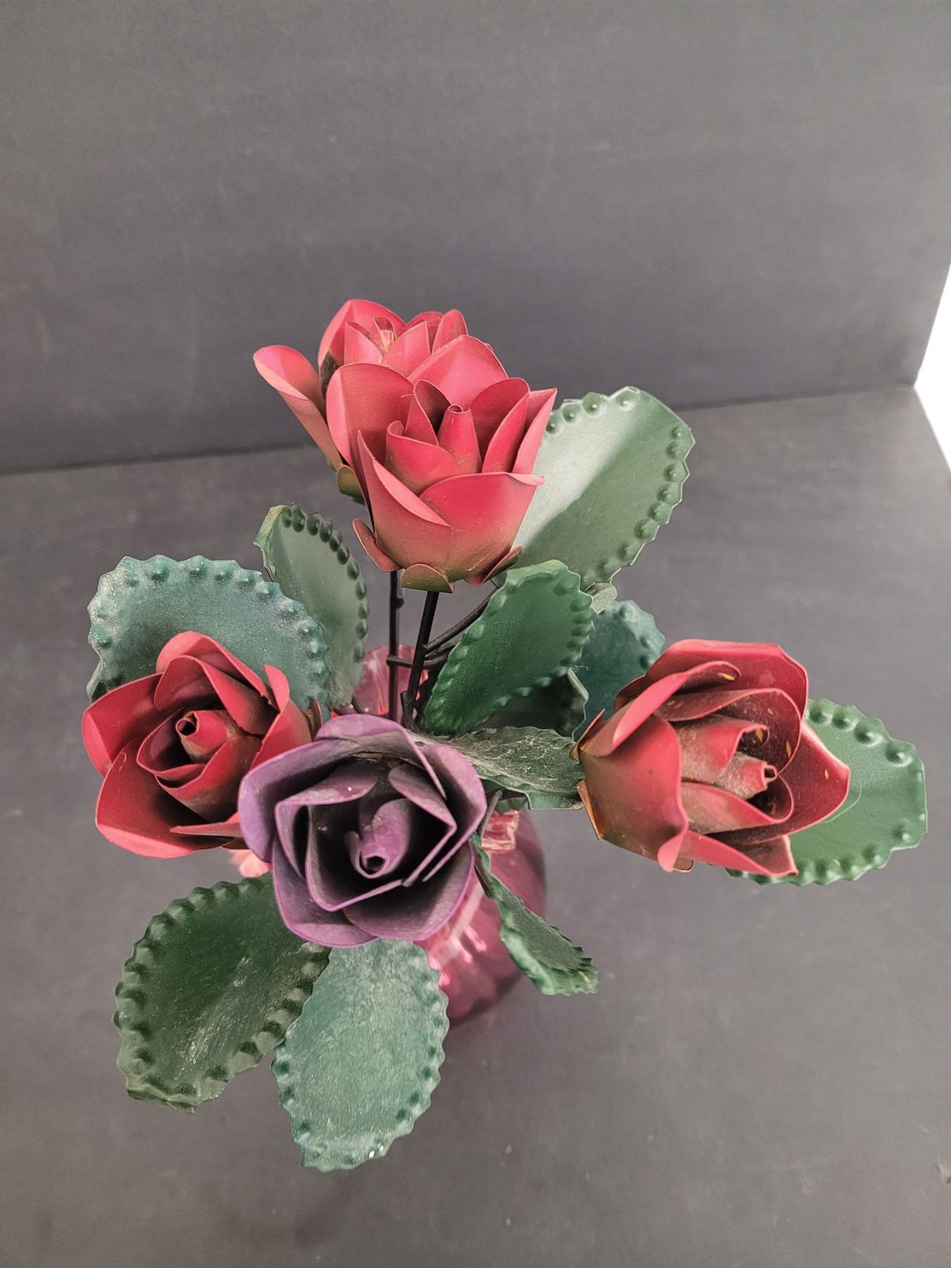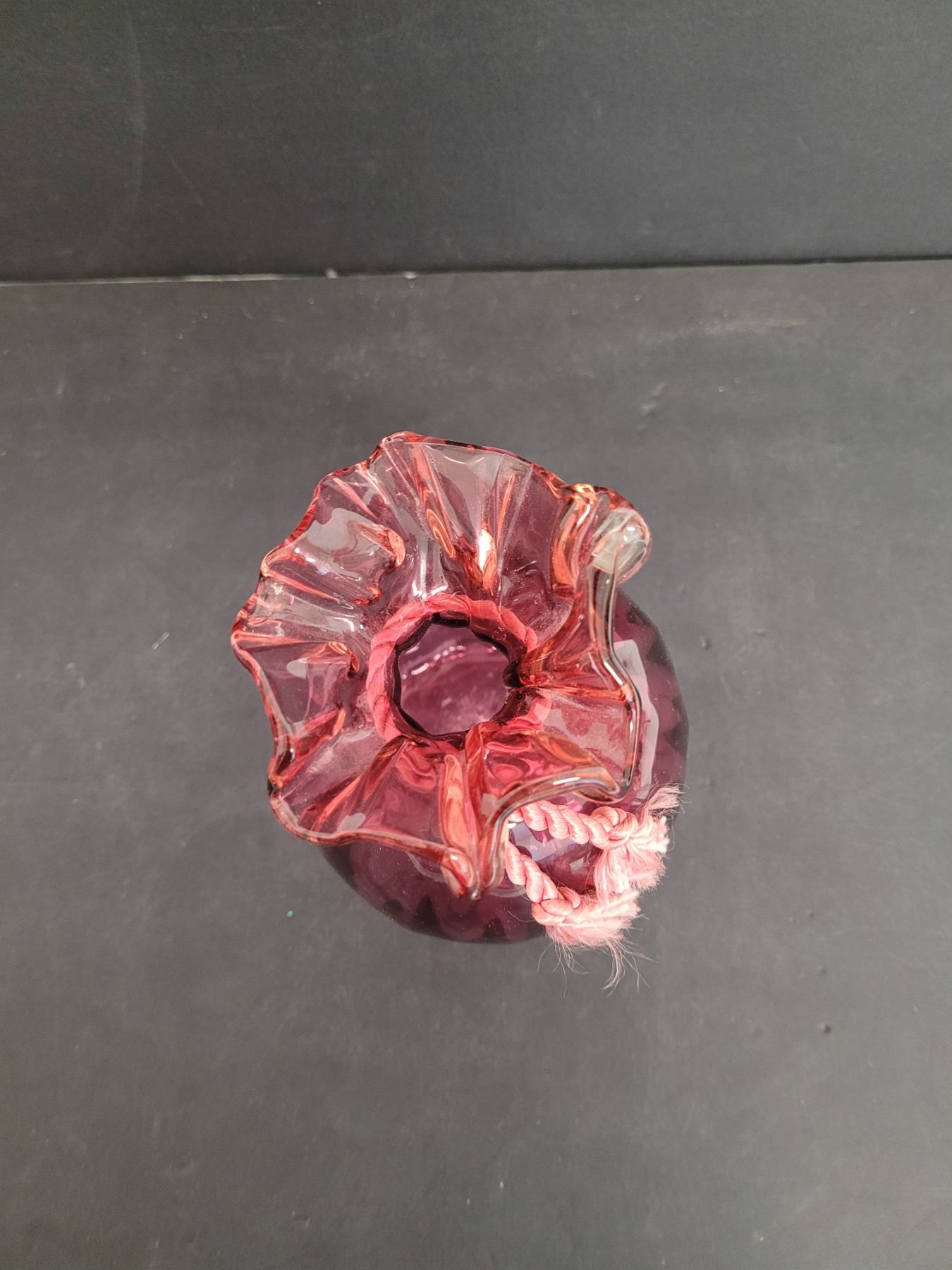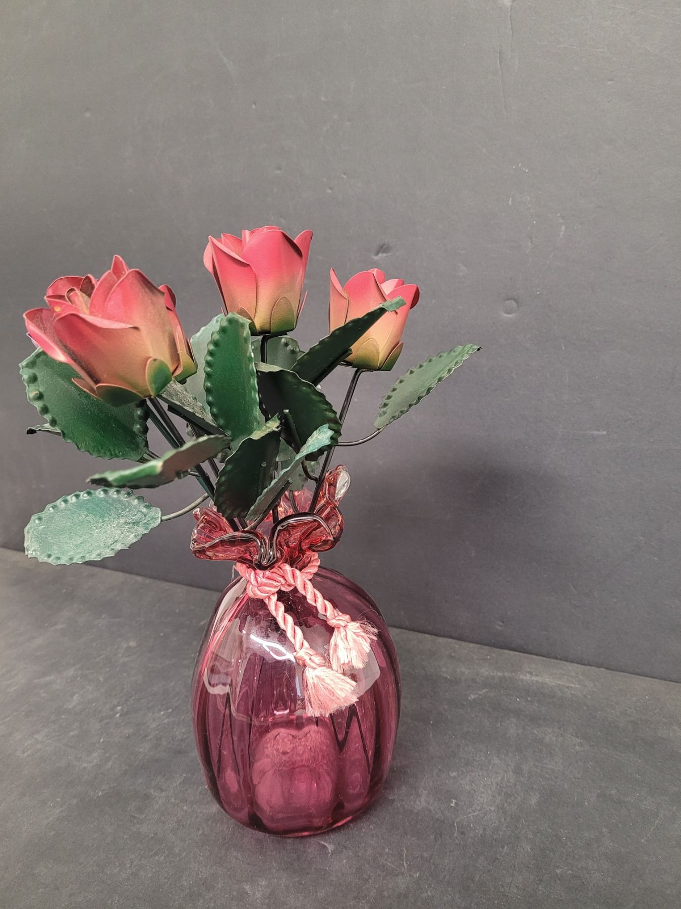 Cranberry Glass Bag Vase w/ Metal Roses and Pink & White Glass Basket (Cracked)