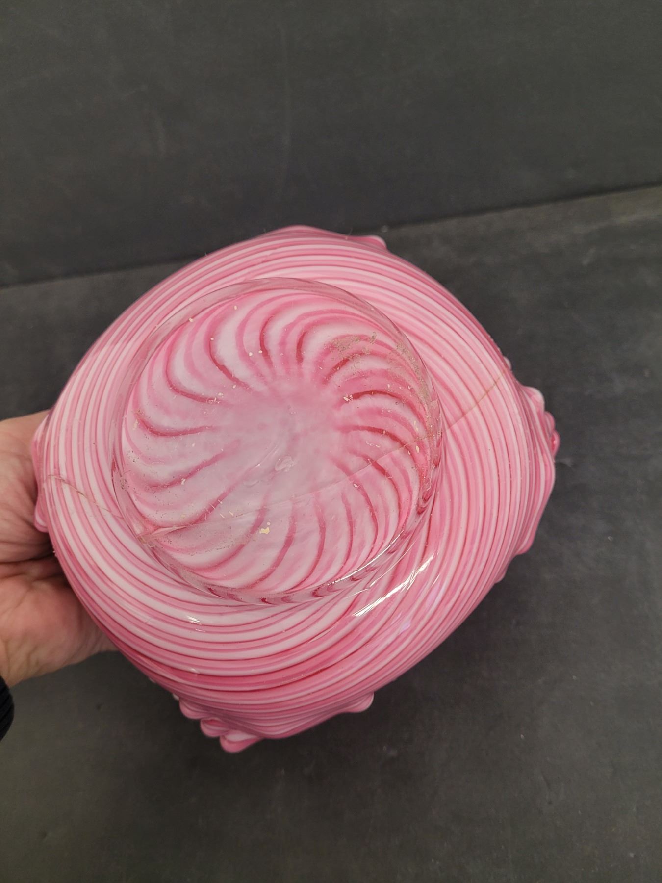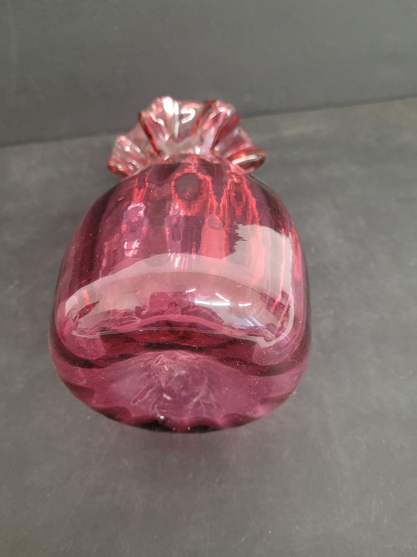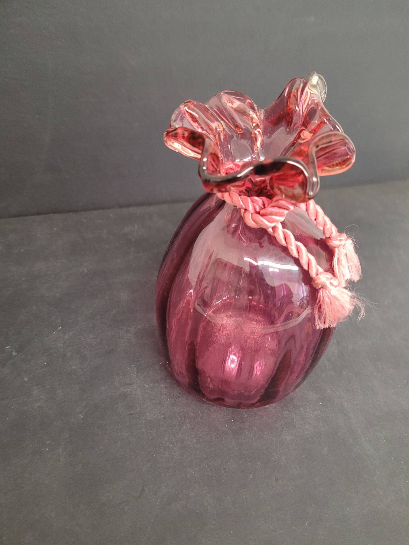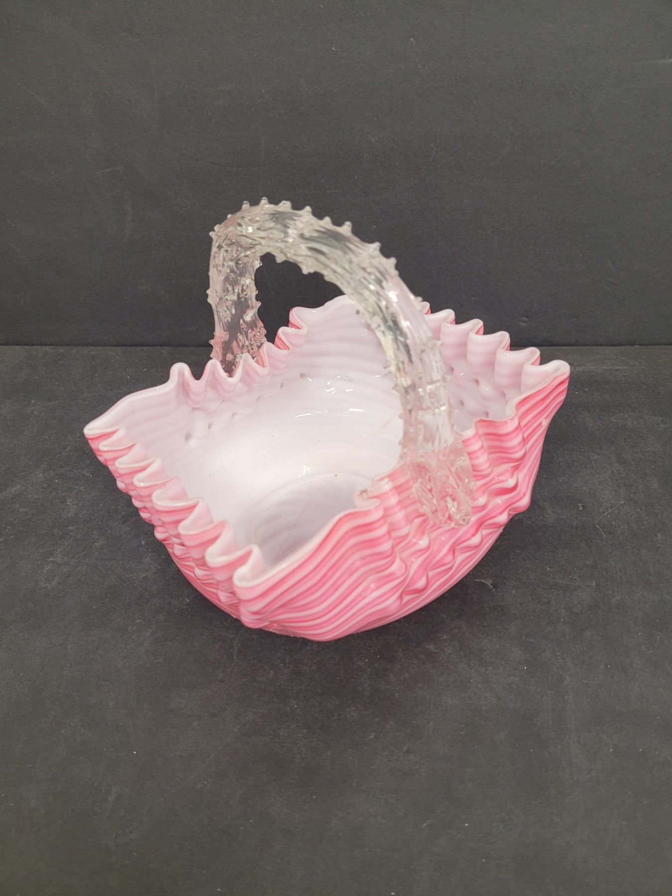Cranberry Glass Bag Vase w/ Metal Roses and Pink & White Glass Basket (Cracked)