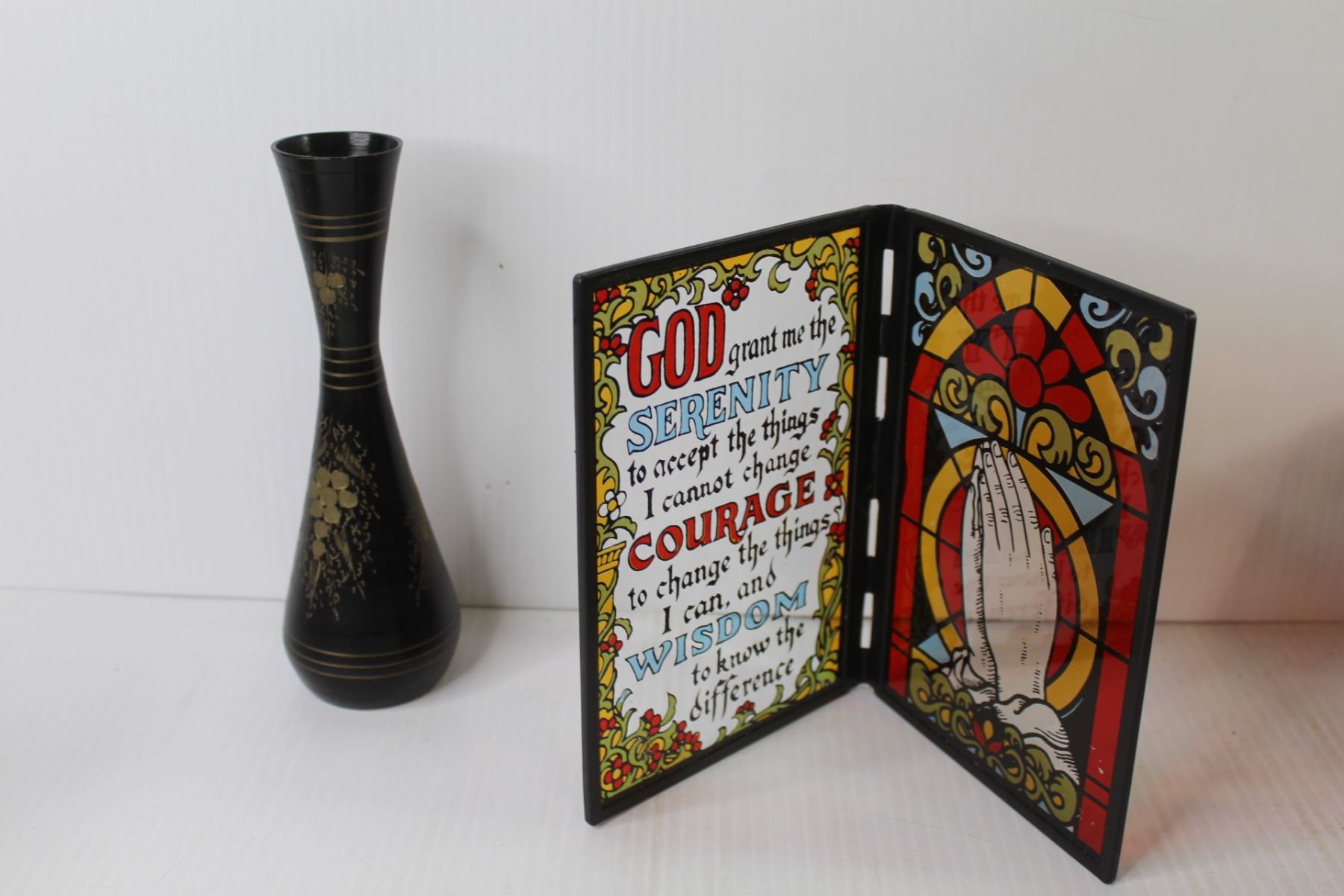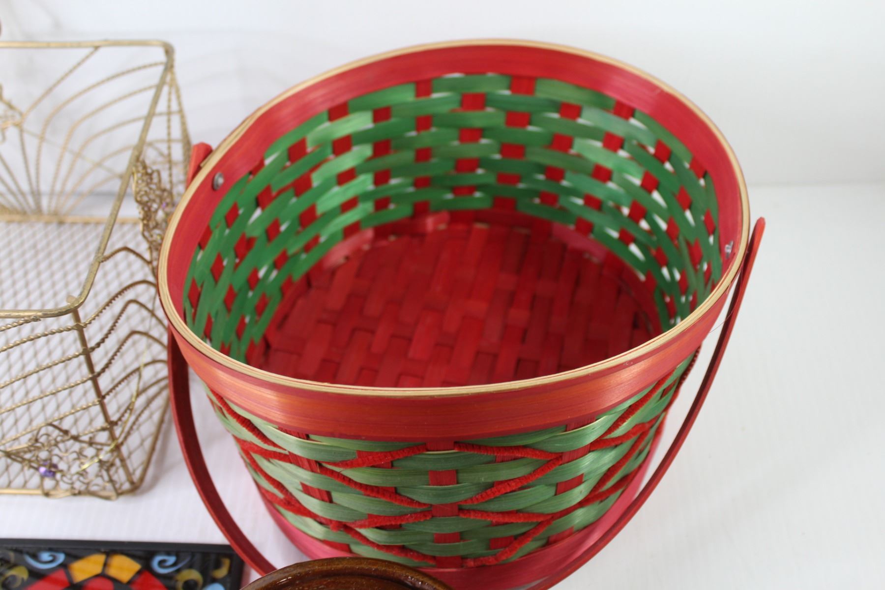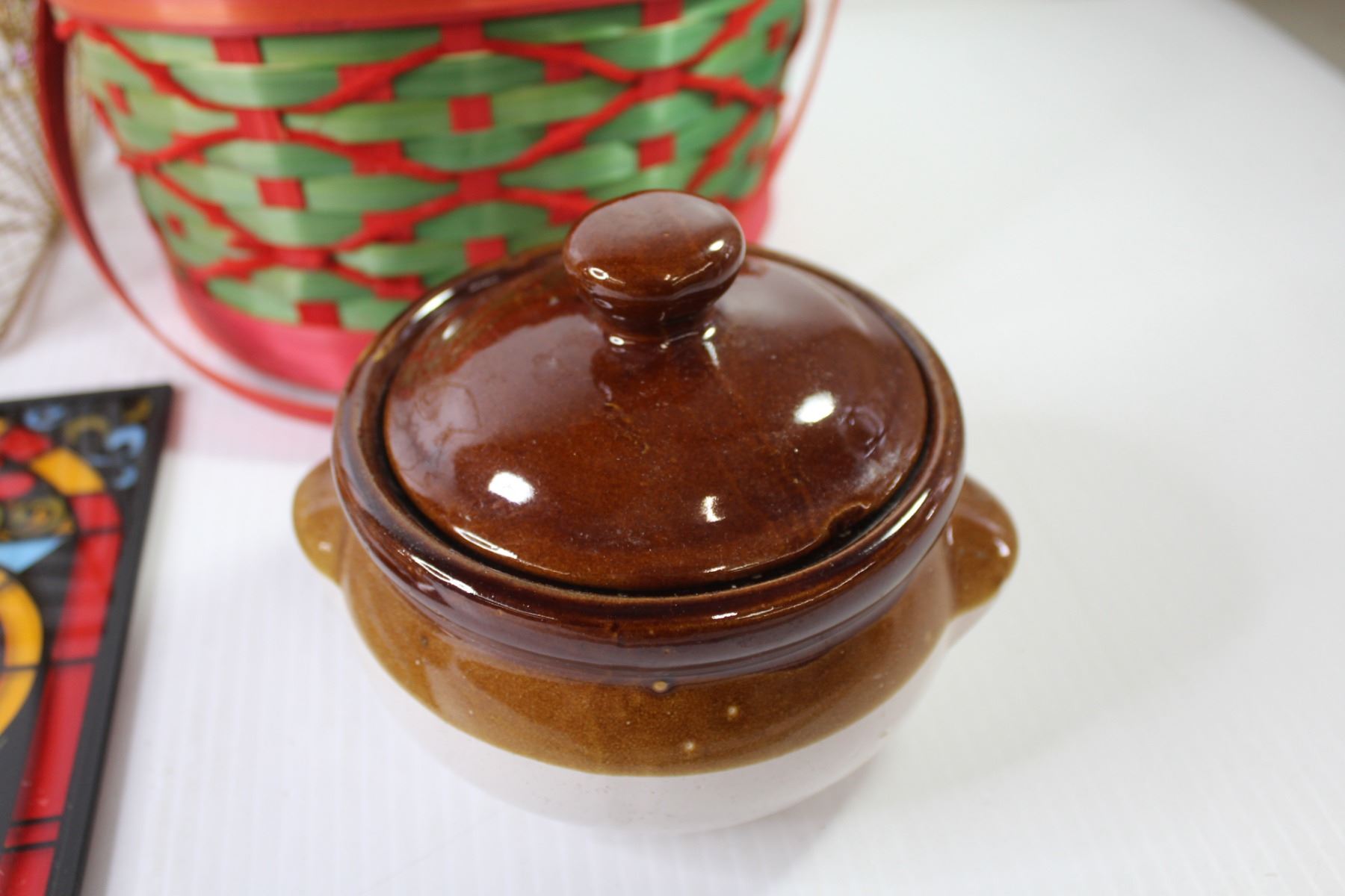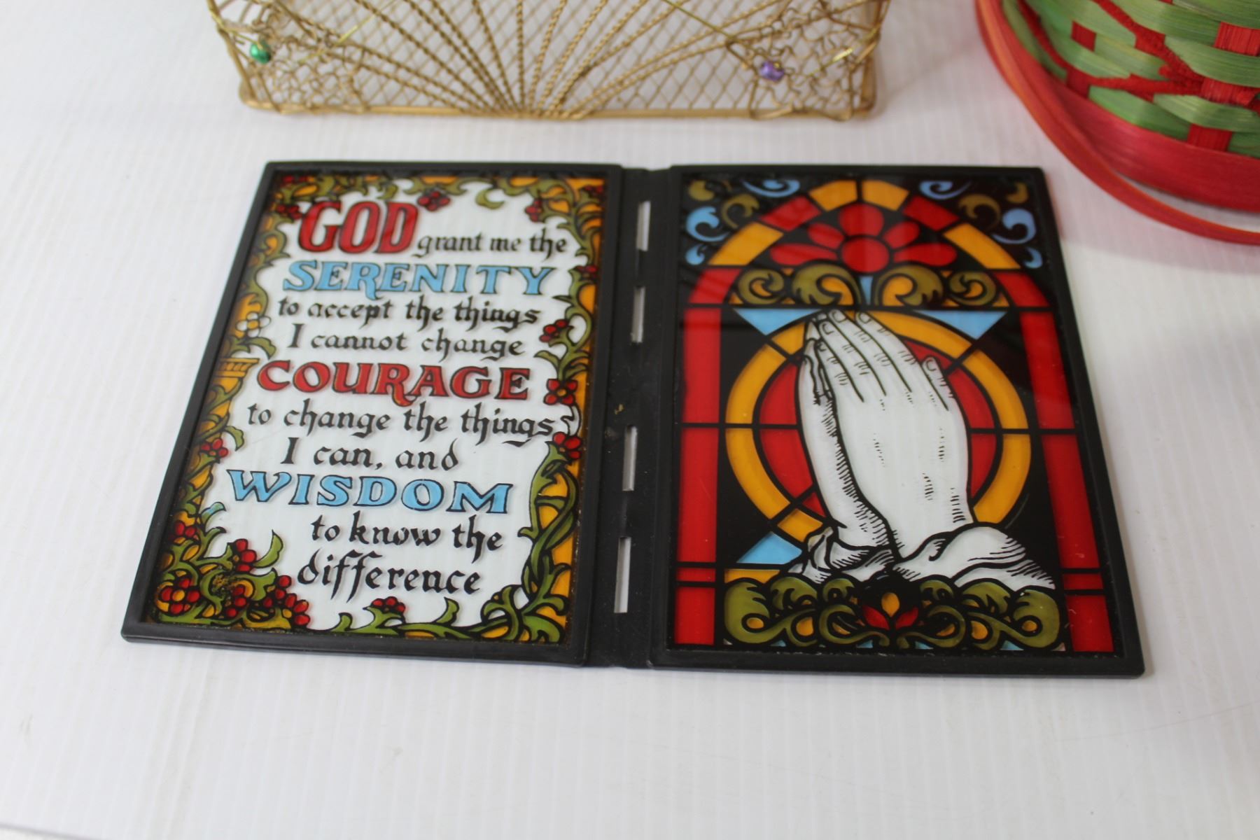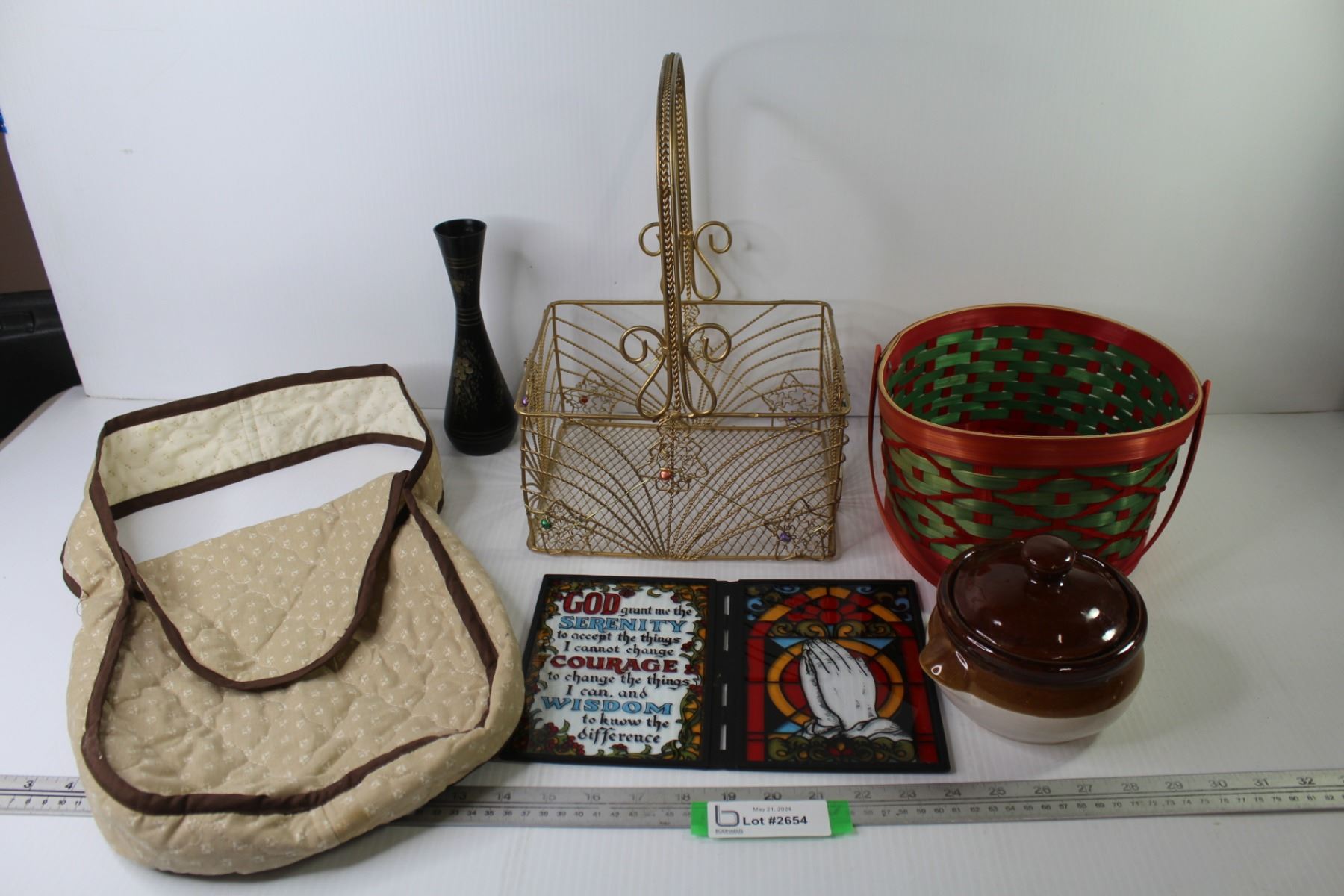 Crock Bowl - Religious Stained Glass Piece - Woven Basket - Wire Basket - Bud Vase - Cloth Bag
