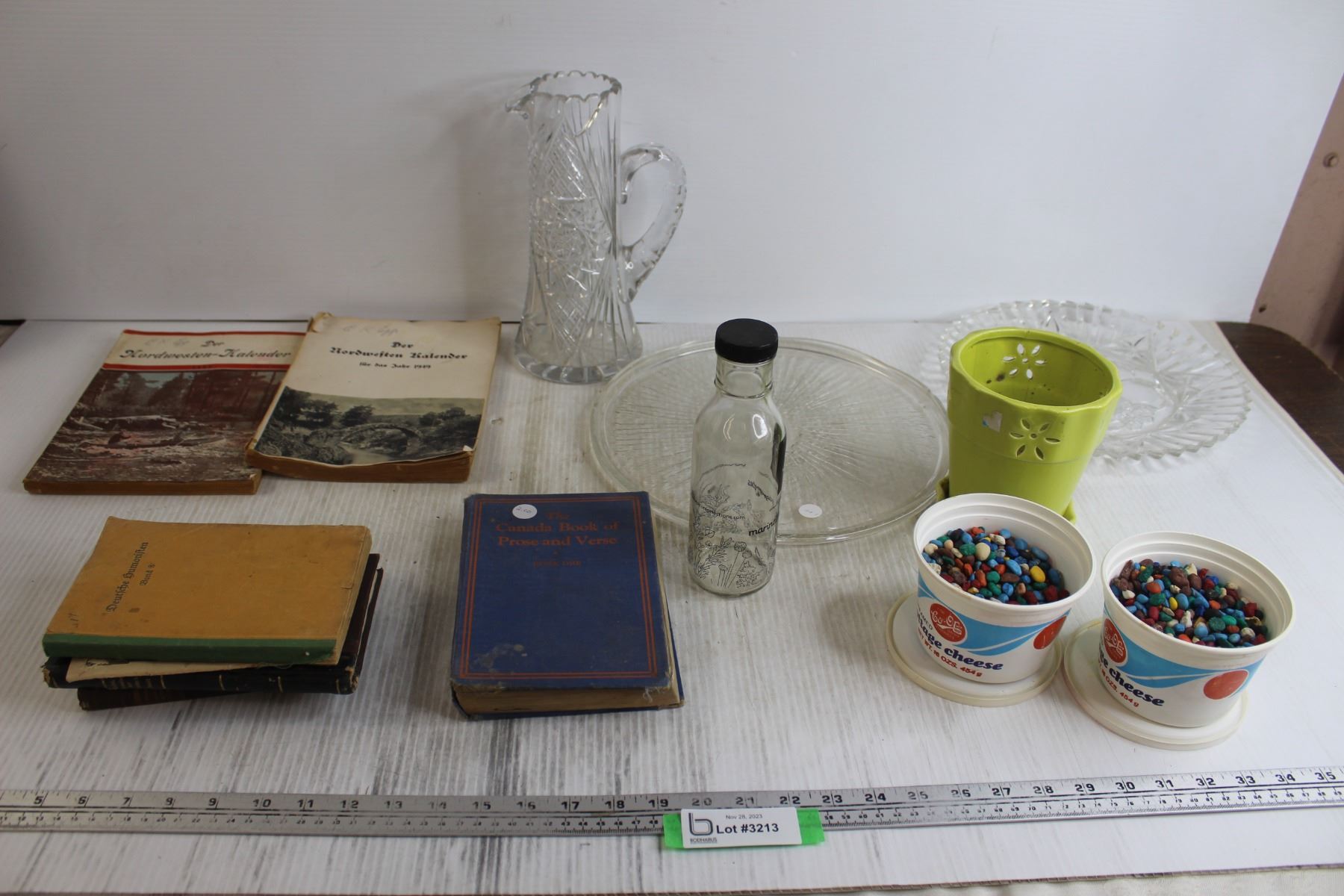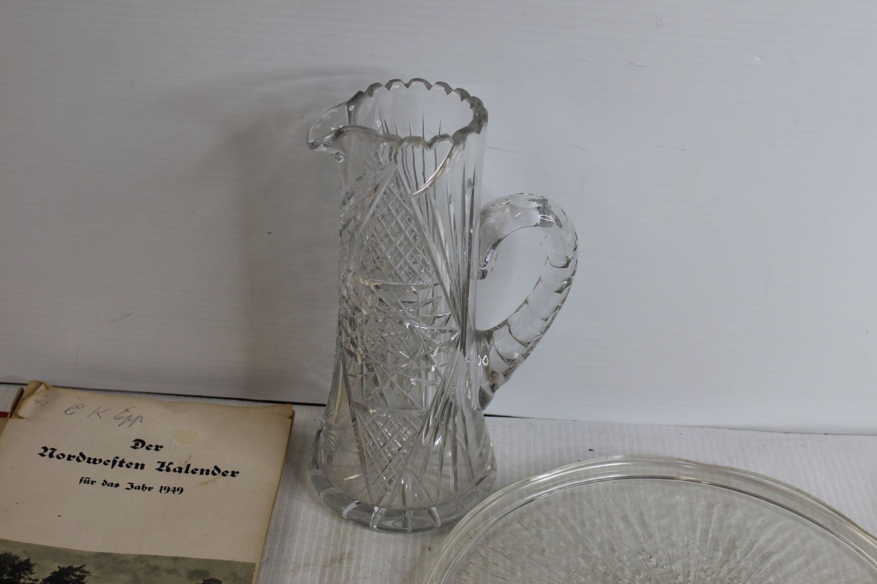 Crystal Pitcher - Has Crack, (2) Glass Platters, (6) German Books/Booklets, Misc.