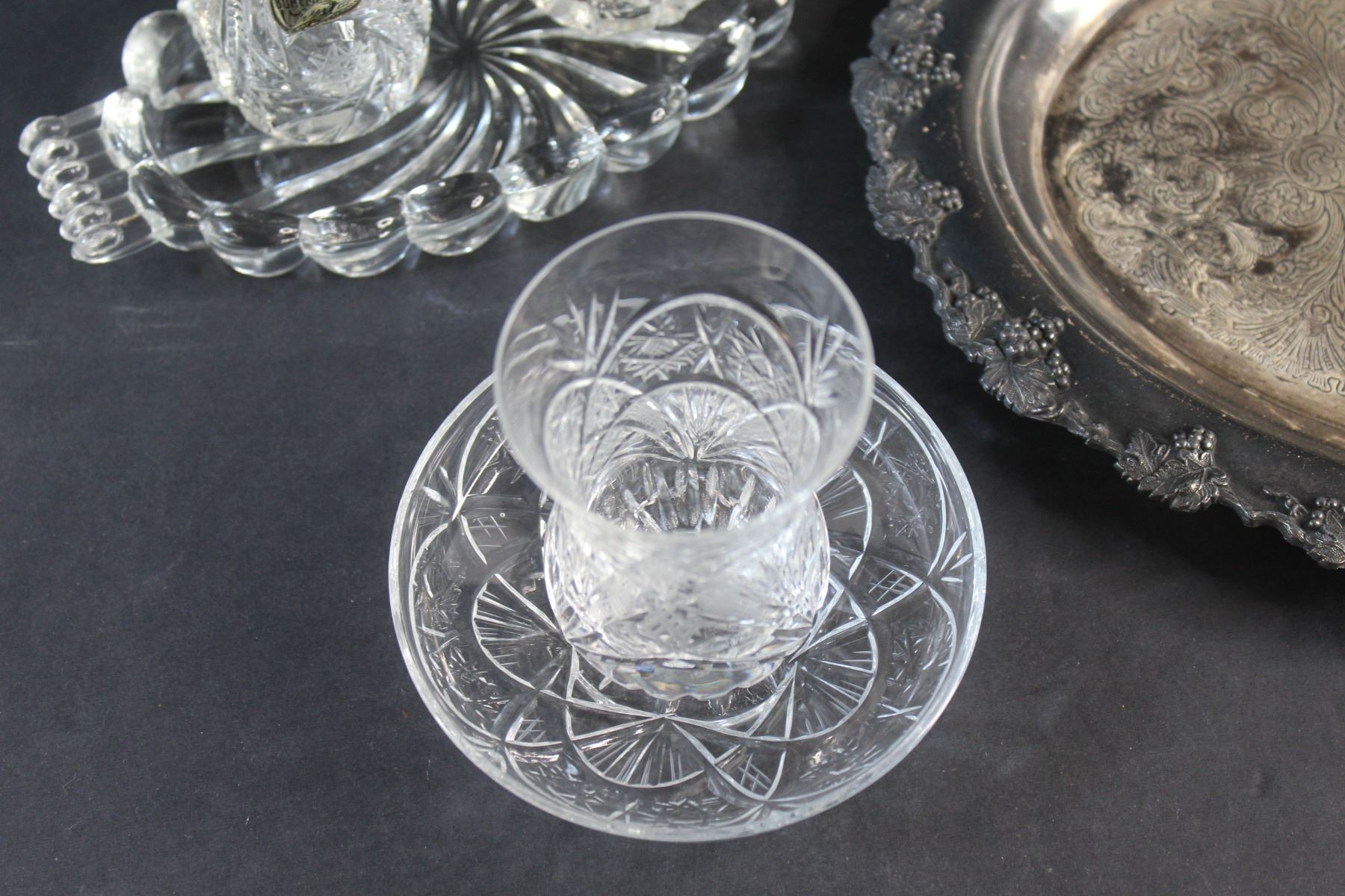 Crystal Salt & Pepper Shakers, Glass Cream & Sugar Set, Tea Cup & Coaster and Silver Plated Serving Tray