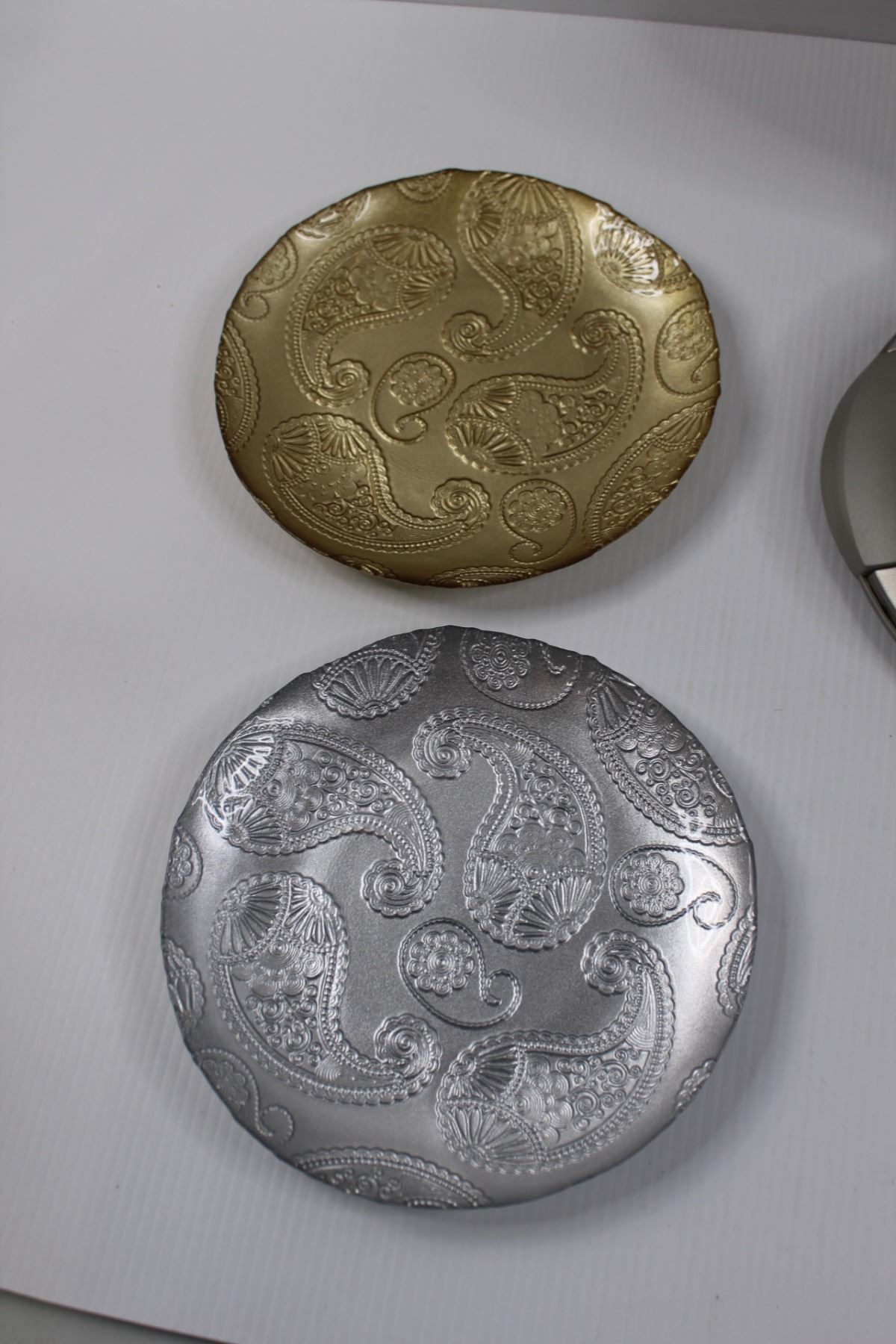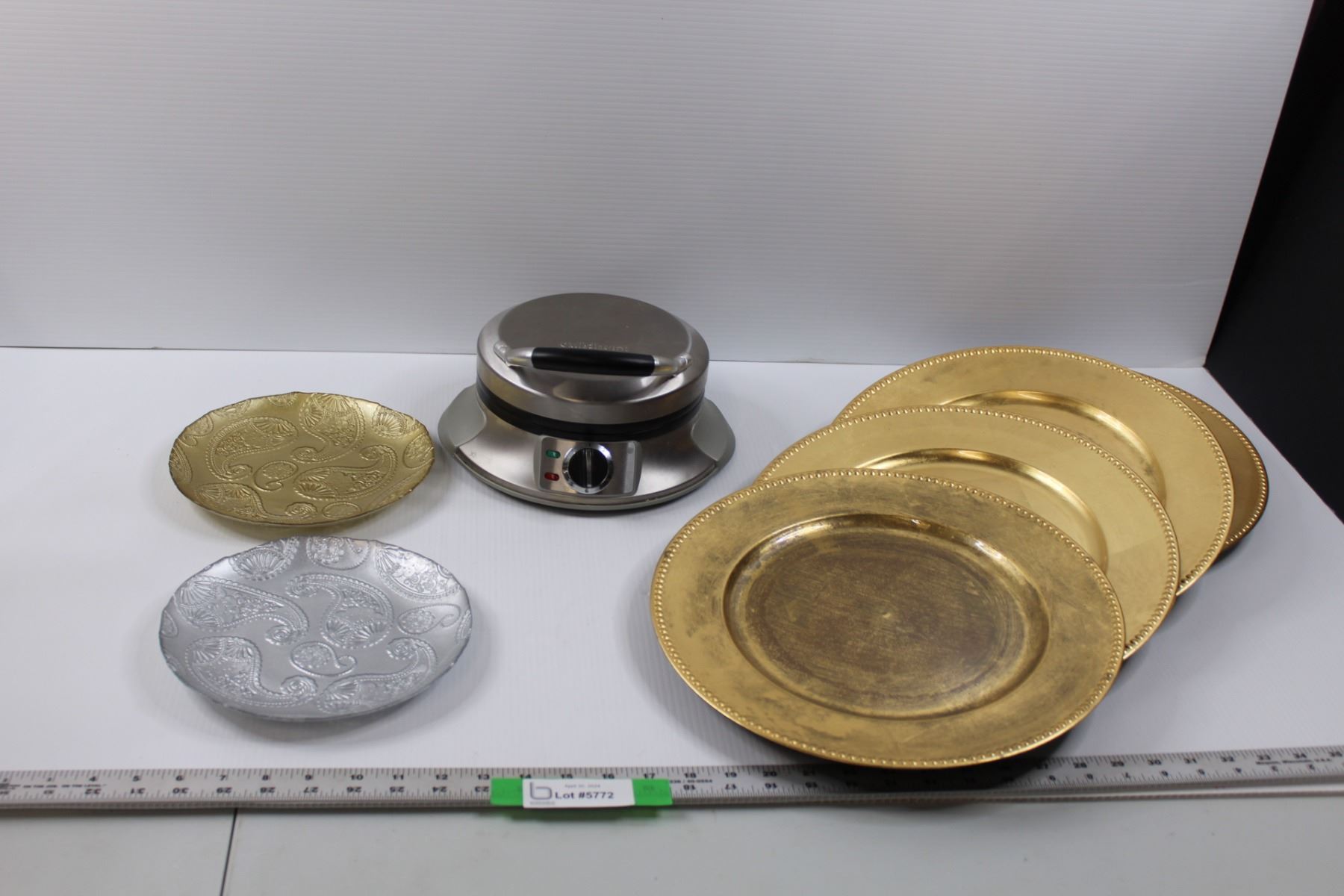 Cuisinart Waffle Iron (working), (4) Large (13") Gold Plastic Plates & (2) 8" Glass Plates (Gold/Silver)