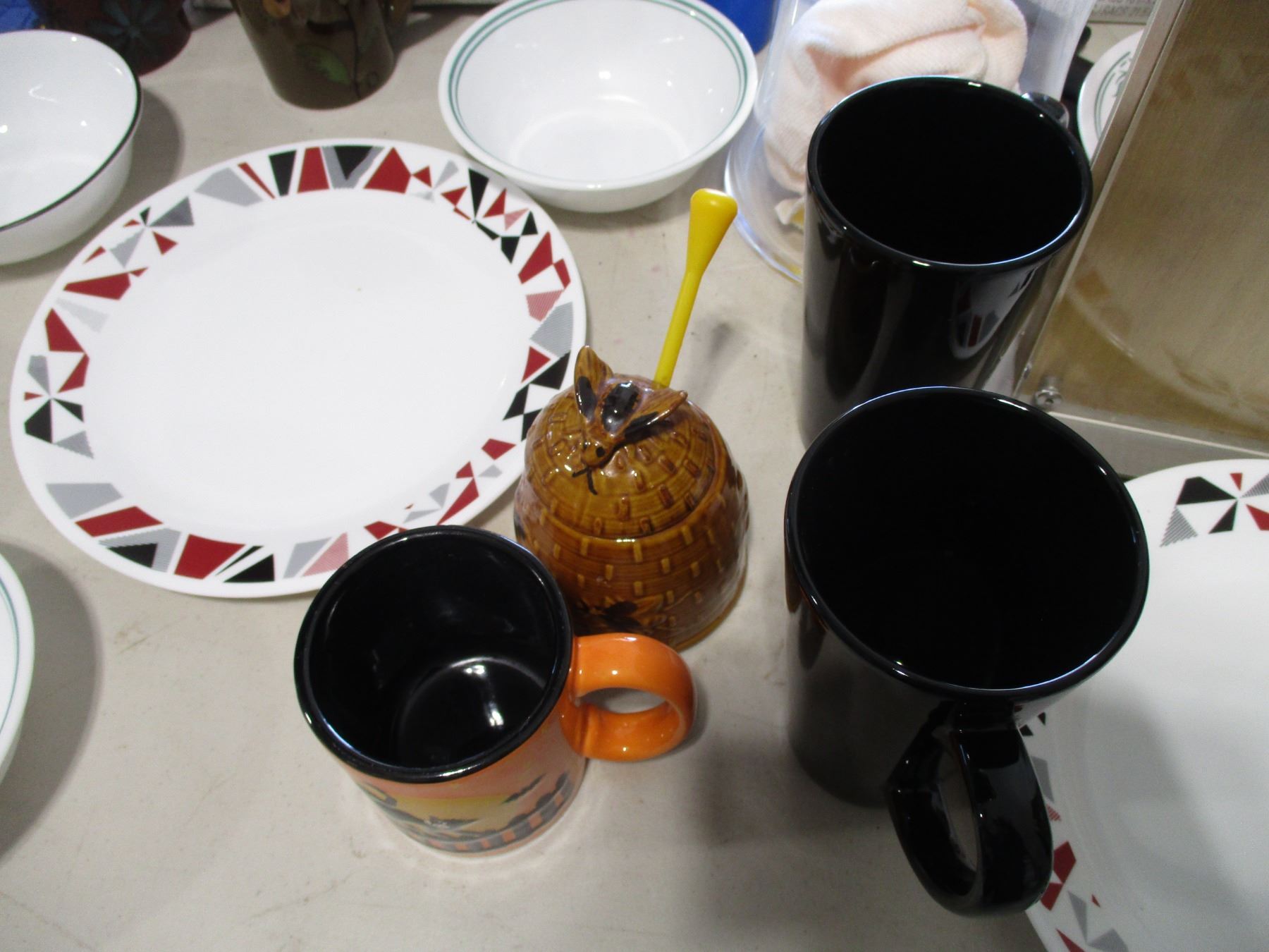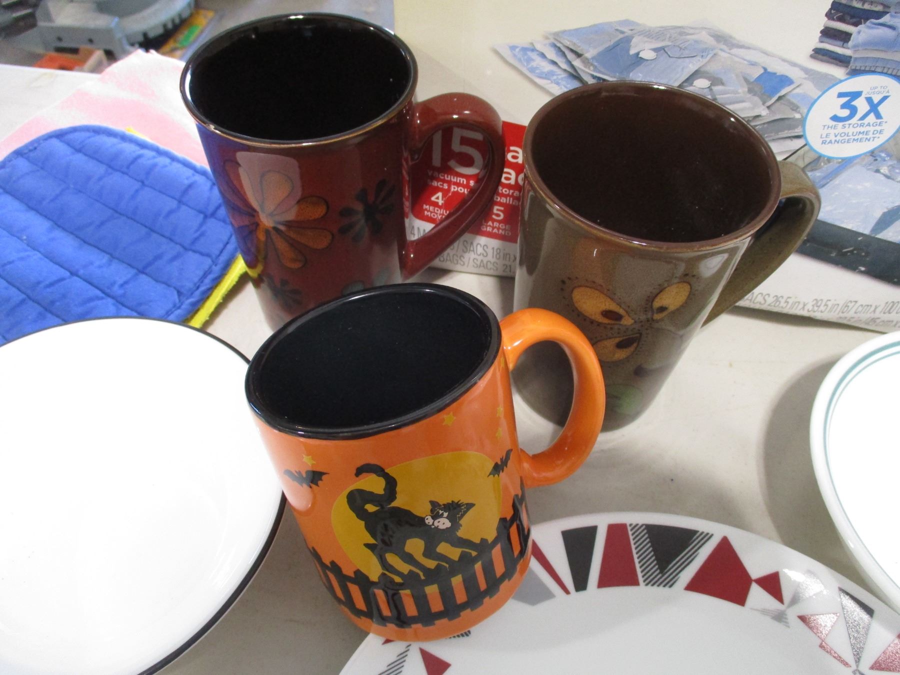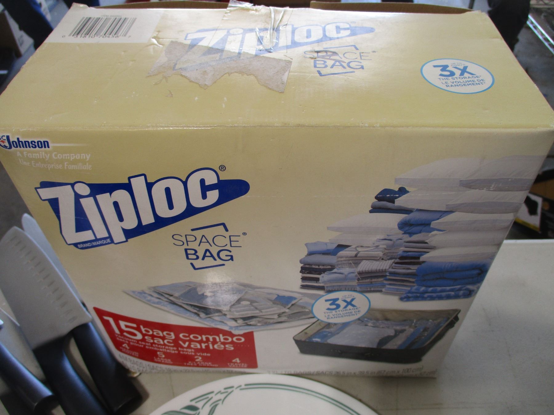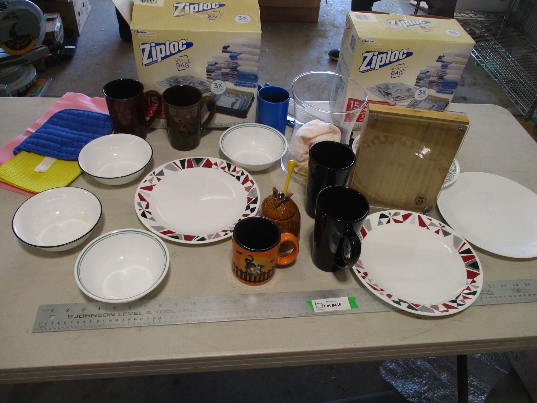 Dishware (Corelle Bowls, Mugs, Corelle Plates), Glass Vase, (2) Boxes Ziploc Space Bags etc.