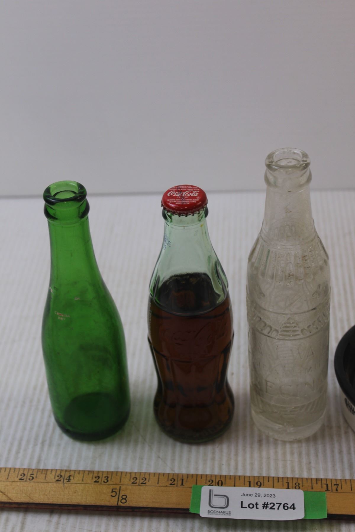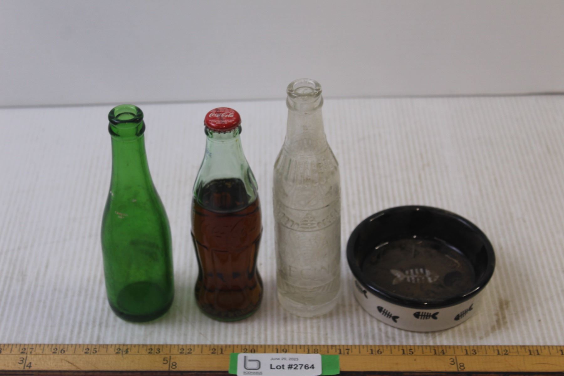 Dog Bowl (2) Empty Glass Bottles + Full Coca Cola Bottle