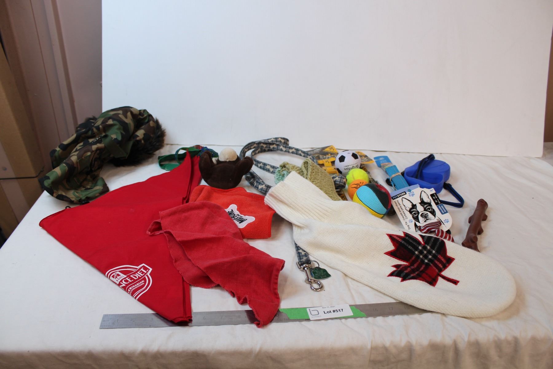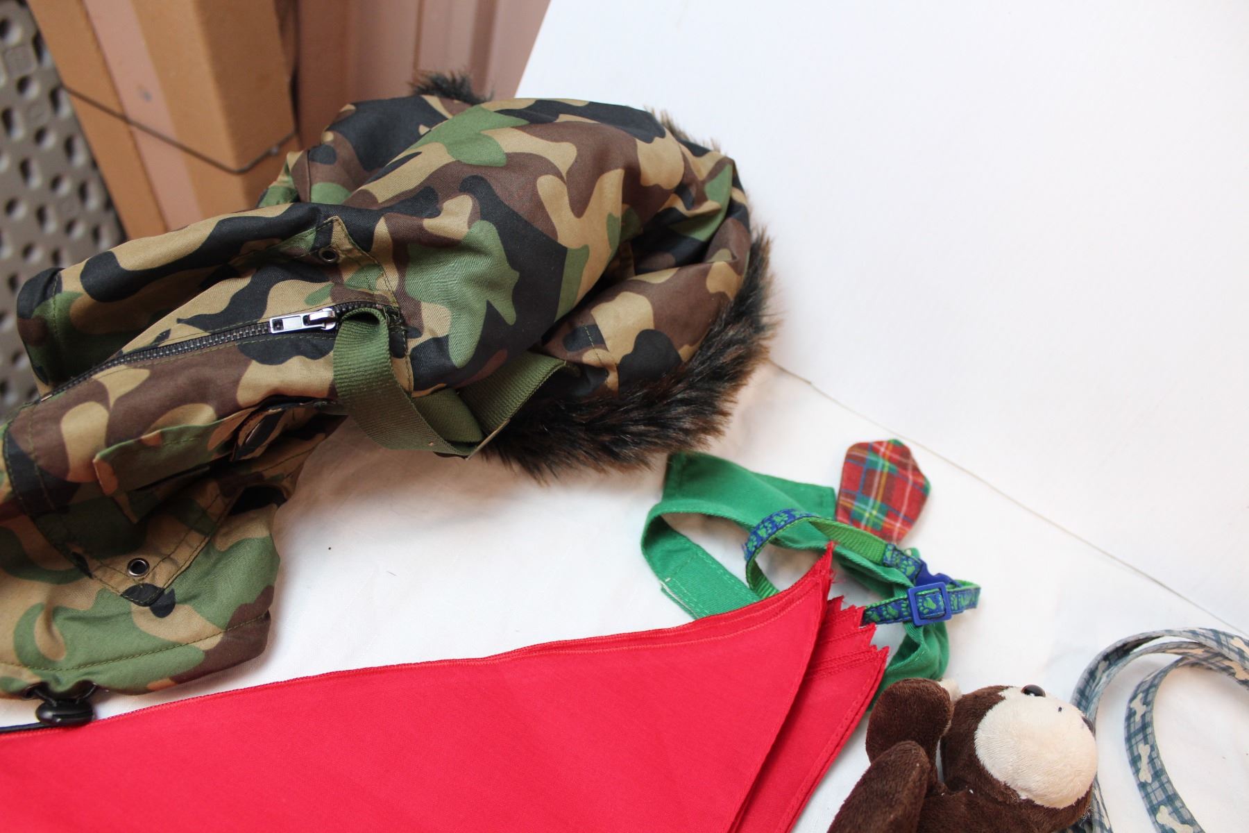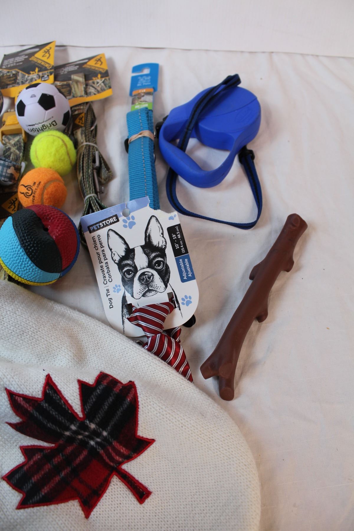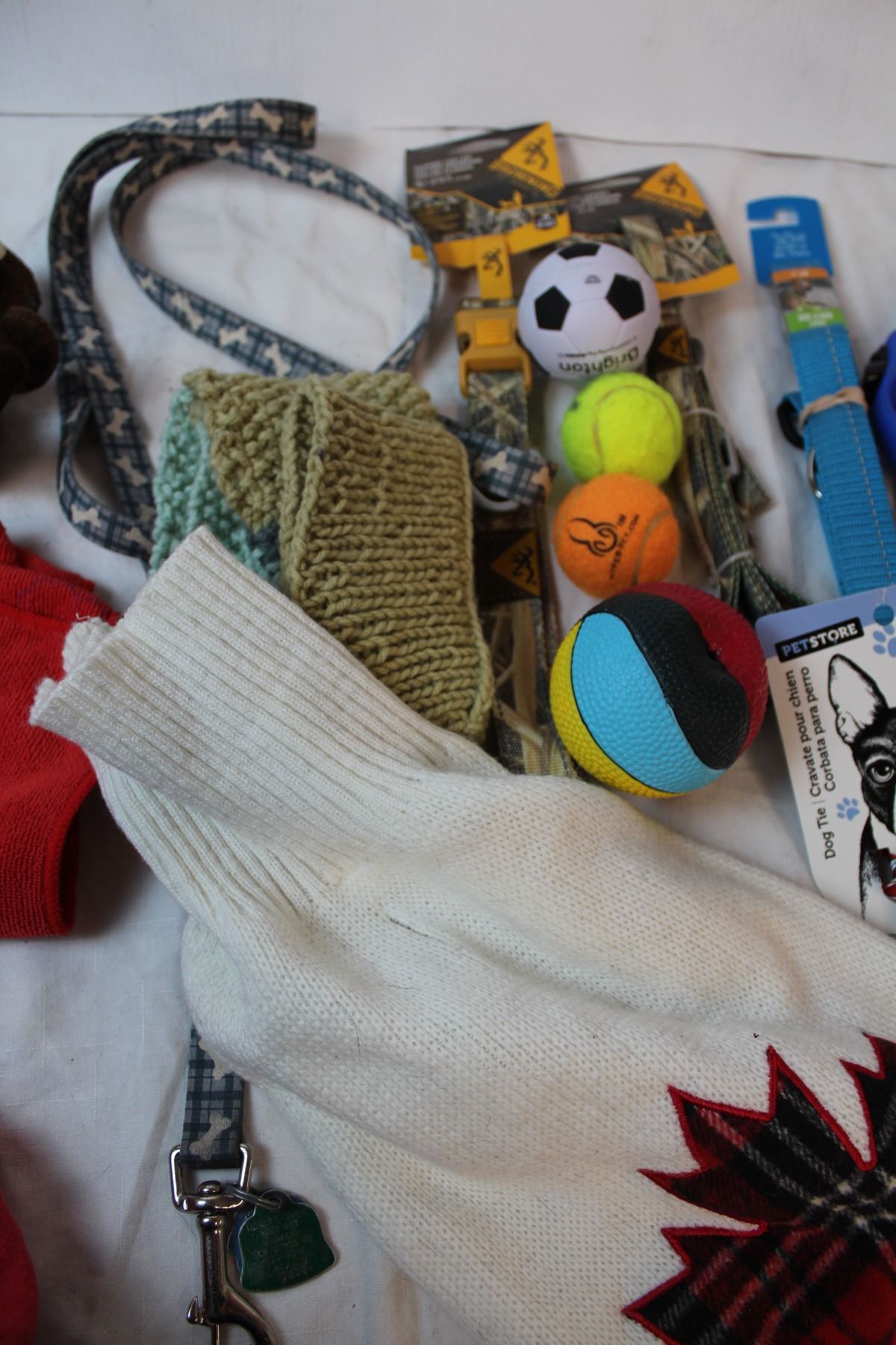 Dog clothes, camo jacket (med), New Browning leashes/collars, dog toys