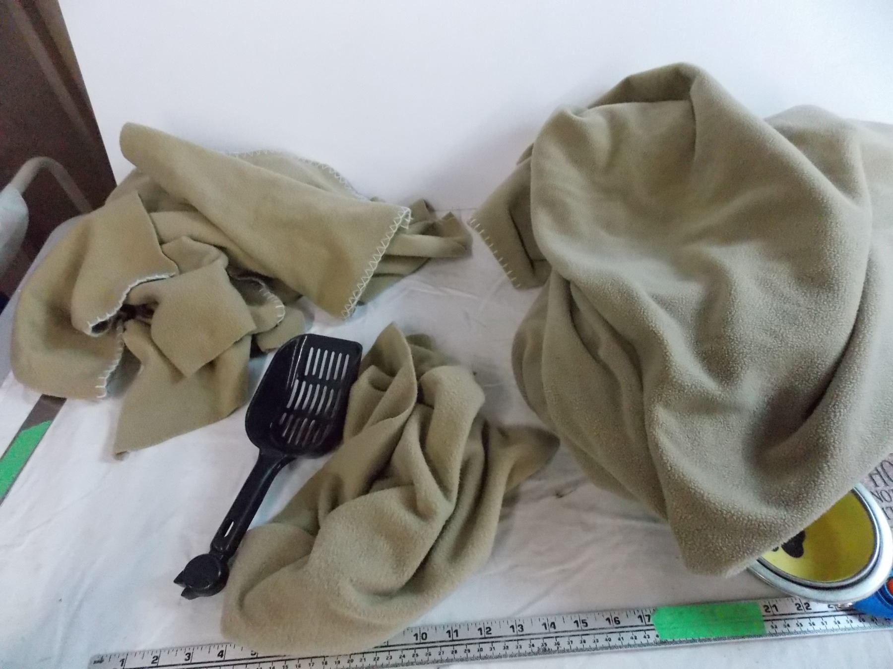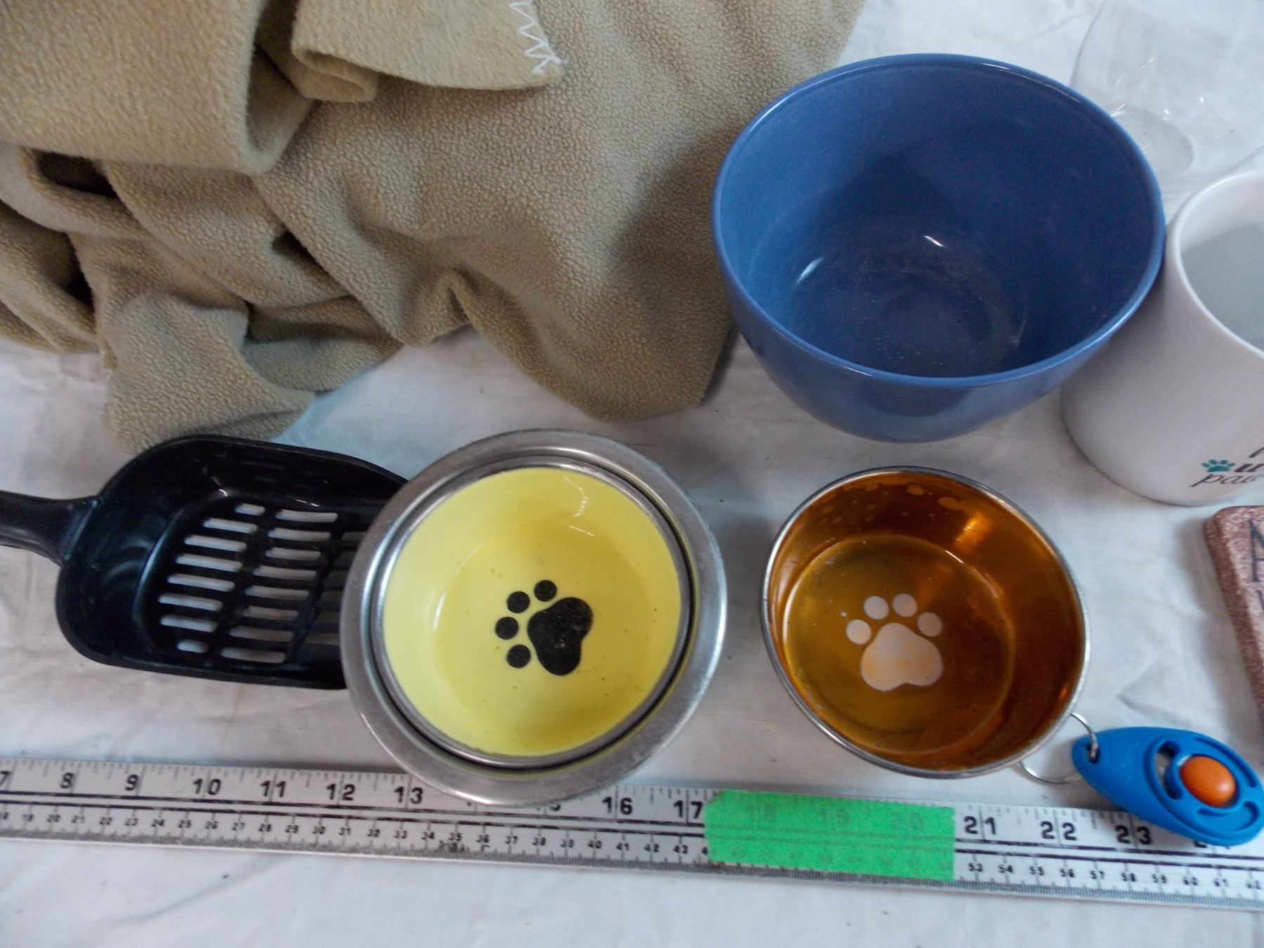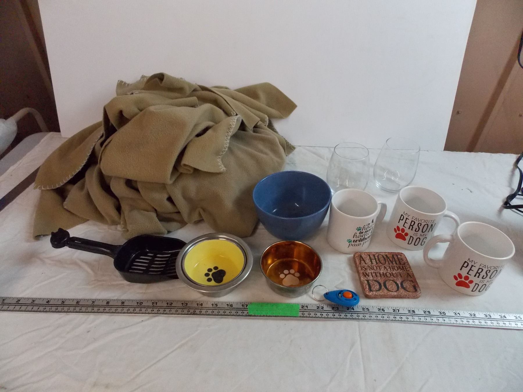 Dog related coffee mugs, coaster, clicker, food/water dishes, litter scooper, 6 pieces of small fabric blanket