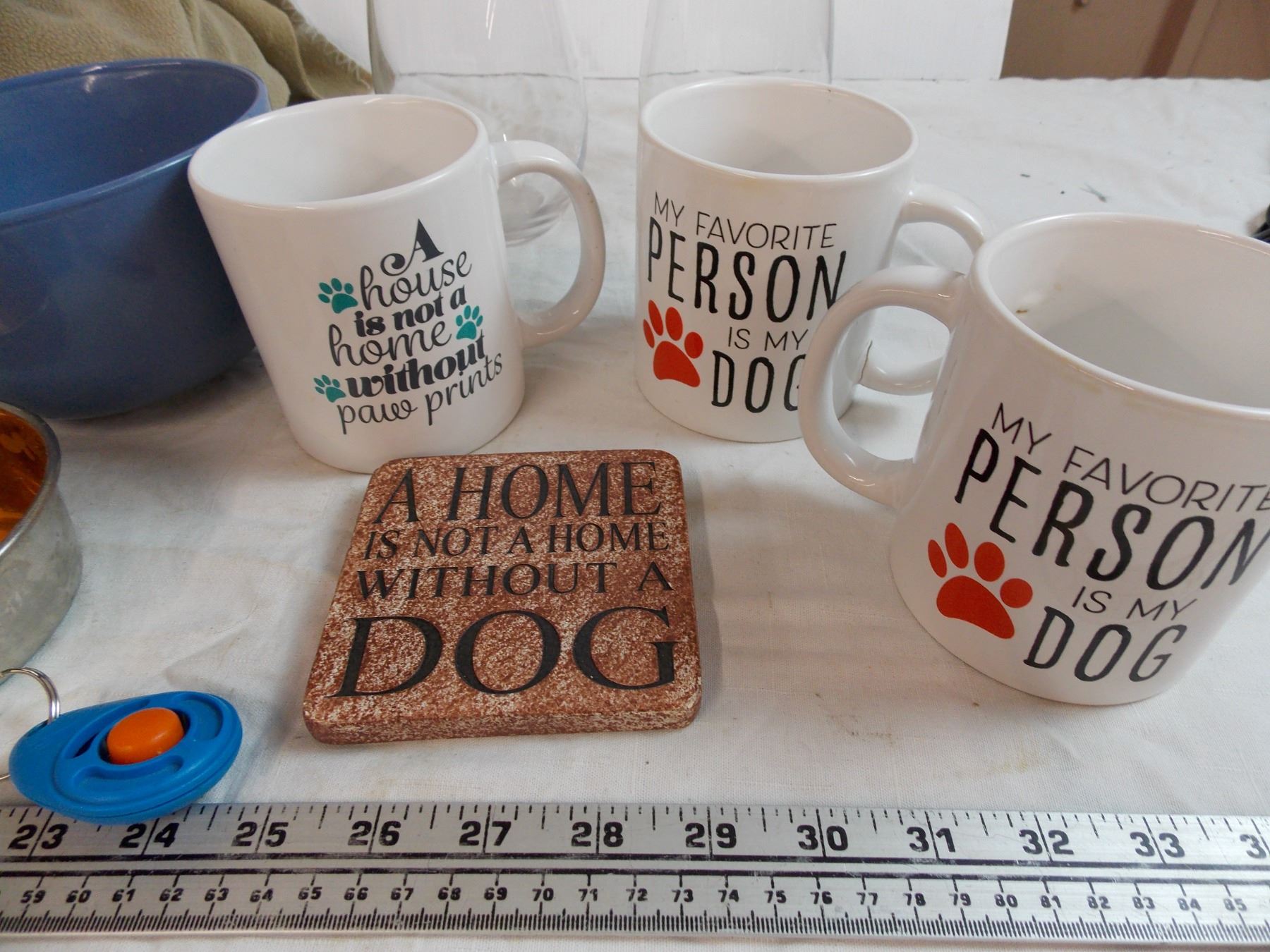Dog related coffee mugs, coaster, clicker, food/water dishes, litter scooper, 6 pieces of small fabr