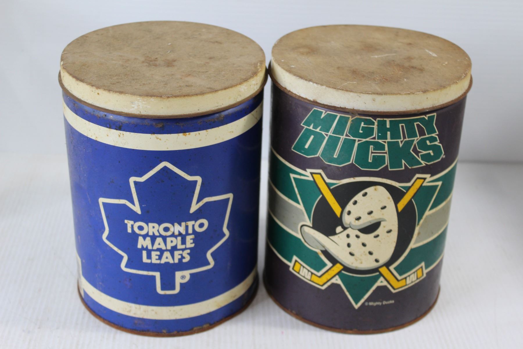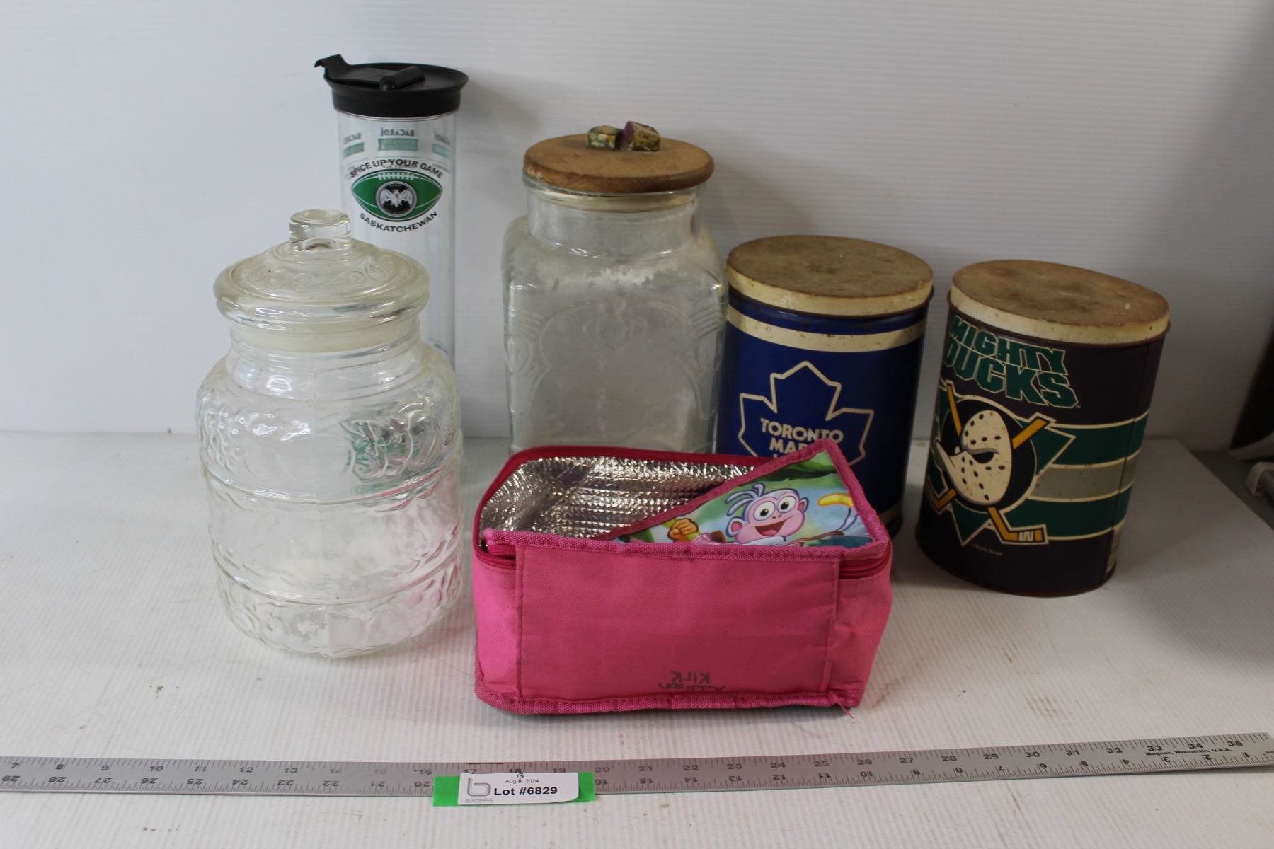 Dora Lunch Kit, (2) Hockey Metal Tins - Mighty Ducks, Toronto Maple Leafs, (2) Glass Jars, Big Bacardi Alcohol Cup