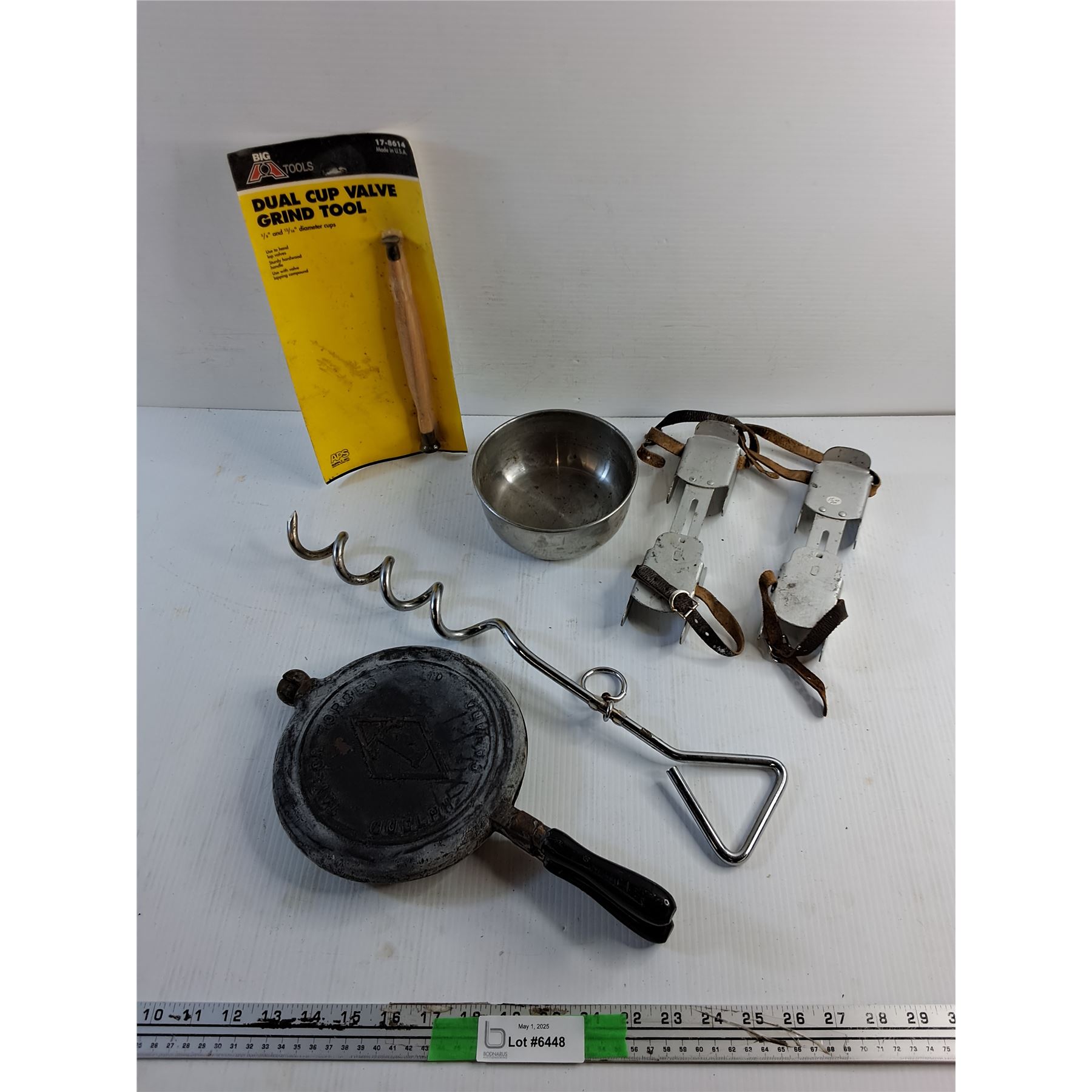 Dual Cup Valve Grind Tool, Metal Bowl, Vintage Skates and Cast Iron Waffle Pan
