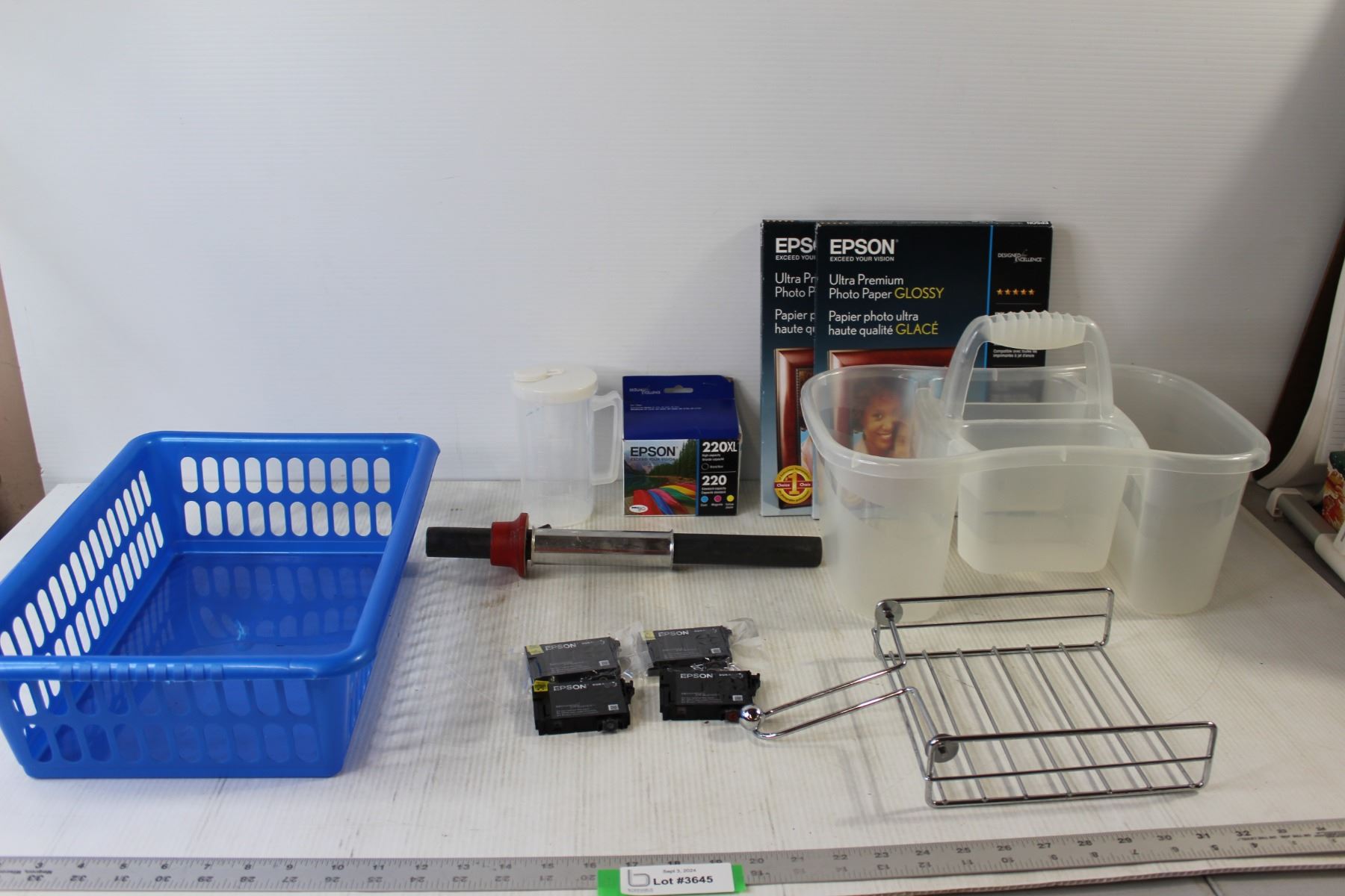 Dumbbell, (2) Plastic Containers, (2) Epson Ultra Premium Photo Paper Glossy, Epson 220XL Ink Cartridges, Epson DuraBrite Ultra Ink, Misc.