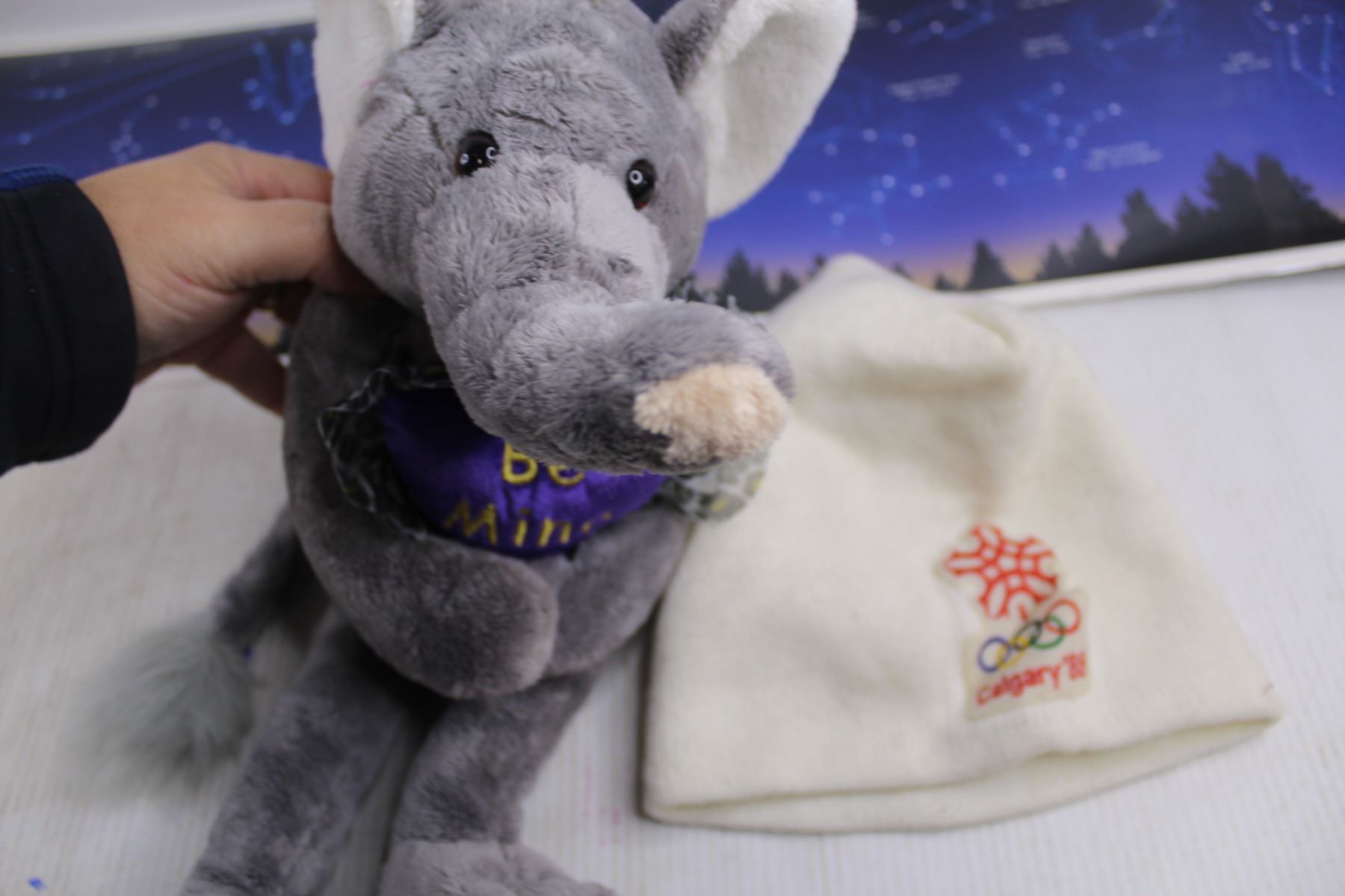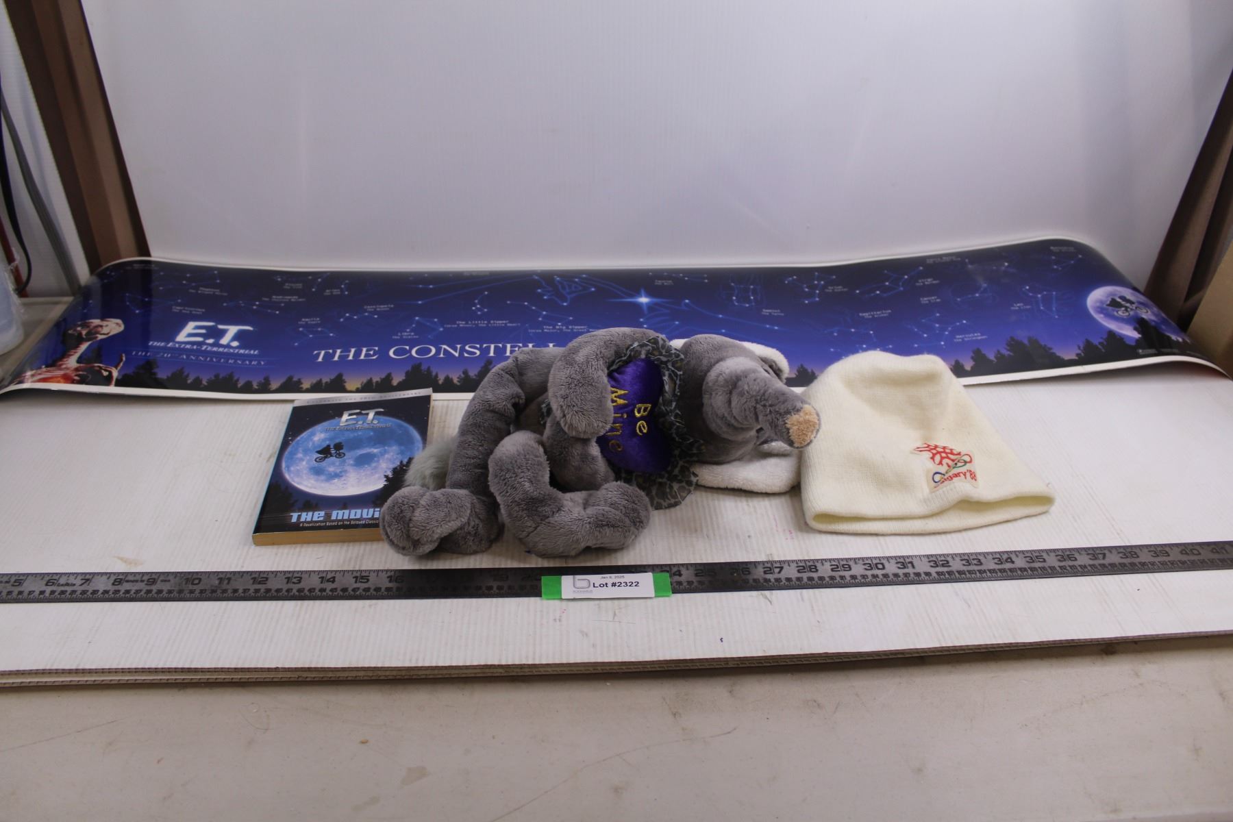 E.T. Double-Sided Wall Poster 51" x 11", E.T. Book, "Be Mine" Stuffed Elephant, Calgary 88 Olympics Toque