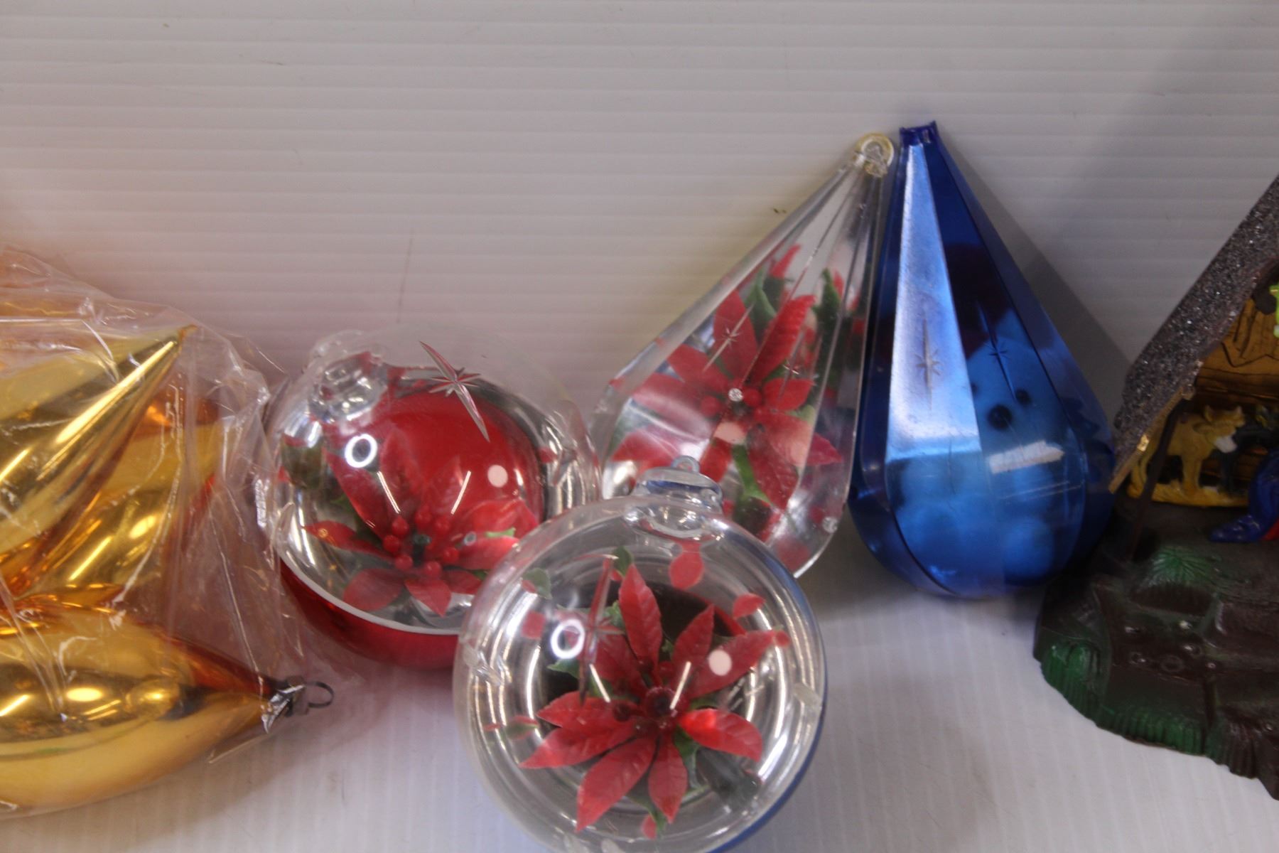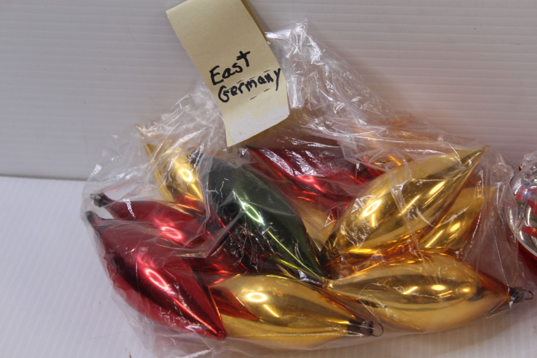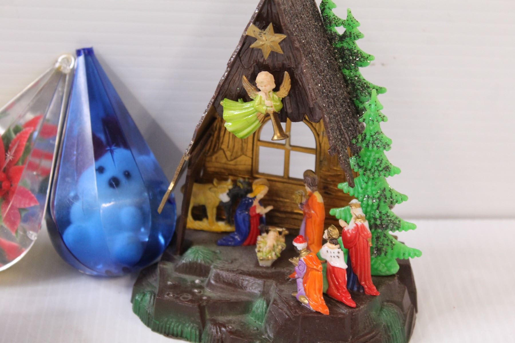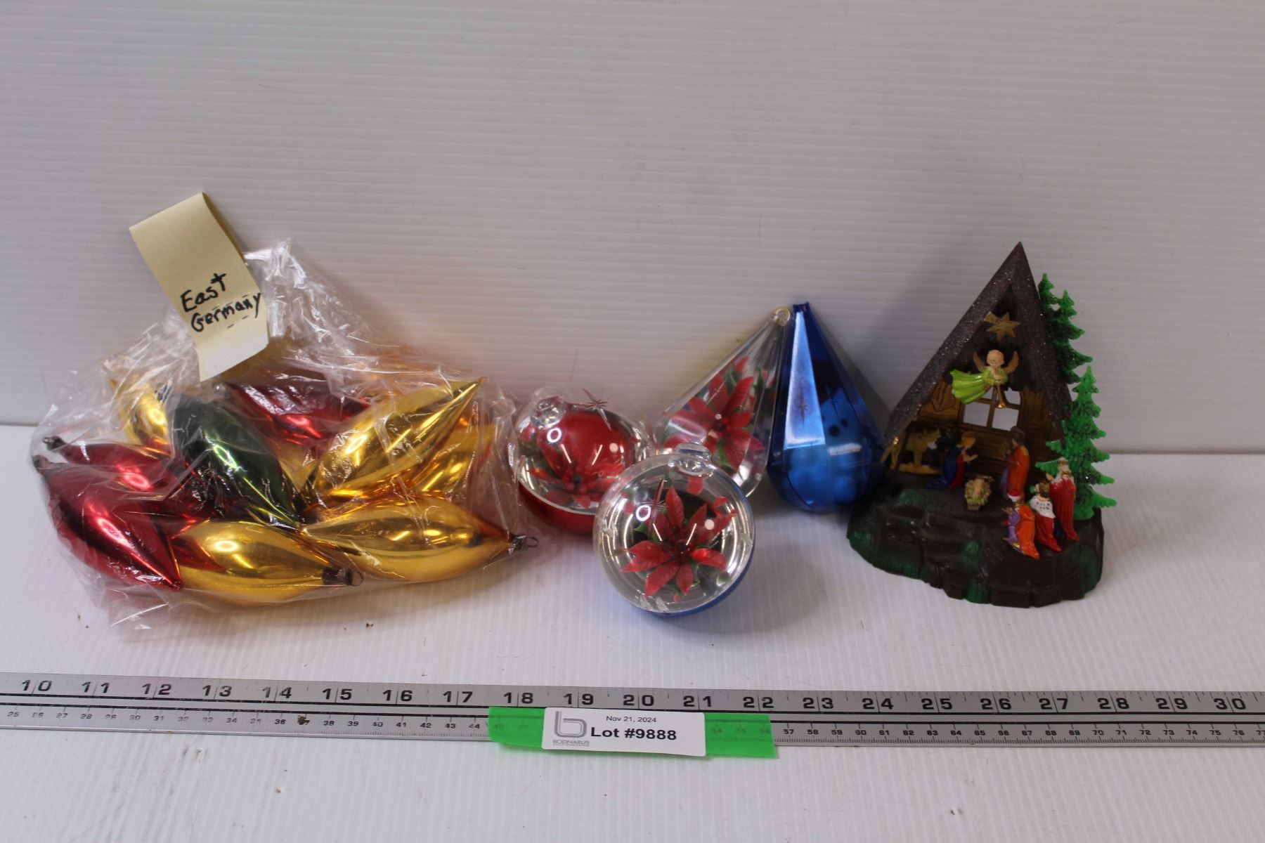 East Germany Glass Drop Ornaments, Vintage Nativity Scene & Poinsettia Ornaments - as is