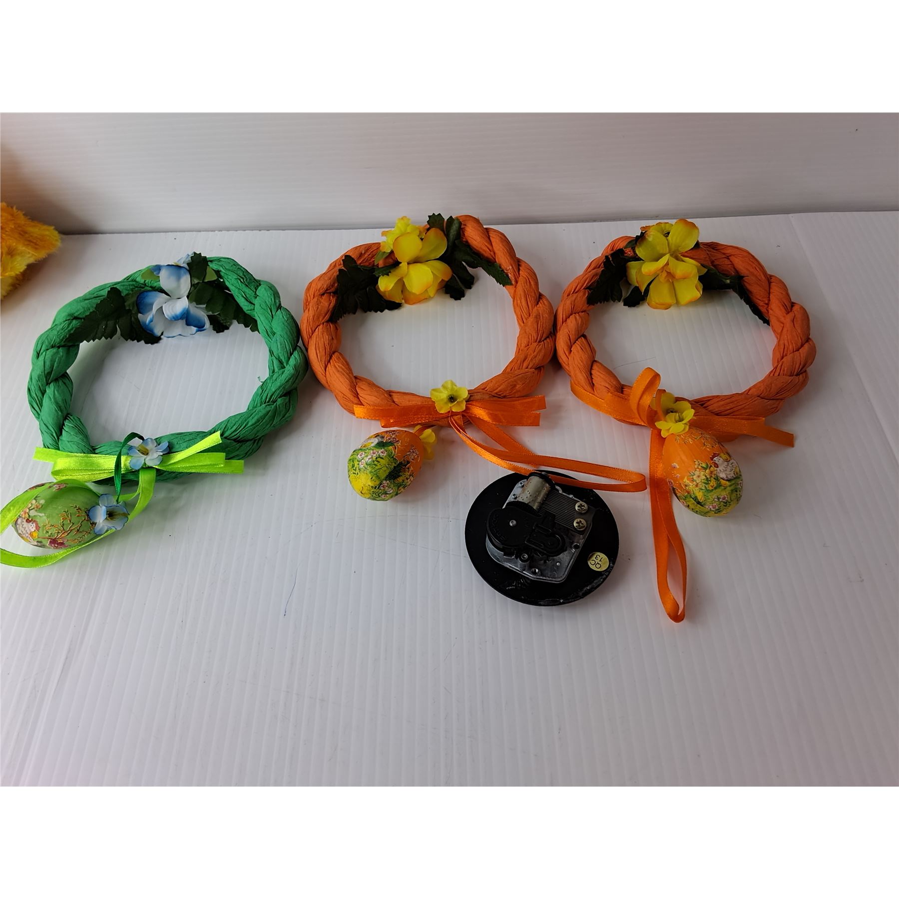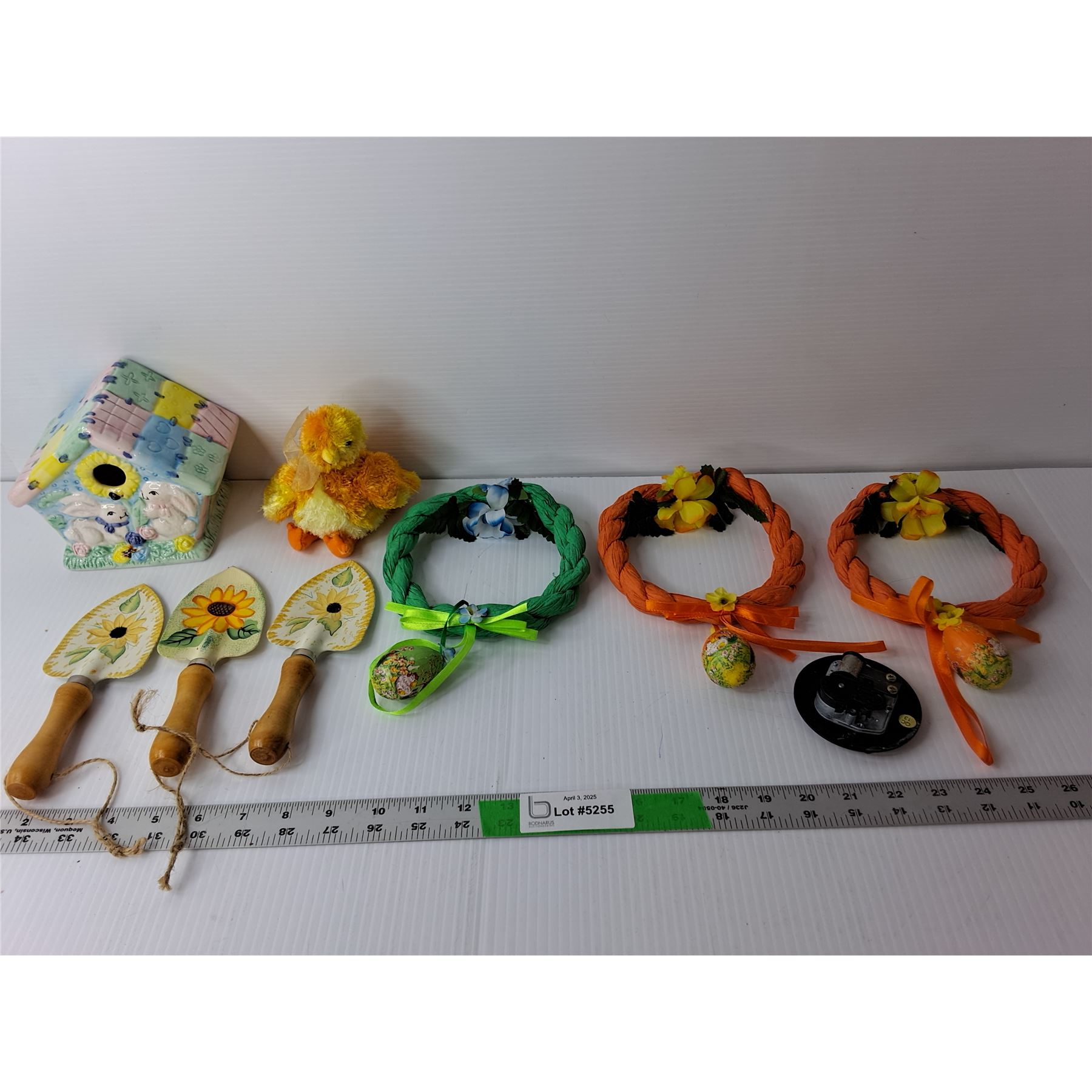 Easter Lot- (3) Mini Wreaths, Porcelain Bird House, Decorative Mini Shovels, Misc.