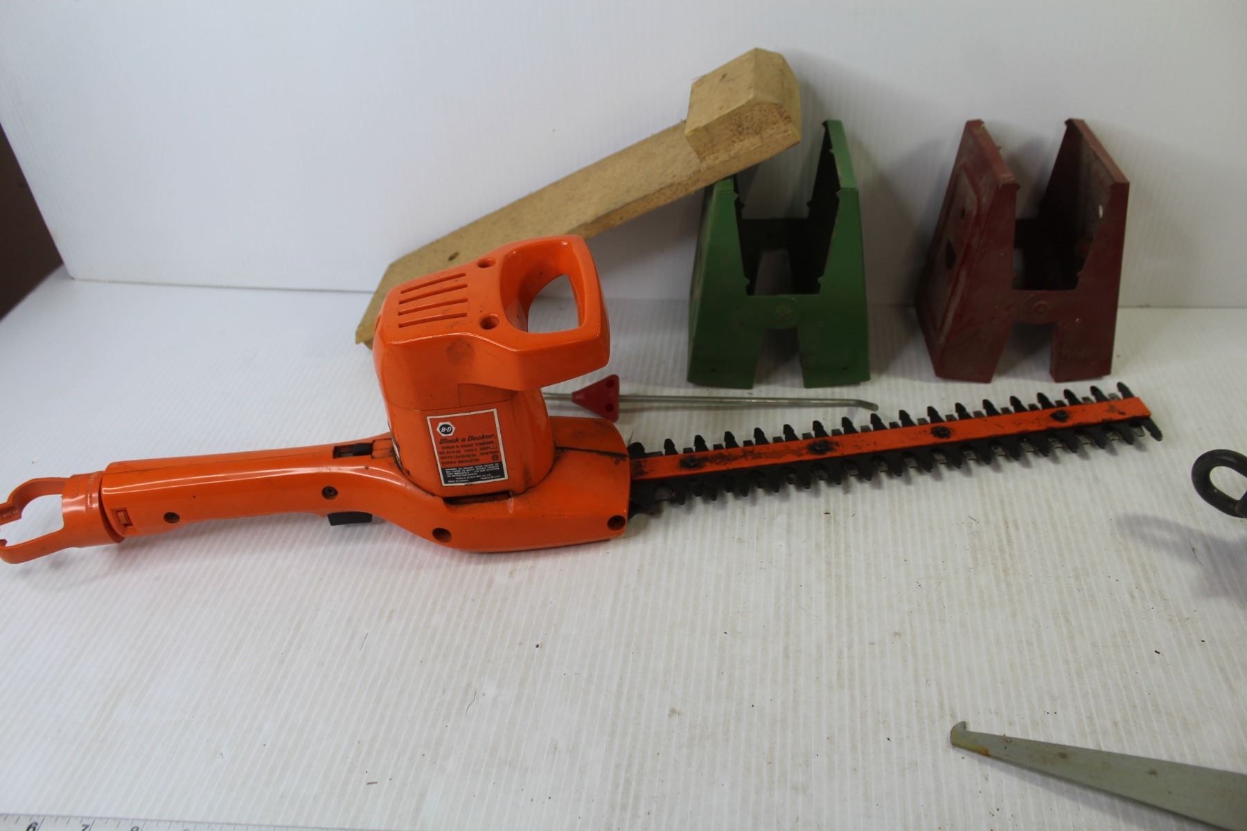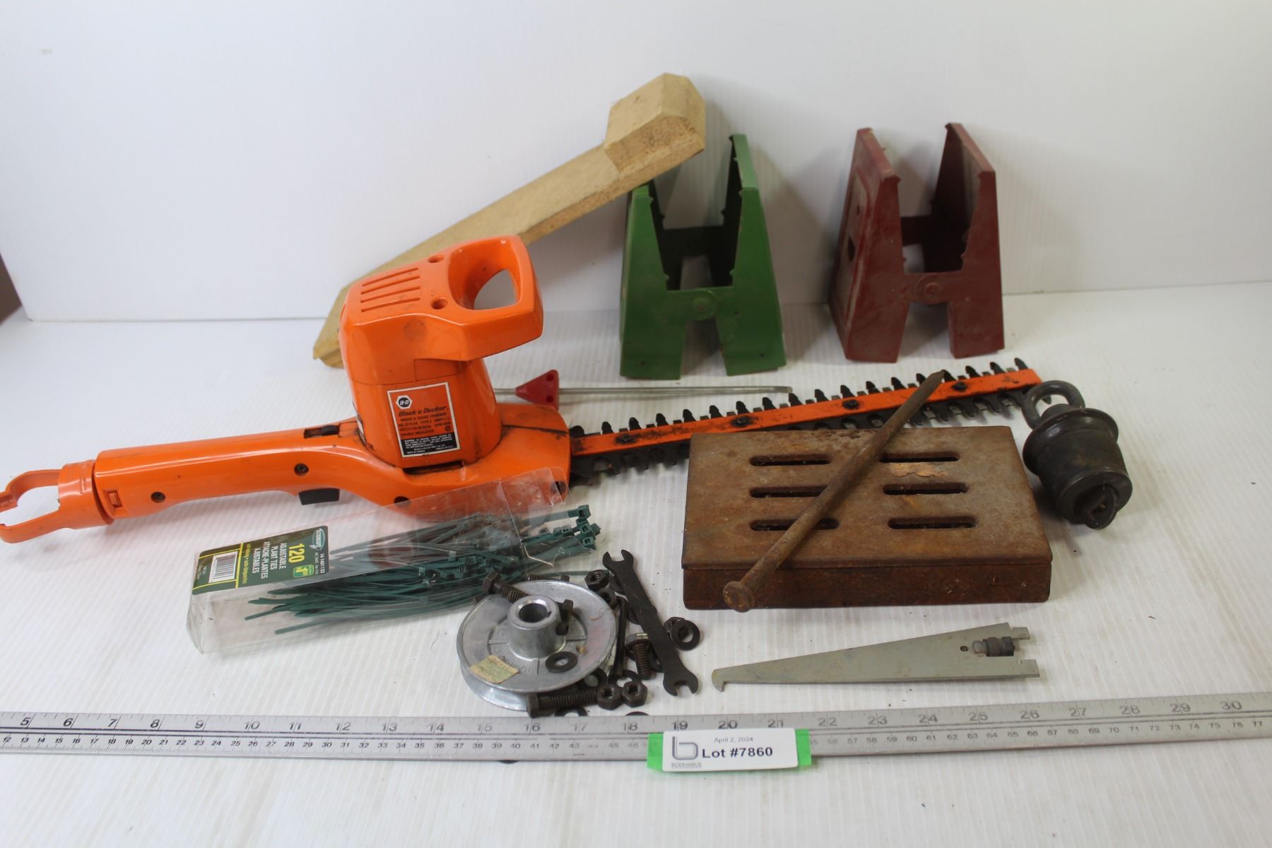 Electric Hedge Trimmer (untested) - Saw Horse End Clamps - Plant Ties - Misc. Items