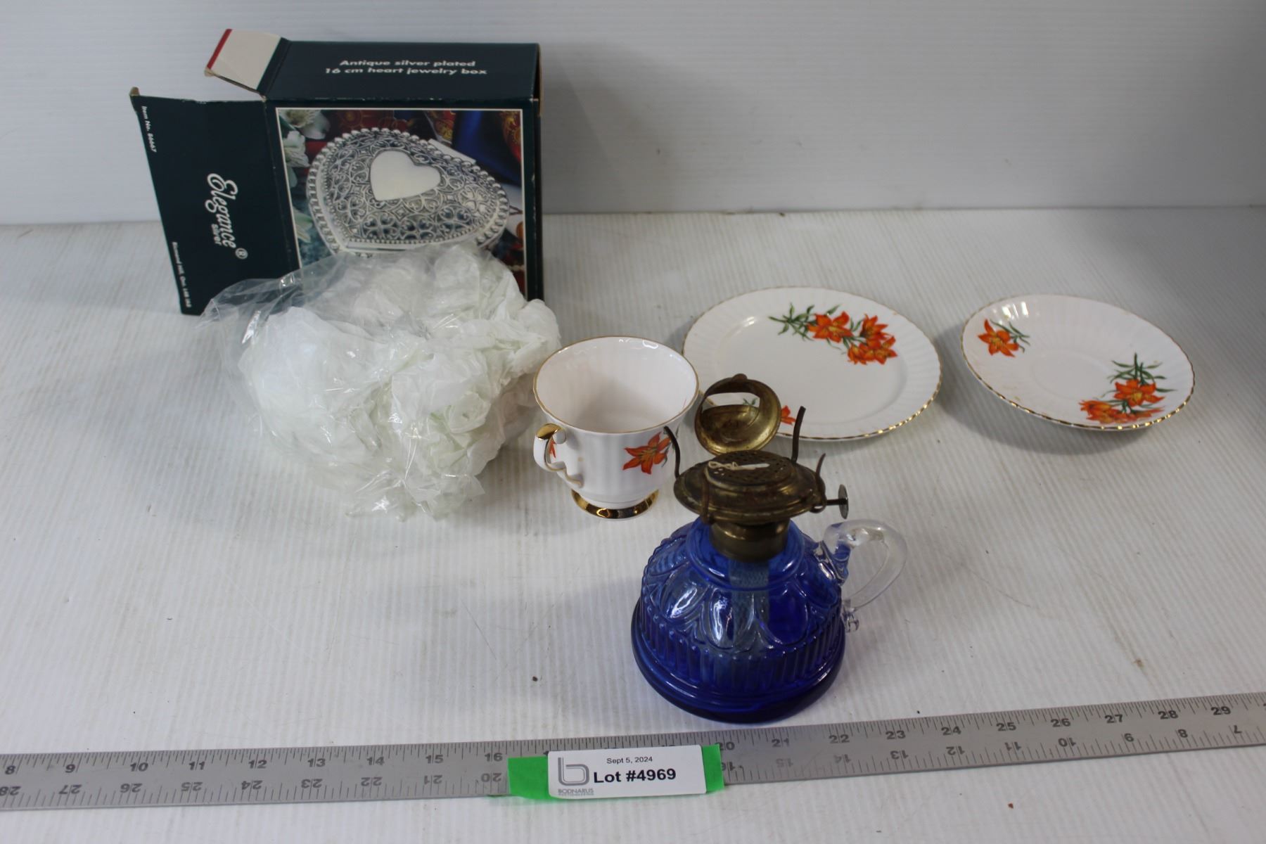 Elegance Silver Antique Silver Plated 16 cm heart Jewelry Box, Royal Windsor Prairie Lily Tea Cup and Two Cup Plates/Trays, Blue Glass Kerosene Lamp