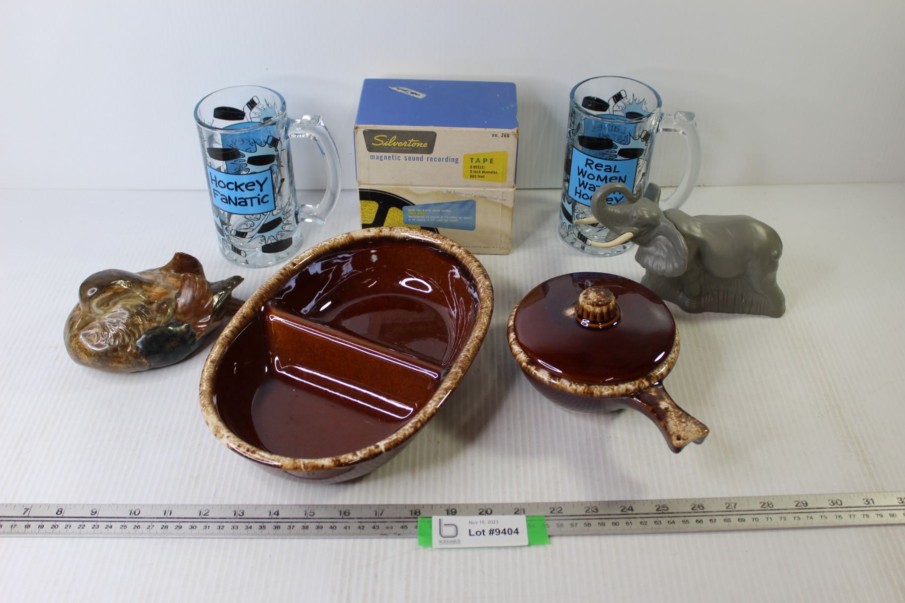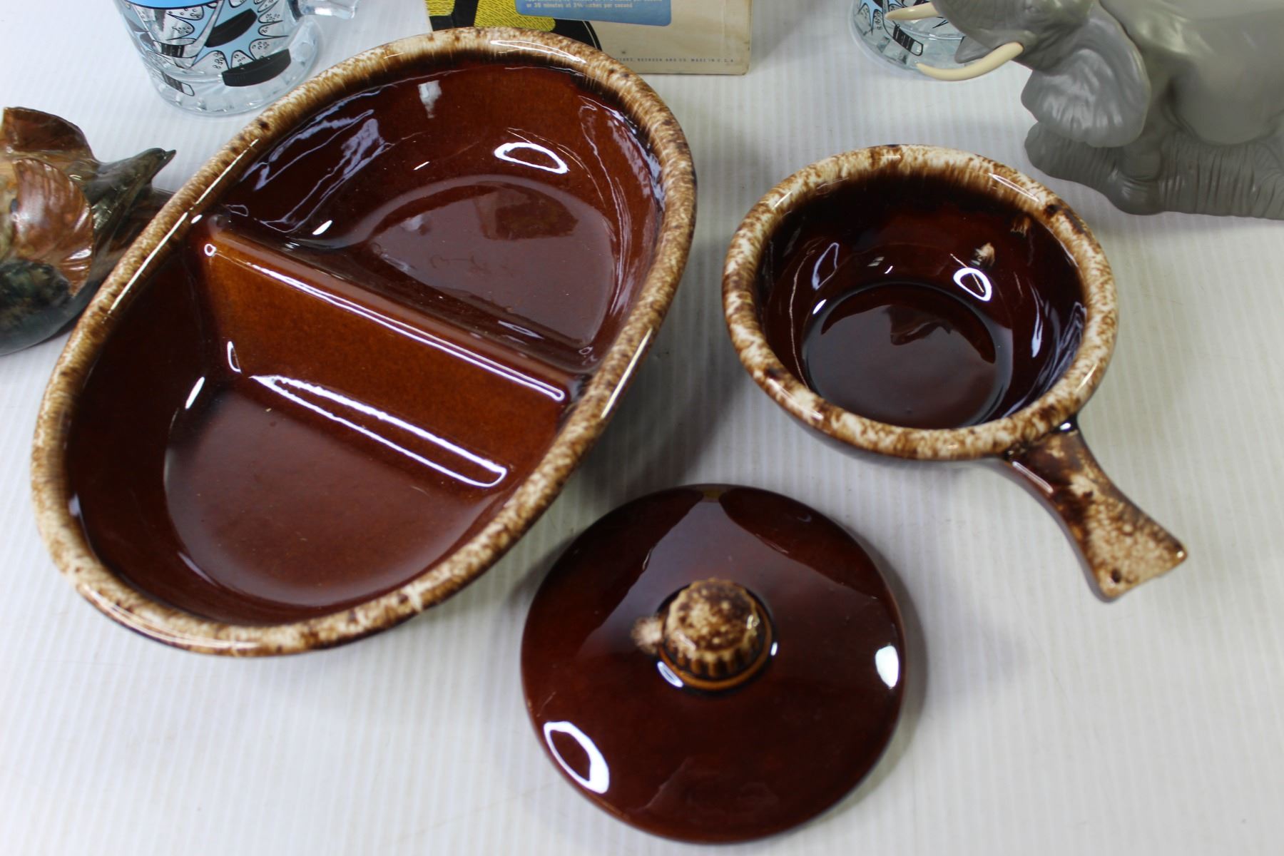 Elephant Avon Perfume - Ceramic Bird - (2) Hockey Glasses - Silvertone sound recording tapes - Oven Proof Dishes