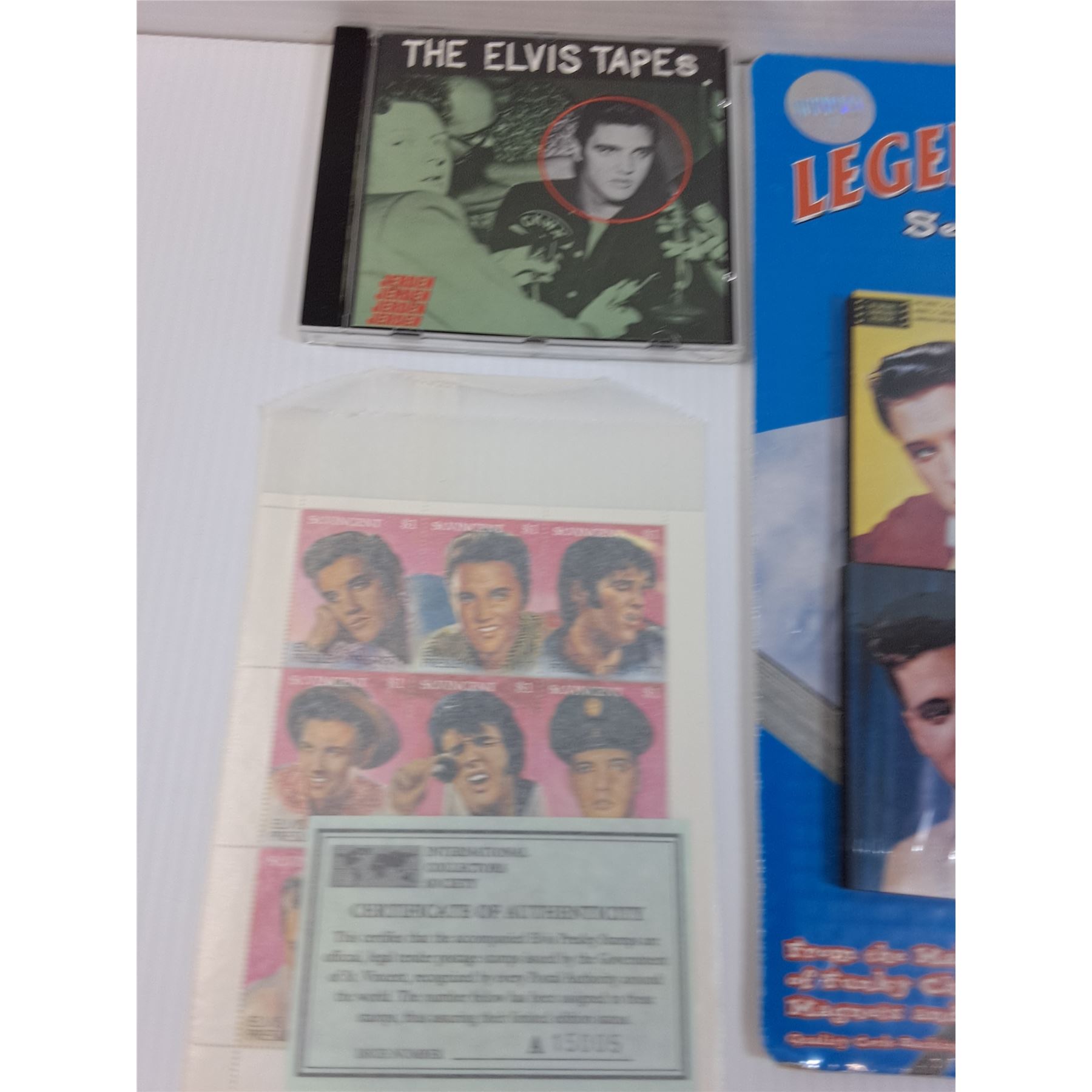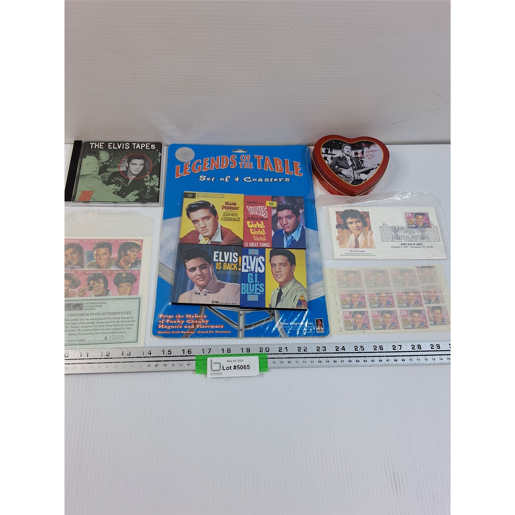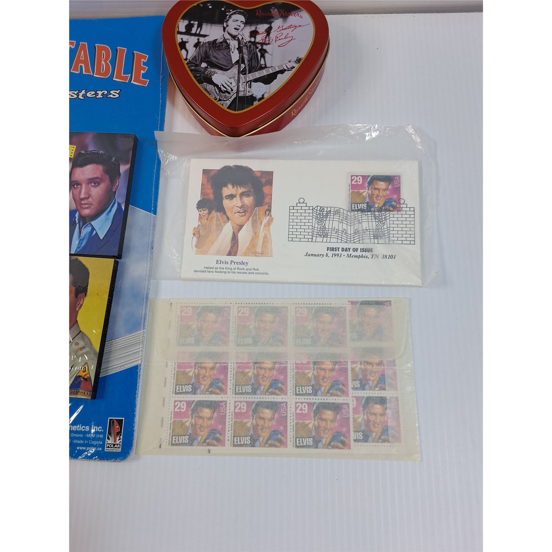 Elvis Presley Lot: Coasters, DVD, Stamps, Tin, Misc